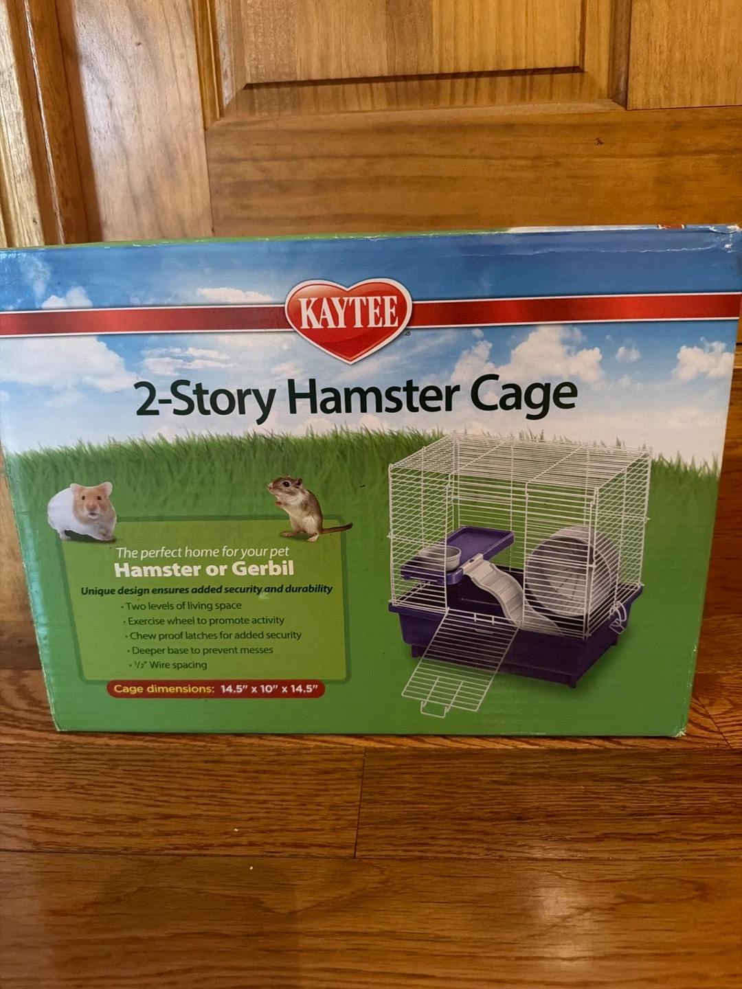 This is a Kaytee 2-story hamster cage, perfect for your pet hamster or gerbil. It has two levels of living space, an exercise wheel, and chew-proof latches. The cage dimensions are 14.5" x 10" x 14.5" with 1/2" wire spacing.