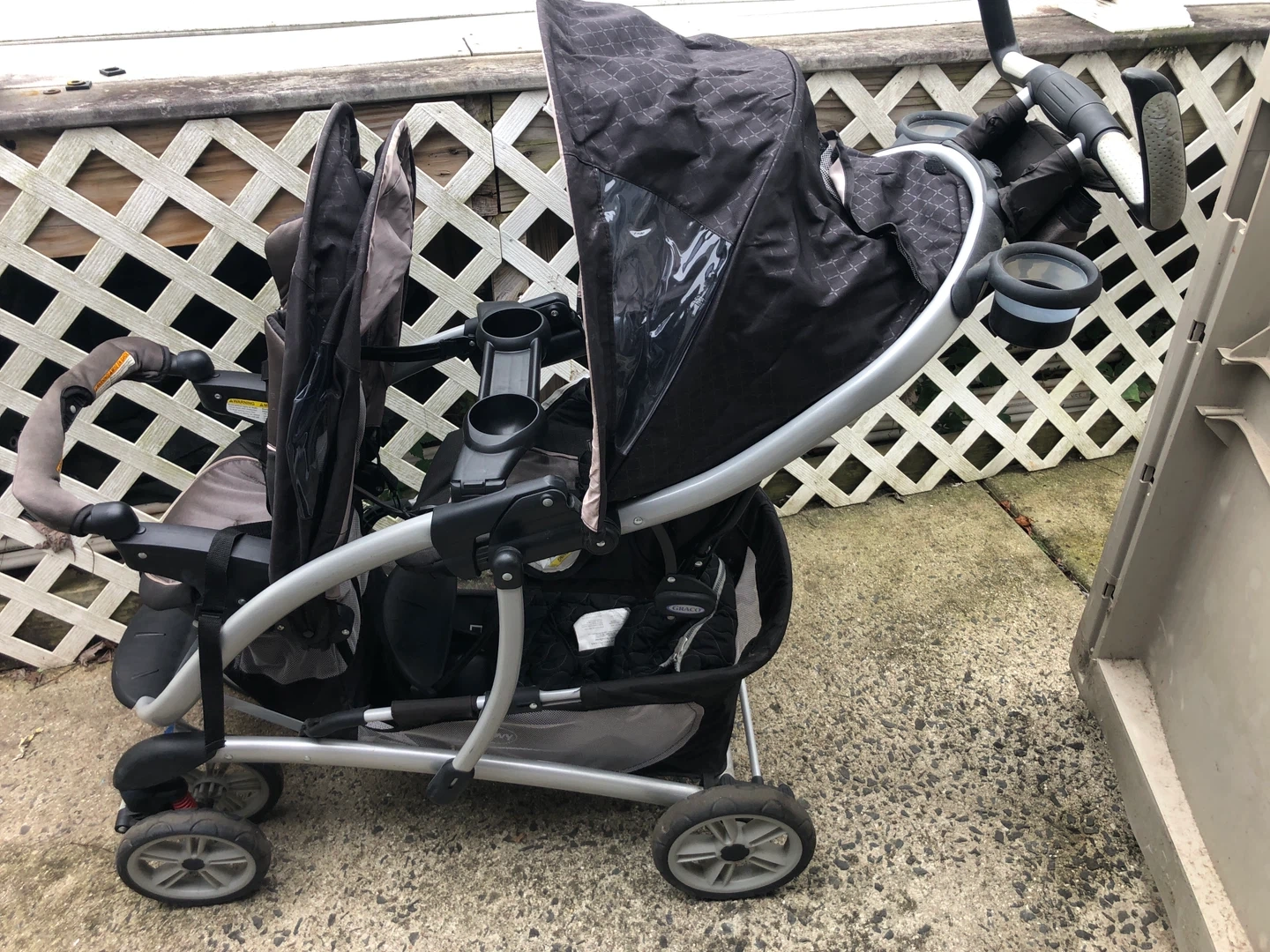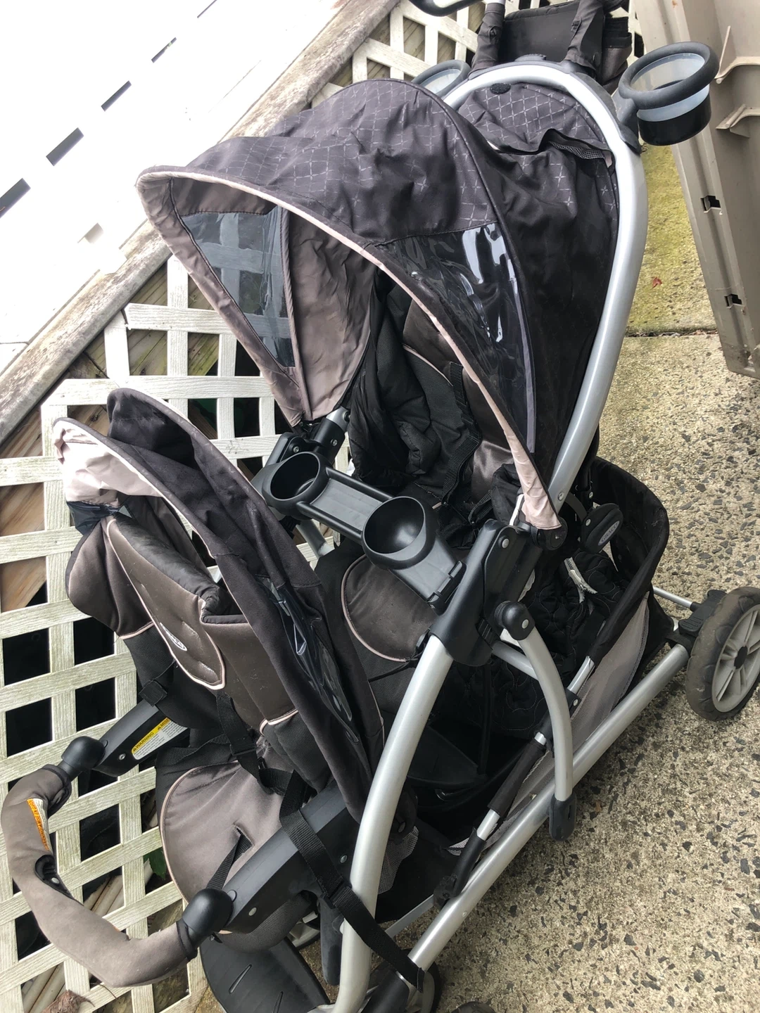 I'm selling a Graco DuoGlider double stroller! It's perfect for families with two little ones. It features stadium-style seating so both kids can enjoy the view. It has a sturdy frame and is easy to maneuver. There are also convenient cup holders for both parents and children!