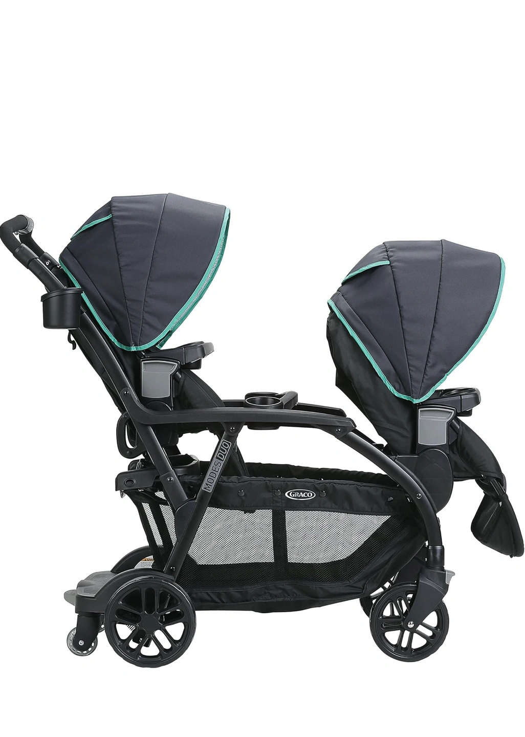The most versatile double stroller! With 27 riding options, from infant to youth, you can configure this stroller for the best fit for your growing family. The Graco Modes Duo Stroller accepts Two Graco Click Connect Infant Car Seats, connecting with a secure one-step attachment. It has a standing platform and bench seat for your older child, and two reclining, removable seats that allow for stroller customization. Convenience and comfort features include locking front swivel wheels for increased maneuverability, extra platform wheels, one-handed standing fold, and pivoting child's arm bar with cupholders. The Graco Modes Duo Stroller helps you get the most out of every ride!