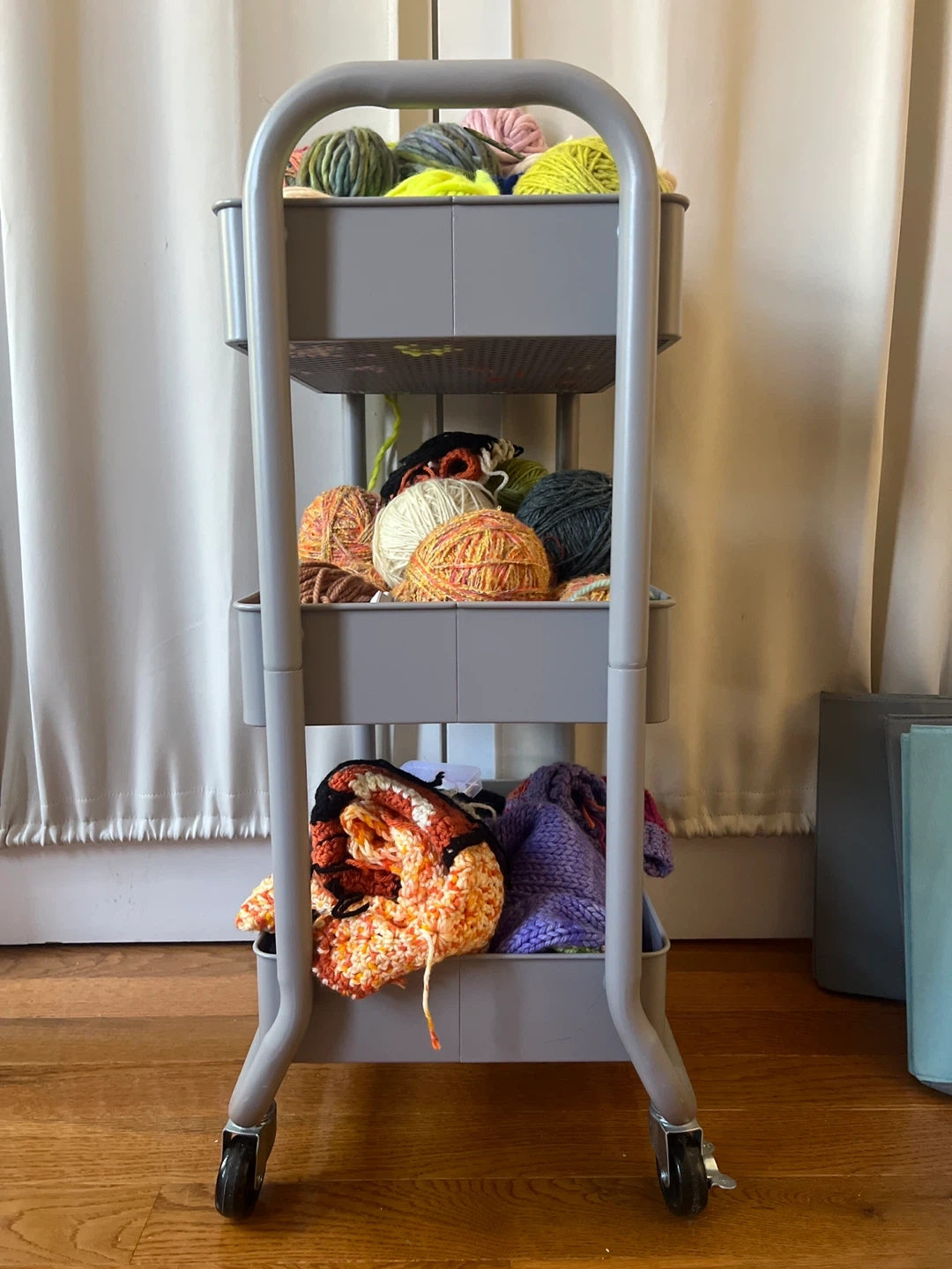 I'm selling a gray 3-tier rolling cart! It's in great shape and ready to help you organize your space. Perfect for storing craft supplies, kitchen items, bathroom storage, or anything else you need to keep tidy! (Yarn and knitted/crocheted goodies NOT included, sorry! ❤️🩹)