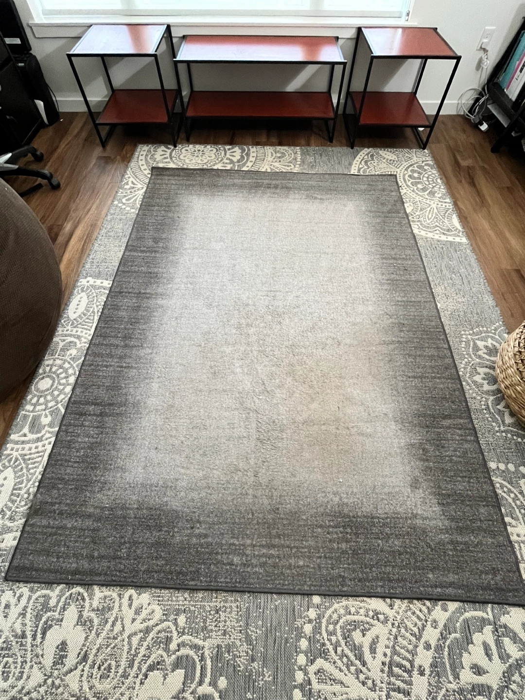 65Grey 5x7 Area Rug with darker grey border and lighter grey middle. Previously used sed exclusively for a work from home office. Recently moved and the rug does not fit in my new place. Note that the rug is not patterned. Full rug is pictured and placed on top of another, larger, patterned grey rug.