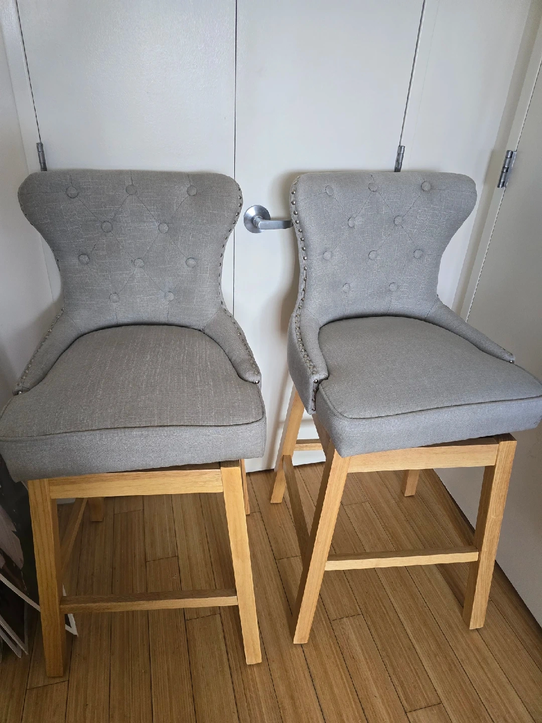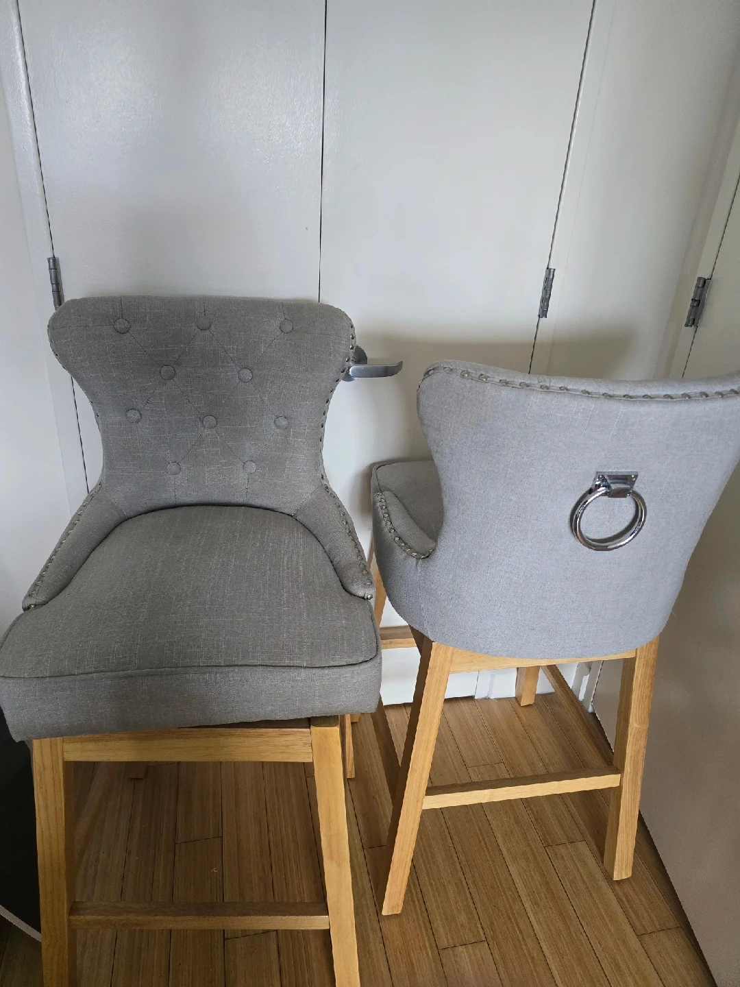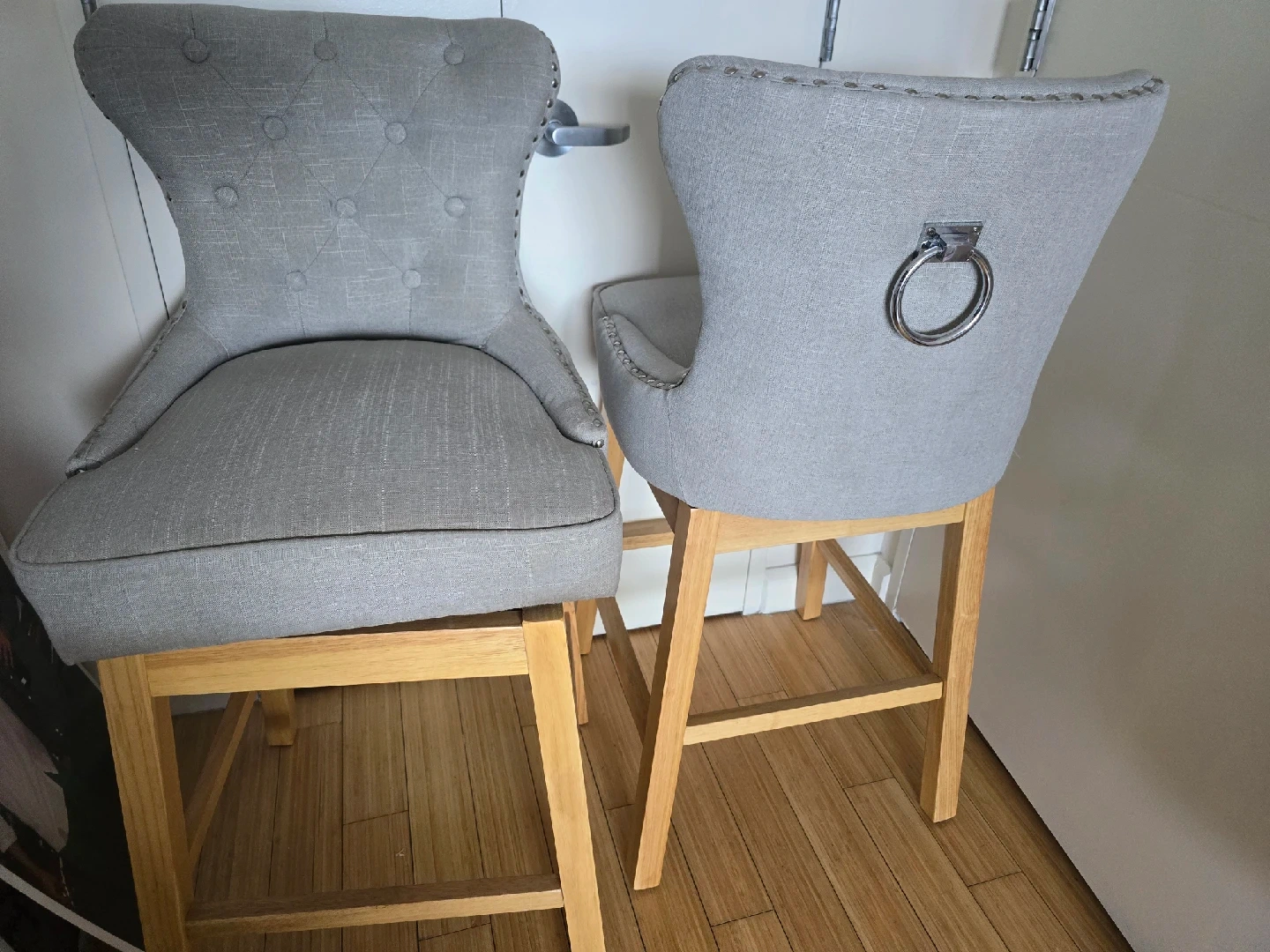 15Selling a set of two gray bar stools! They have a stylish design with a tufted back on one and a ring detail on the other. Perfect for adding a touch of elegance to your kitchen or bar area