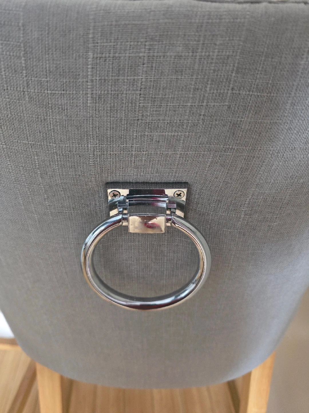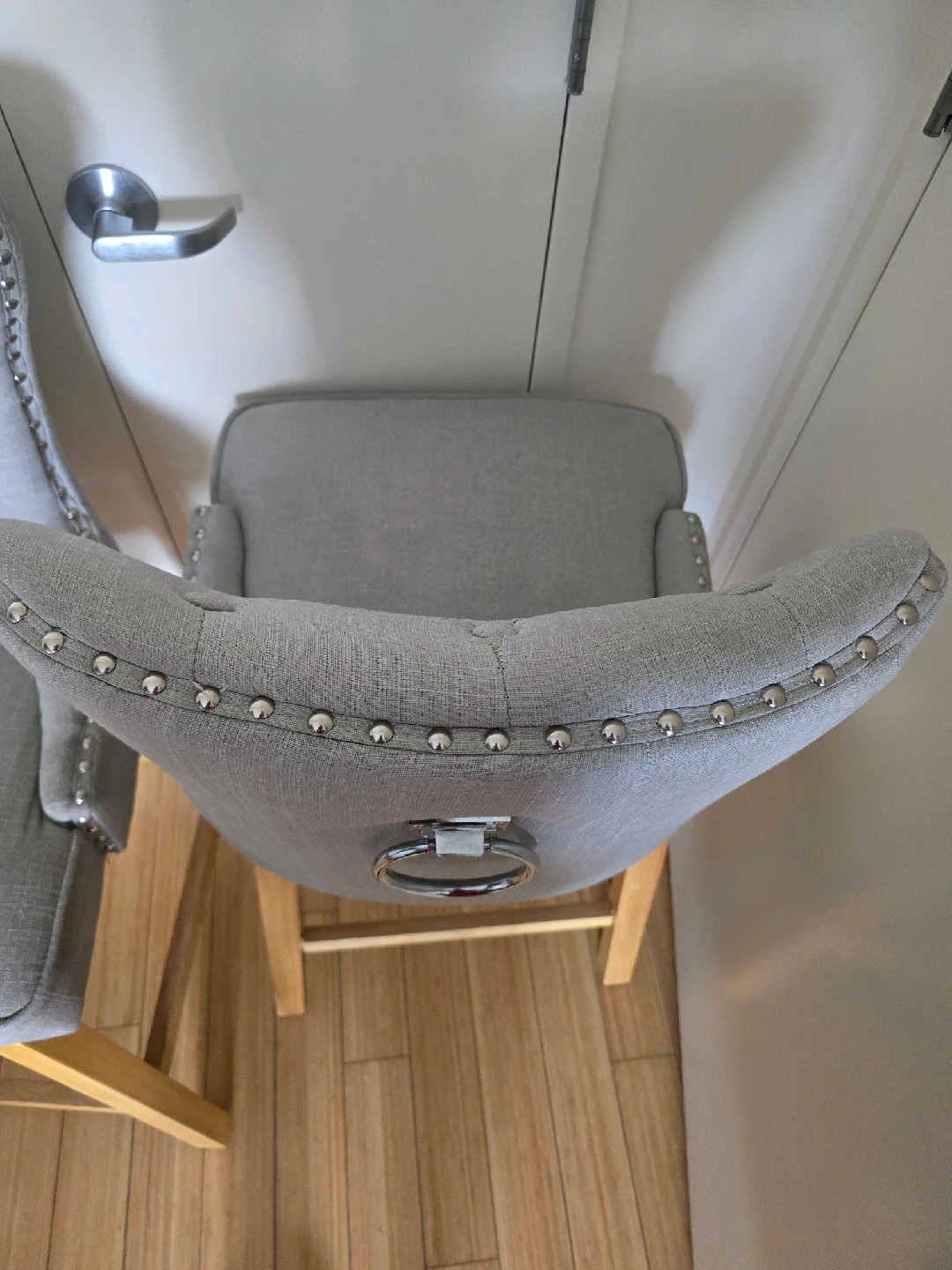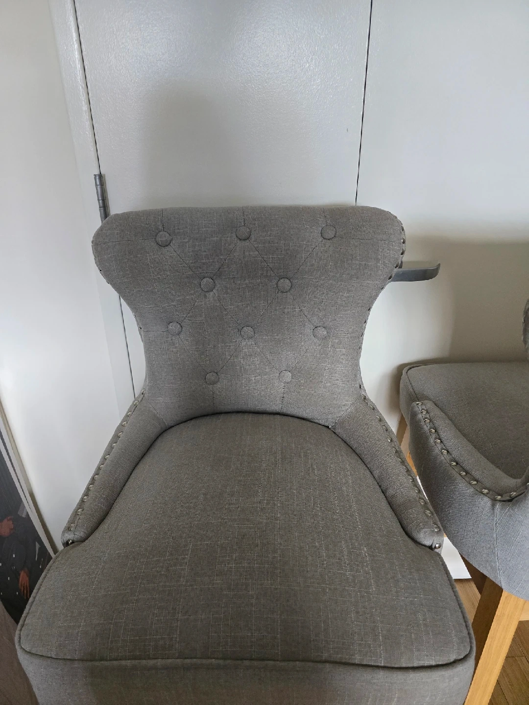 15Selling a set of two gray bar stools! They have a stylish design with a tufted back on one and a ring detail on the other. Perfect for adding a touch of elegance to your kitchen or bar area