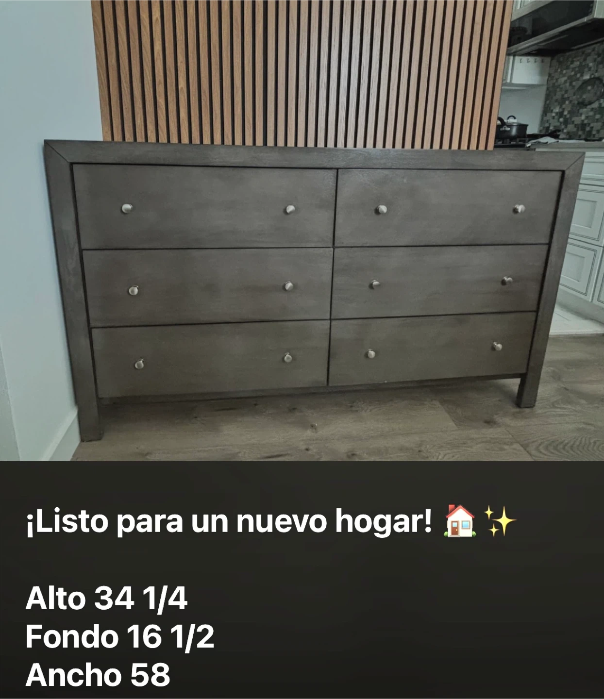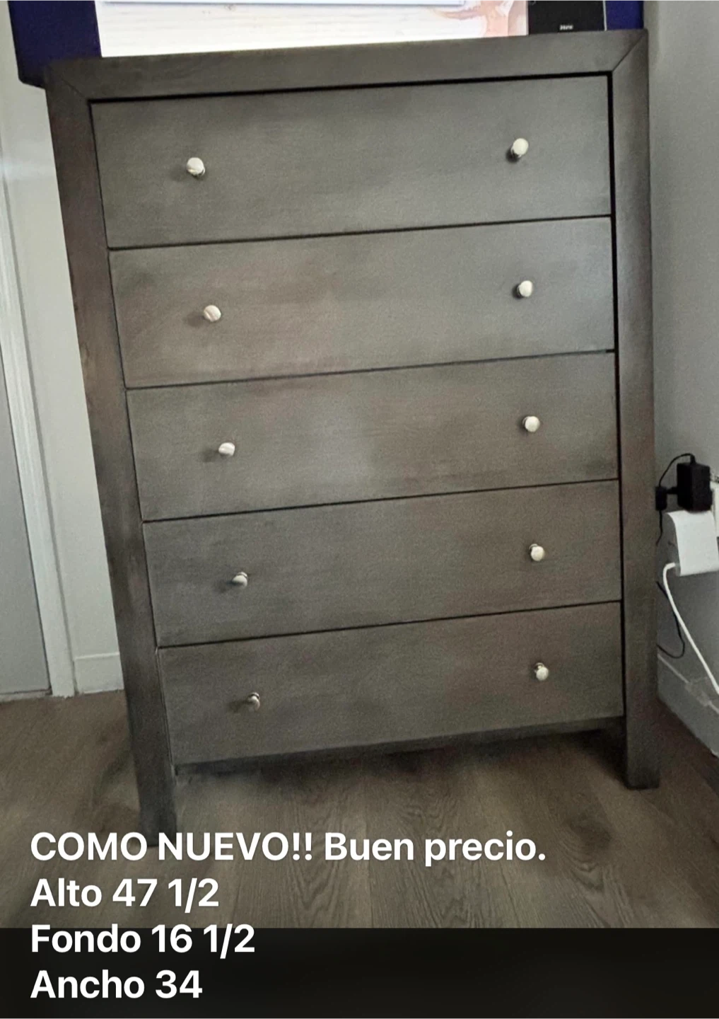 65I'm selling two grey dressers, one with 6 drawers and the other with 5. It's in perfect condition and ready to use! The dimensions are: - Height: 34 1/4 inches - Depth: 16 1/2 inches - Width: 58 inches The dimensions are: - Height: 47 1/4 inches - Depth: 16 1/2 inches - Width: 34 inches