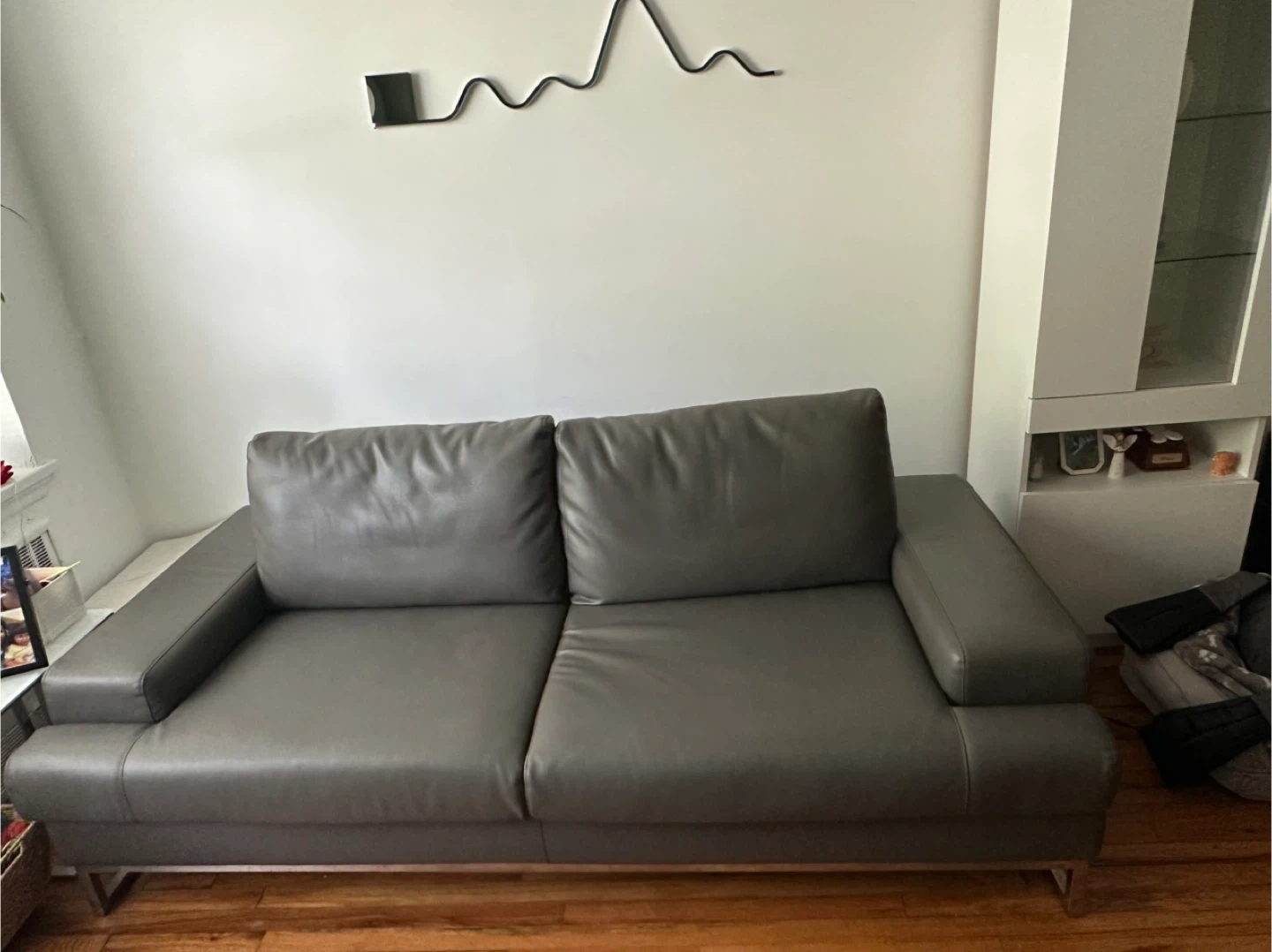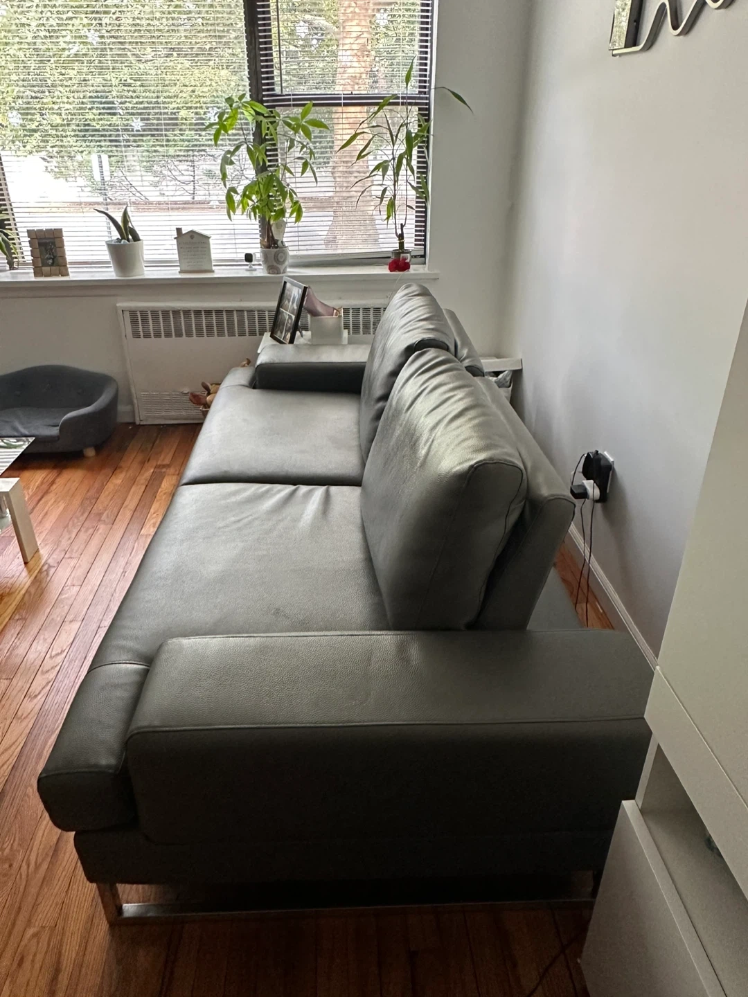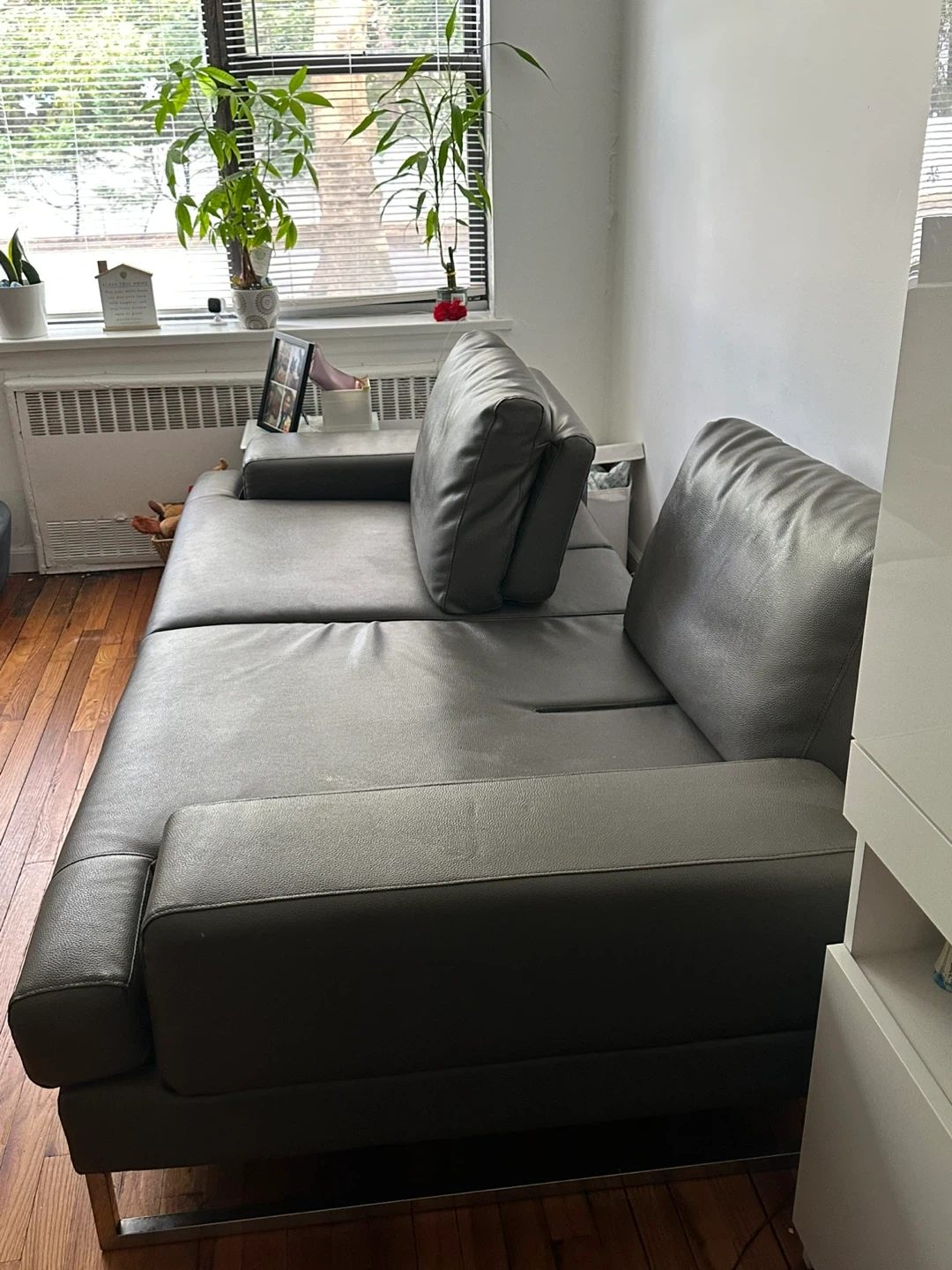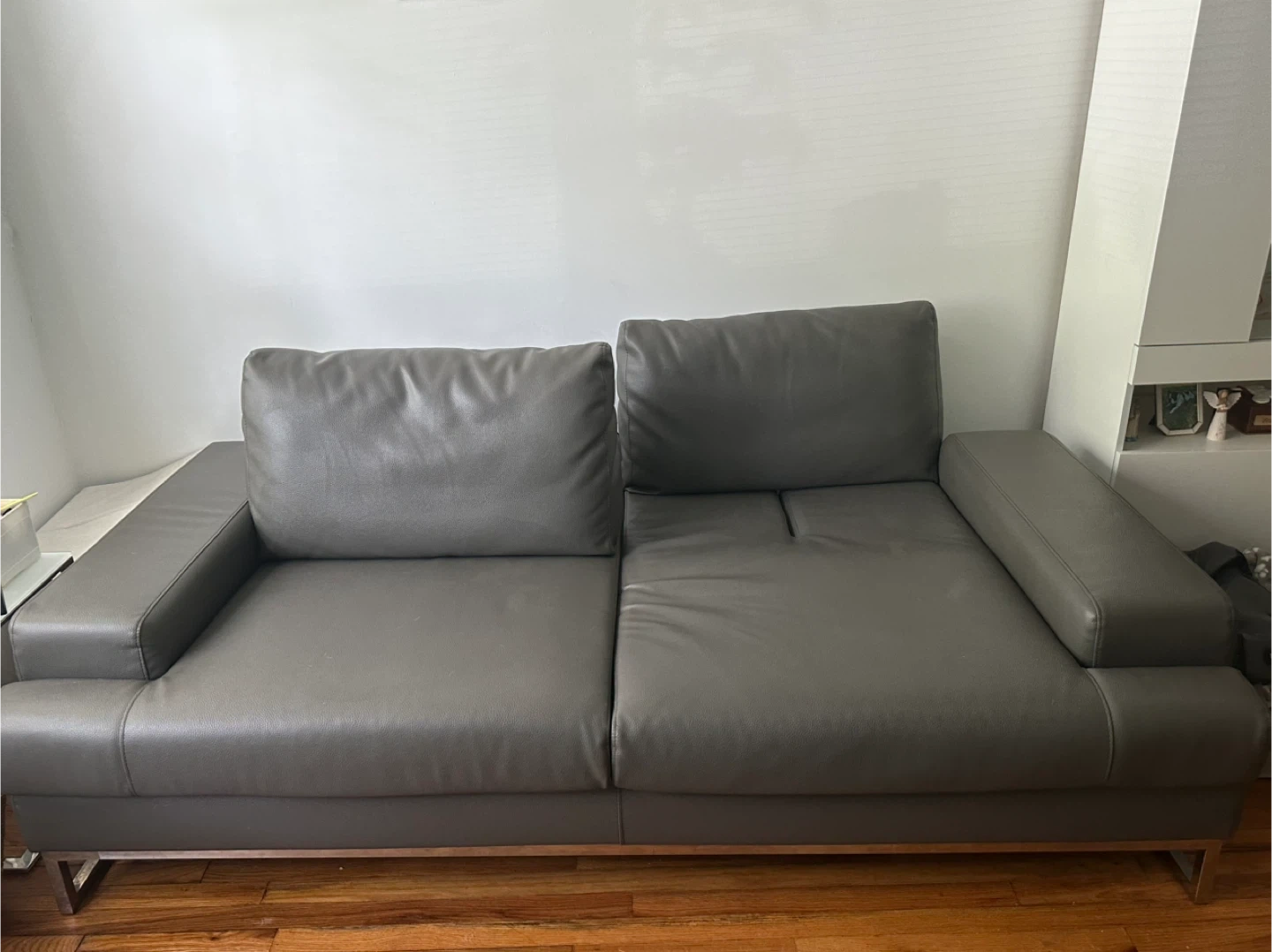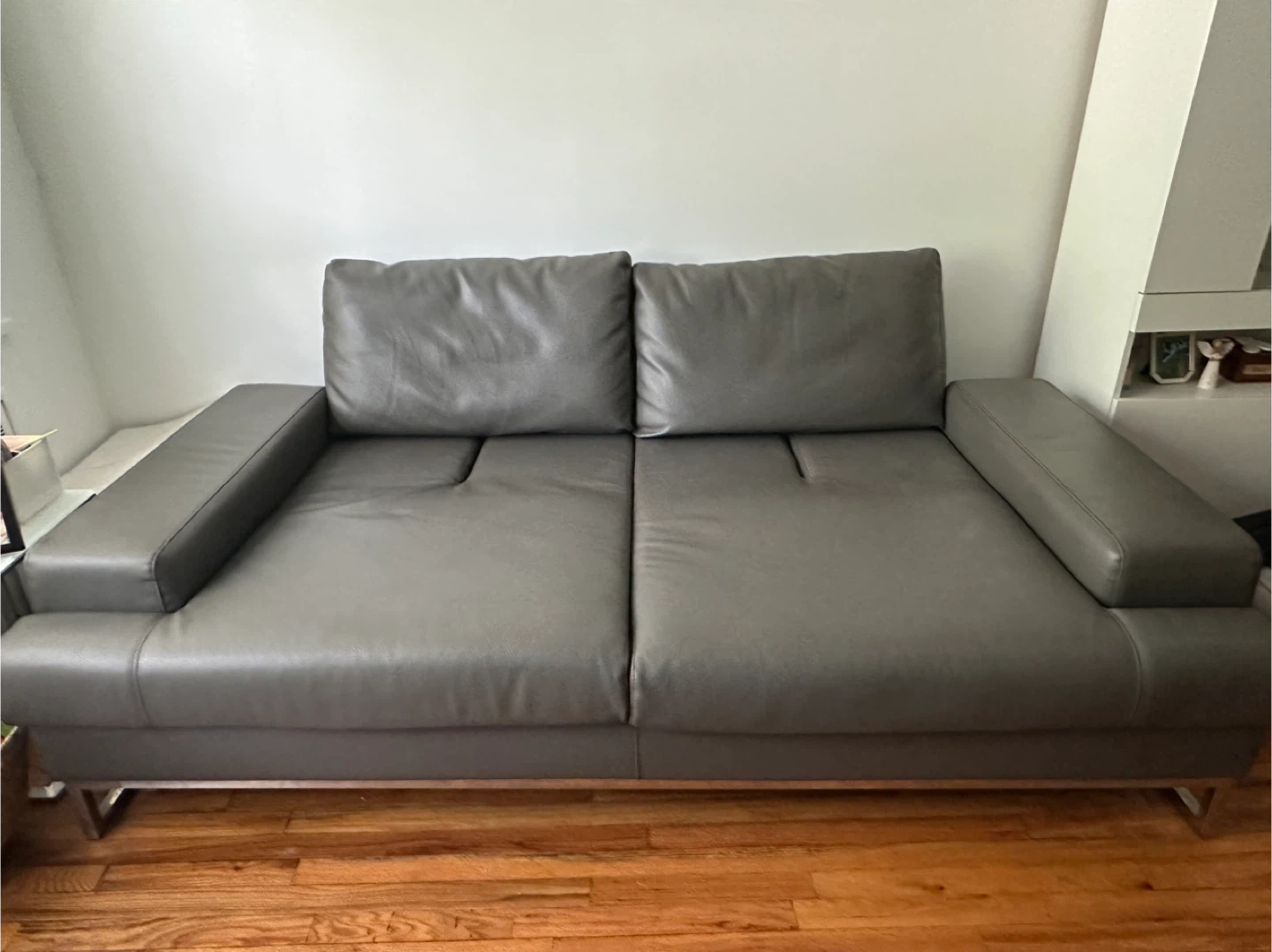 Sleek and contemporary gray leather sofa with chrome legs. • Dimensions: 80” length • Condition: Gently used, comfortable, with firm cushions and stylish armrests • Material: Easy-to-clean gray leather • Features: Adjustable backrest with two positions for sitting or lounging • Design: Low-profile modern look, perfect for apartments, living rooms, or offices This sofa is both stylish and functional, offering flexibility with its two-position backrest and plenty of seating space while maintaining a clean, modern aesthetic.