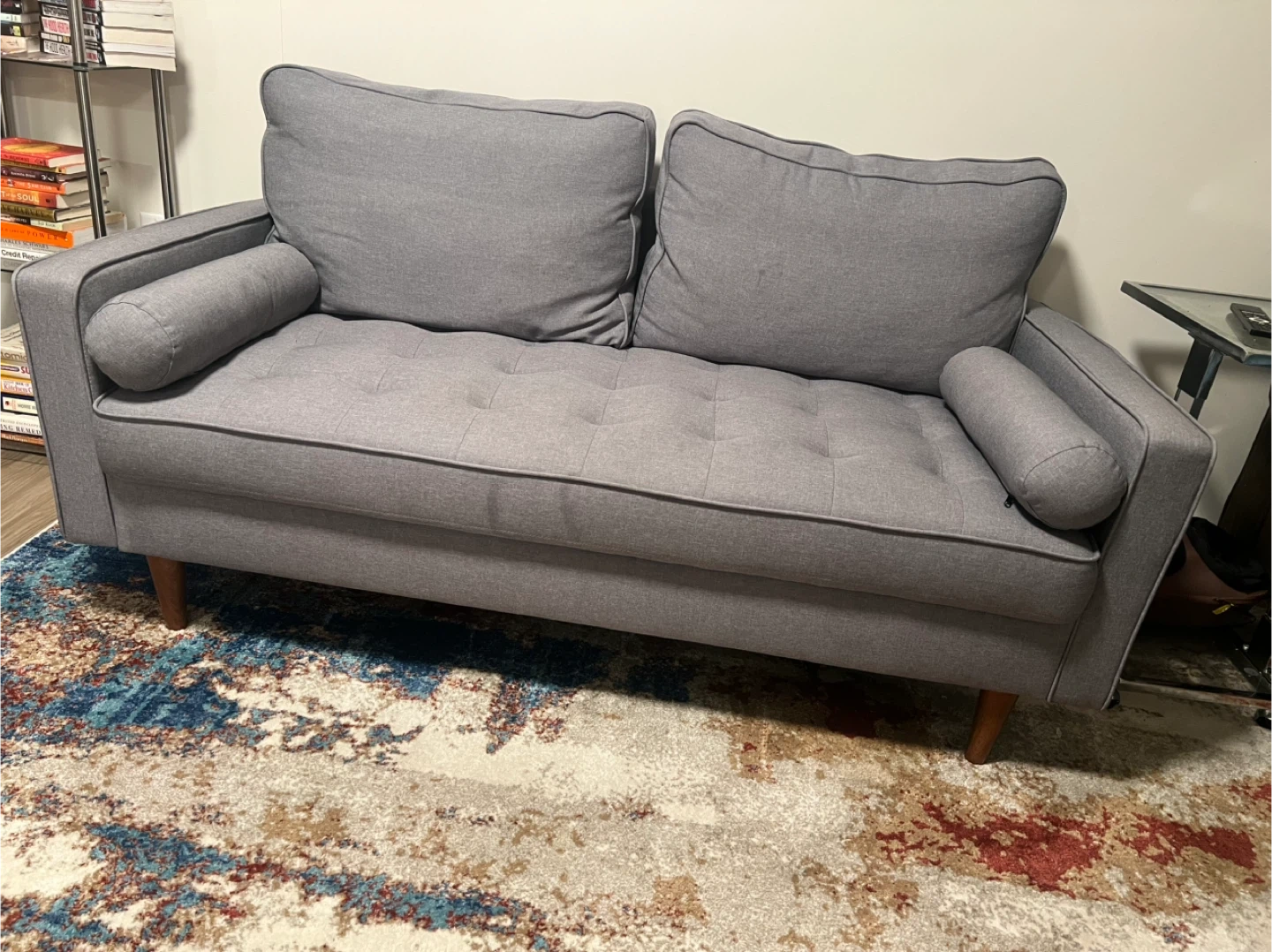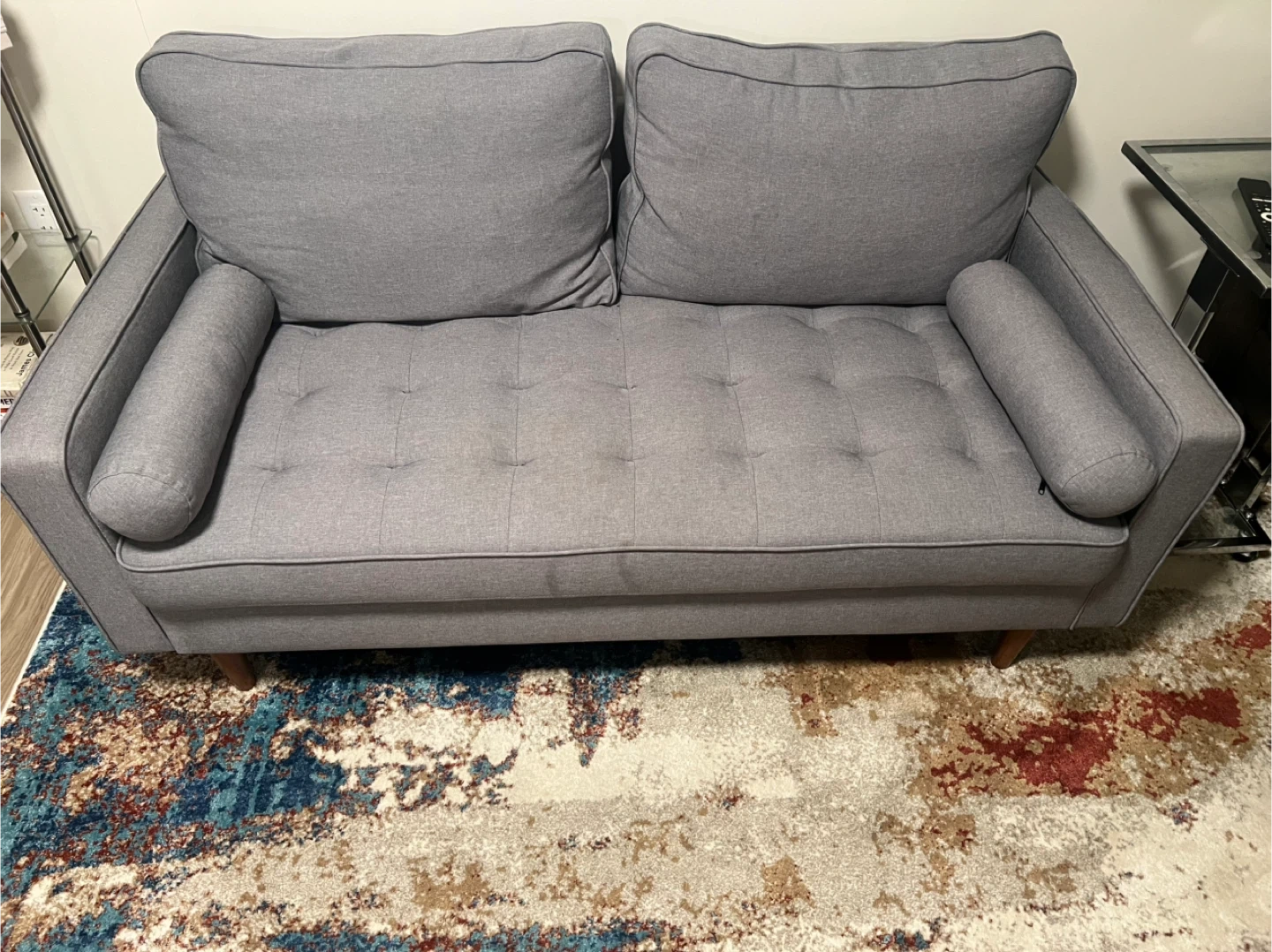10Selling a comfy gray loveseat sofa! It's in great condition and perfect for a small space. The cushions are soft and supportive, and the color is a nice neutral gray that will match any decor. It also comes with two bolster pillows! Non smoking and no animals 6 months old