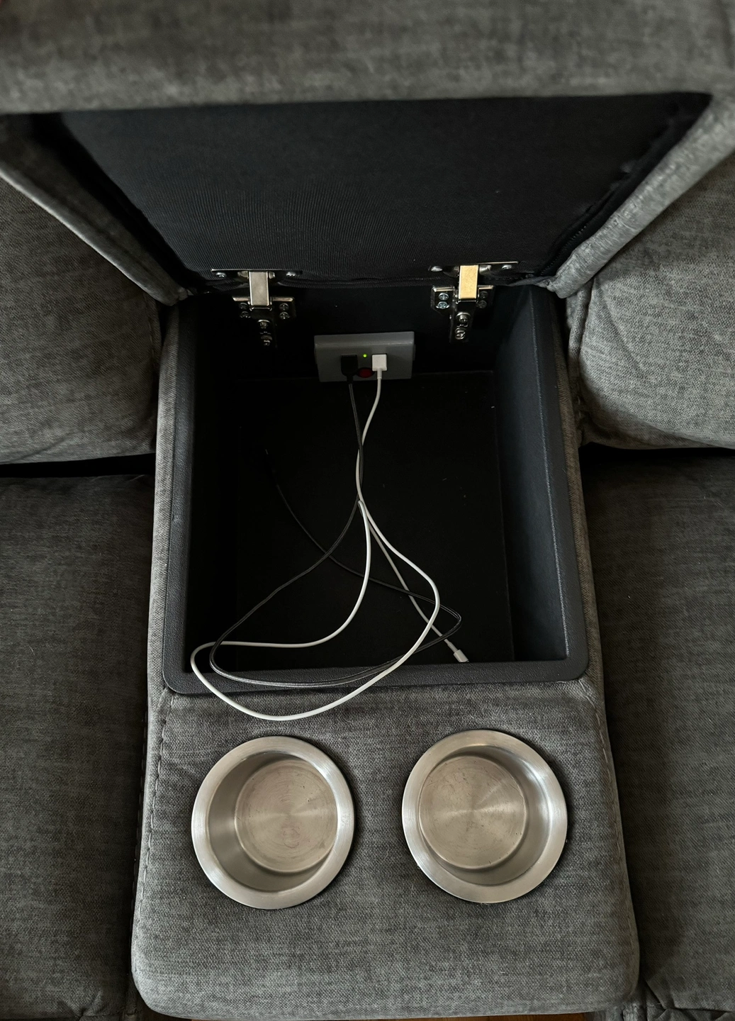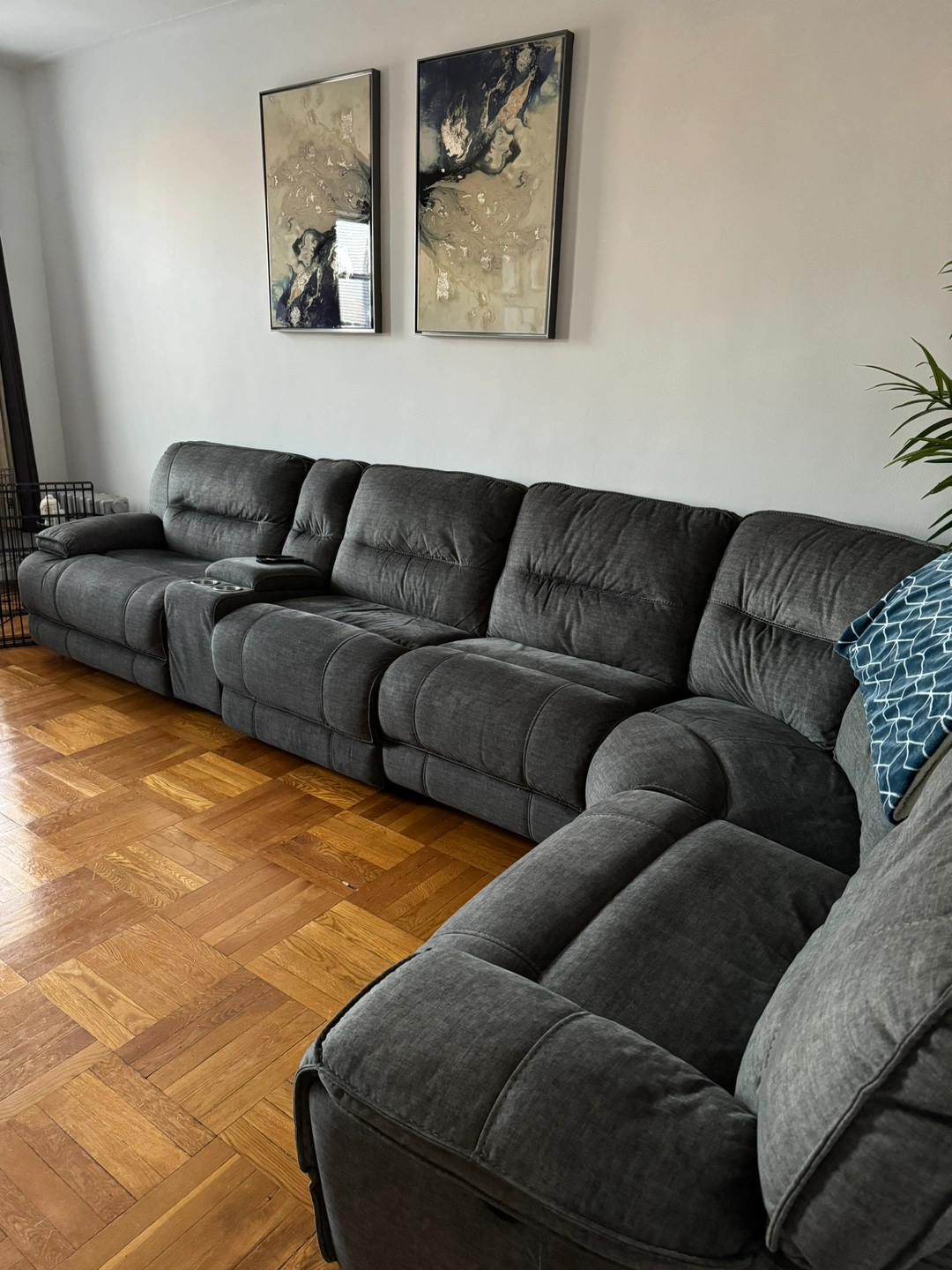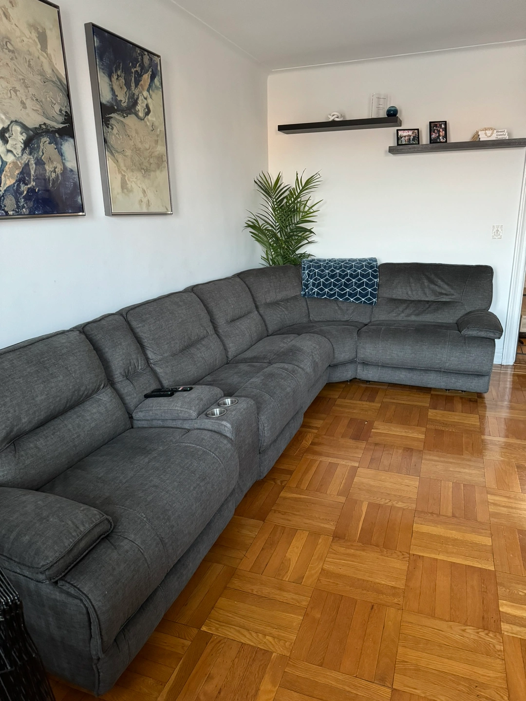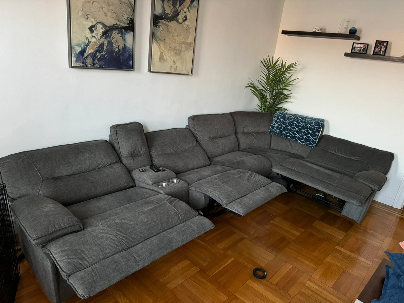 15This is a large gray sectional sofa with three recliners. It has two cup holders and a storage compartment. The couch is under 4 years old and is still in good shape. We can deliver for an extra fee.