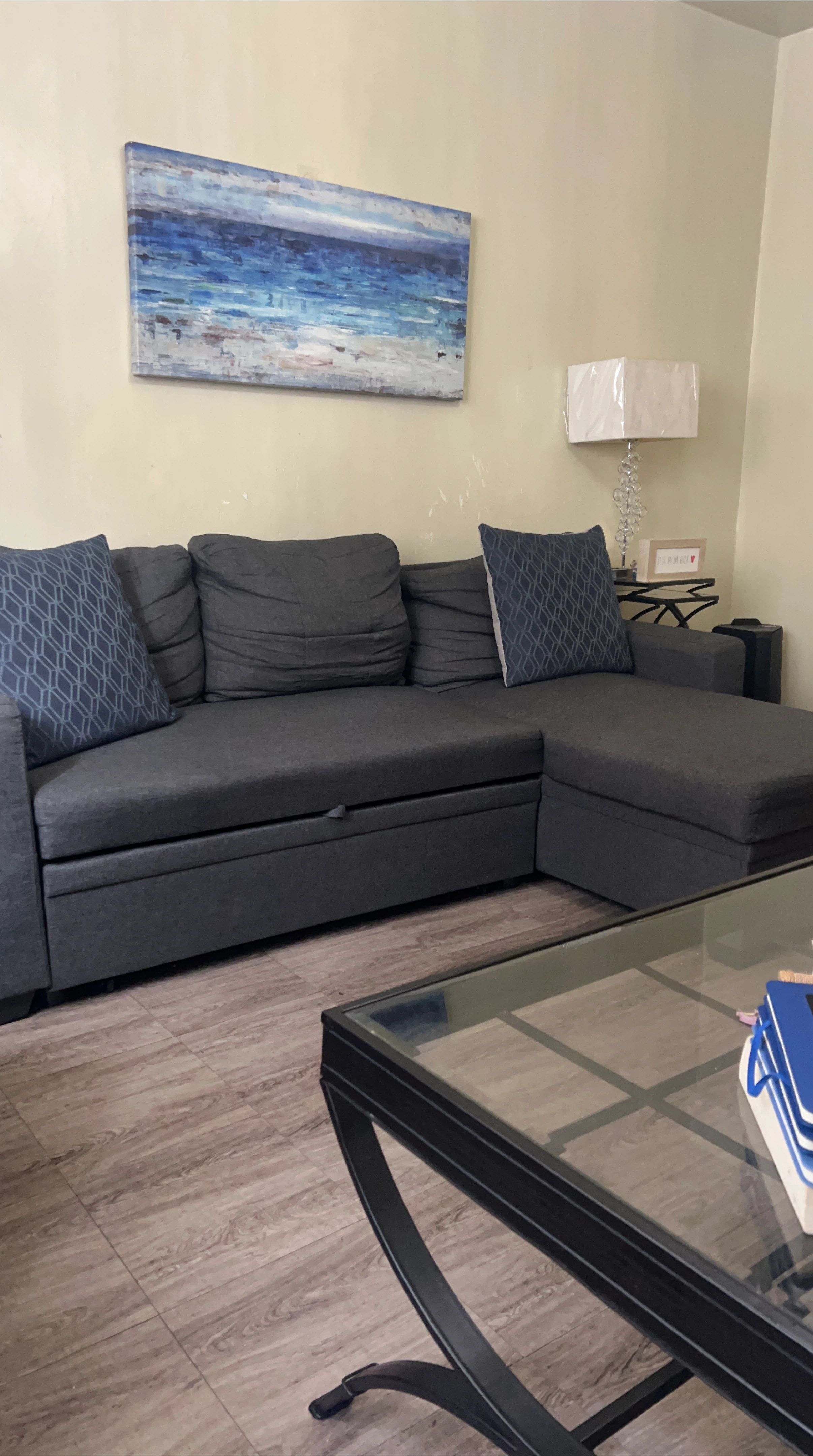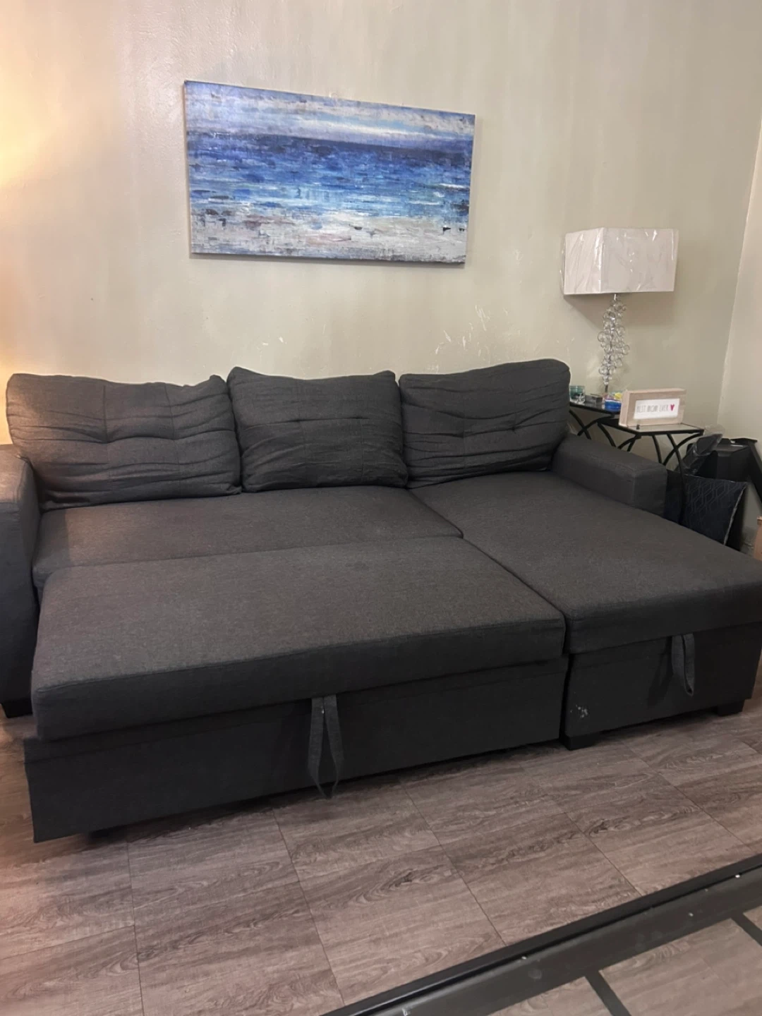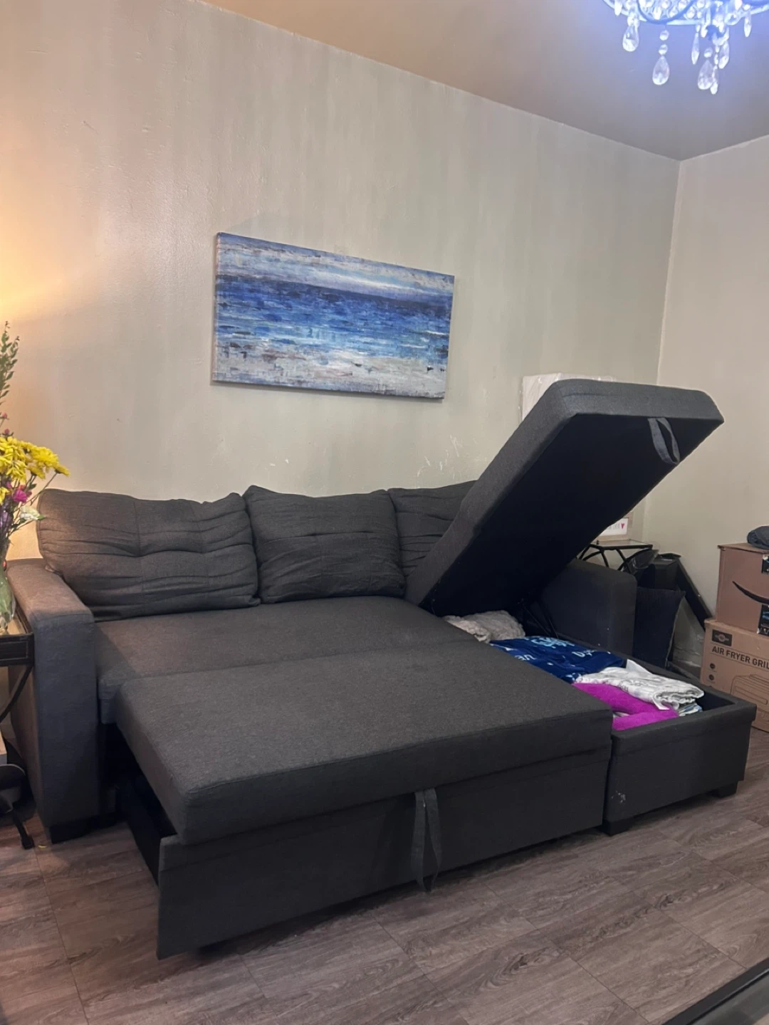 Selling a comfortable gray pull out / sleeper sectional sofa! It features a chaise lounge and built-in storage, perfect for small spaces. The cushions are soft and supportive, making it a great spot to relax. The color is a neutral gray that will fit in with any decor