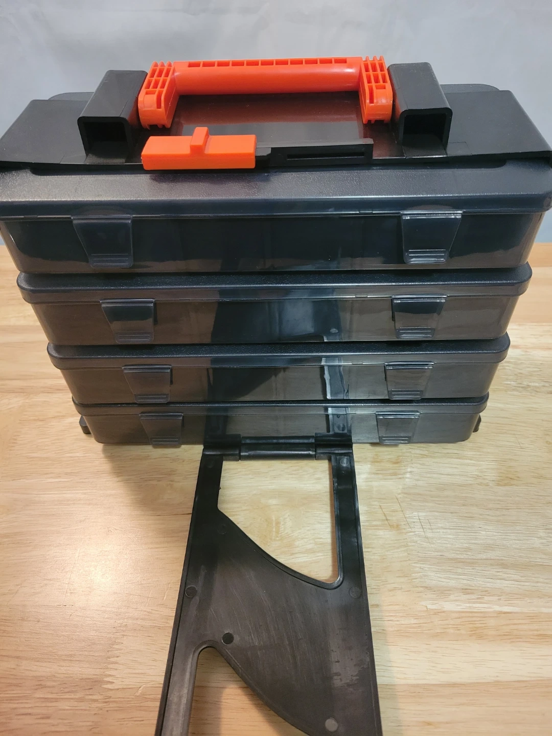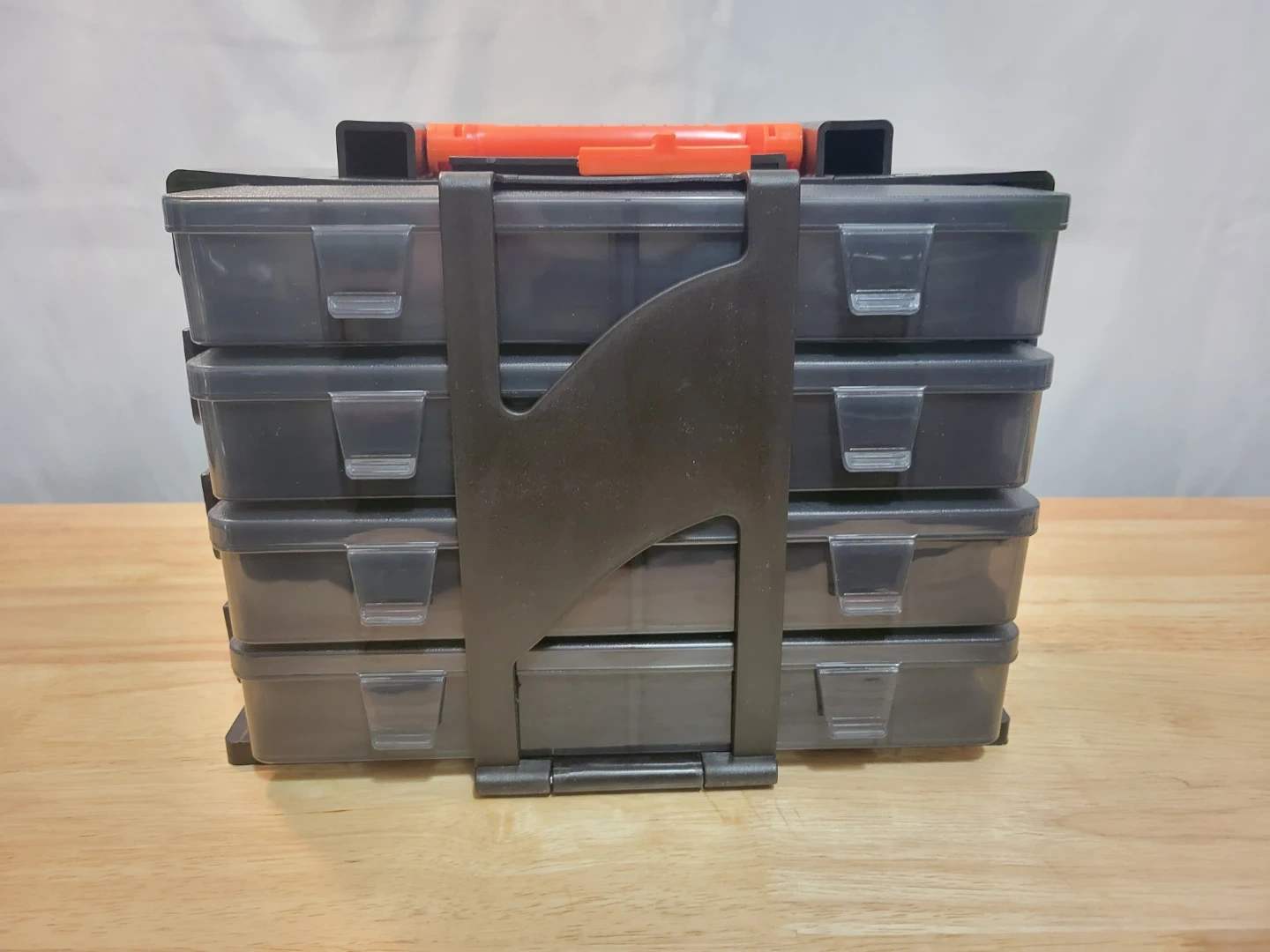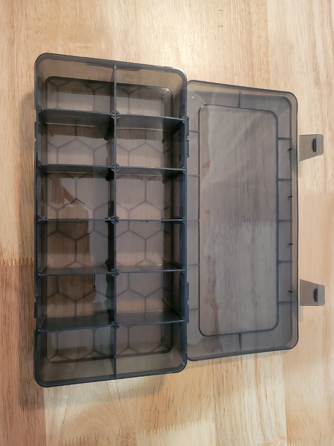 92I'm selling a gray stackable storage container box. It has multiple compartments for organization. Perfect for storing small items and keeping things tidy