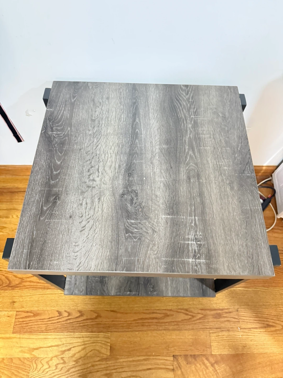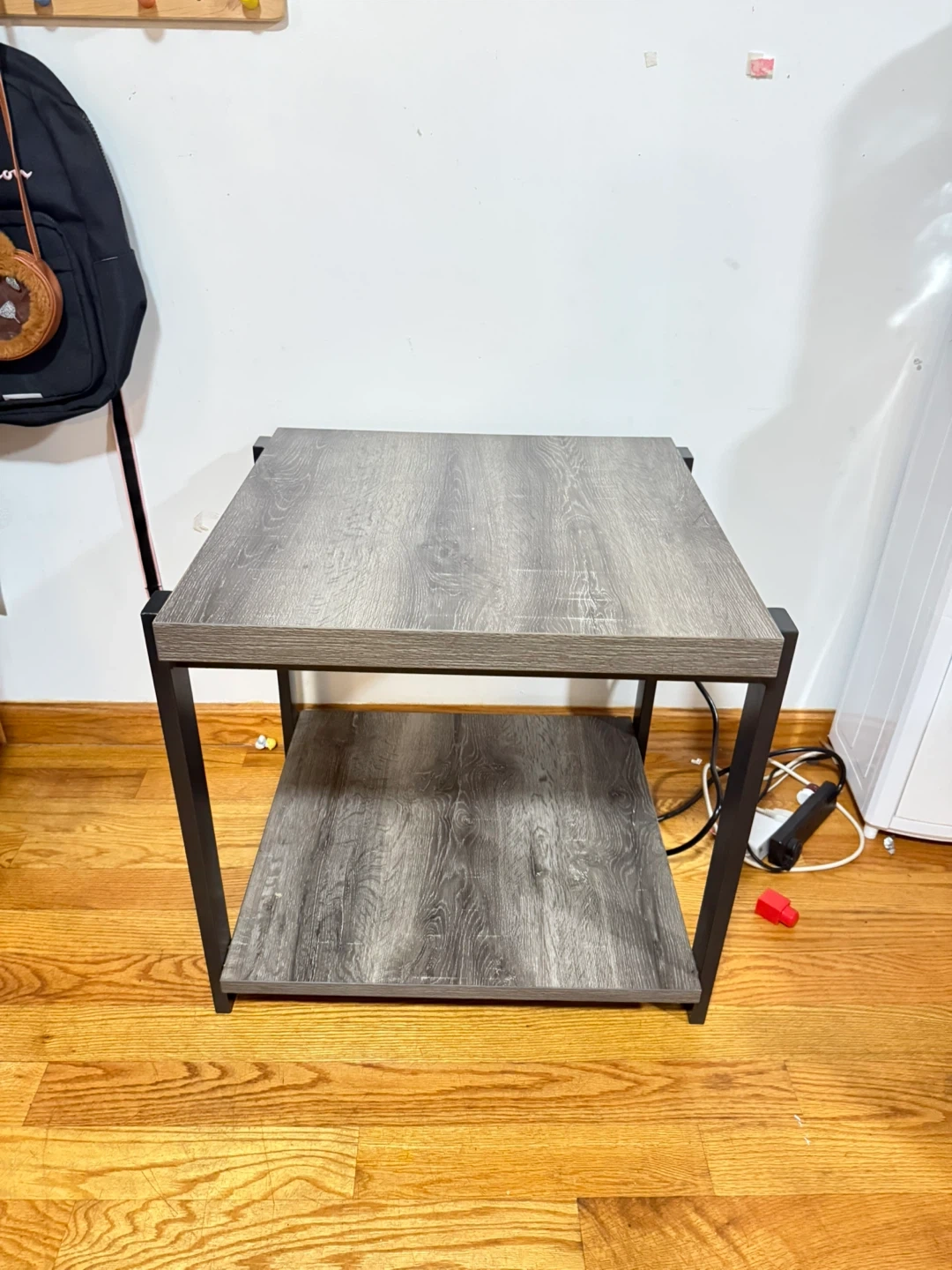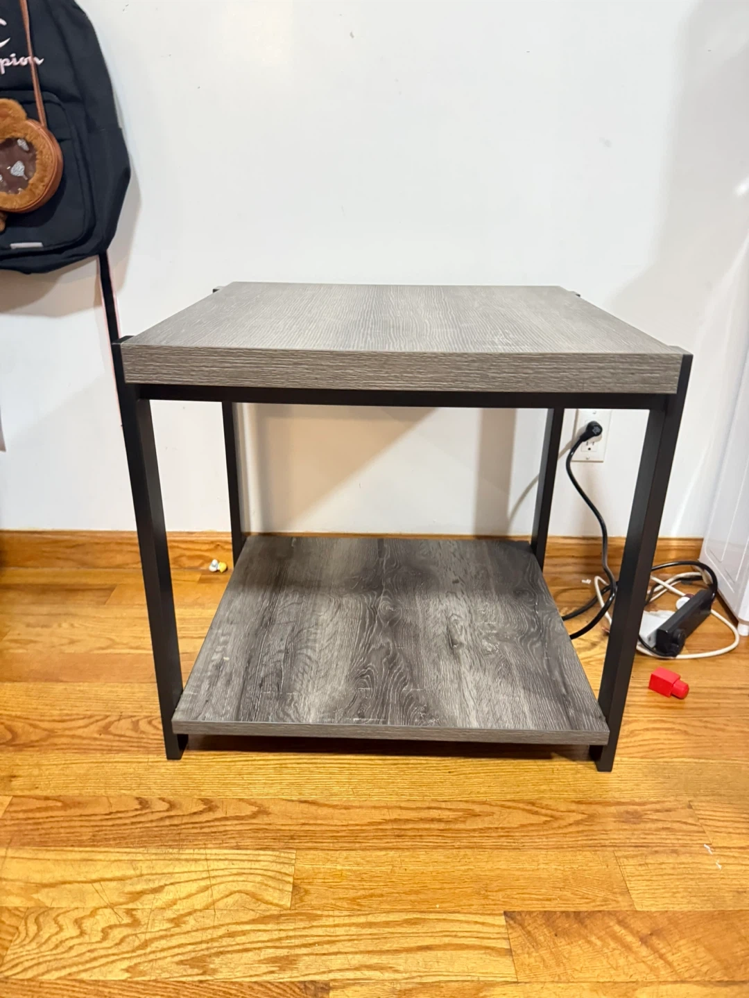 167Selling a gray wood grain end table! It features a sturdy construction with a top and bottom shelf for extra storage or display space. The neutral color and simple design make it a versatile addition to any room