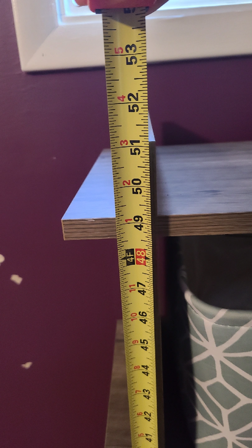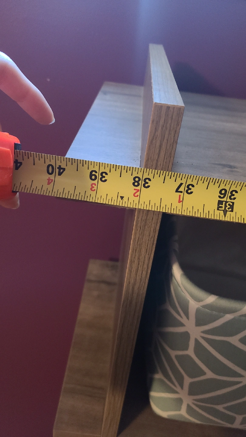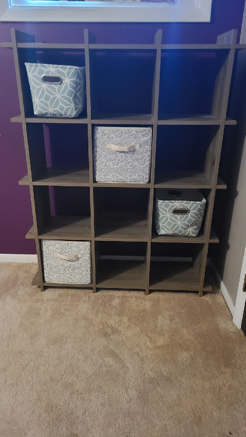 I'm selling a gray wooden cube shelf. It's in good condition and measures approximately 51 inches tall and 40 inches wide. Each cube is about 12 inches wide and 12 inches tall. Perfect for organizing your space! Will make your space look more organized. Great look for your home.