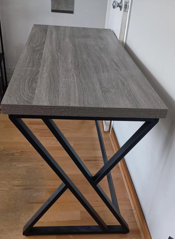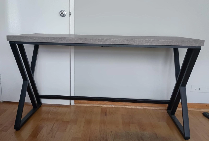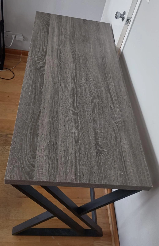 Selling a desk with a gray woodgrain top and black metal legs. It's in great condition and would be perfect for a home office or study space. The design is modern and stylish, and the desk is sturdy and functional