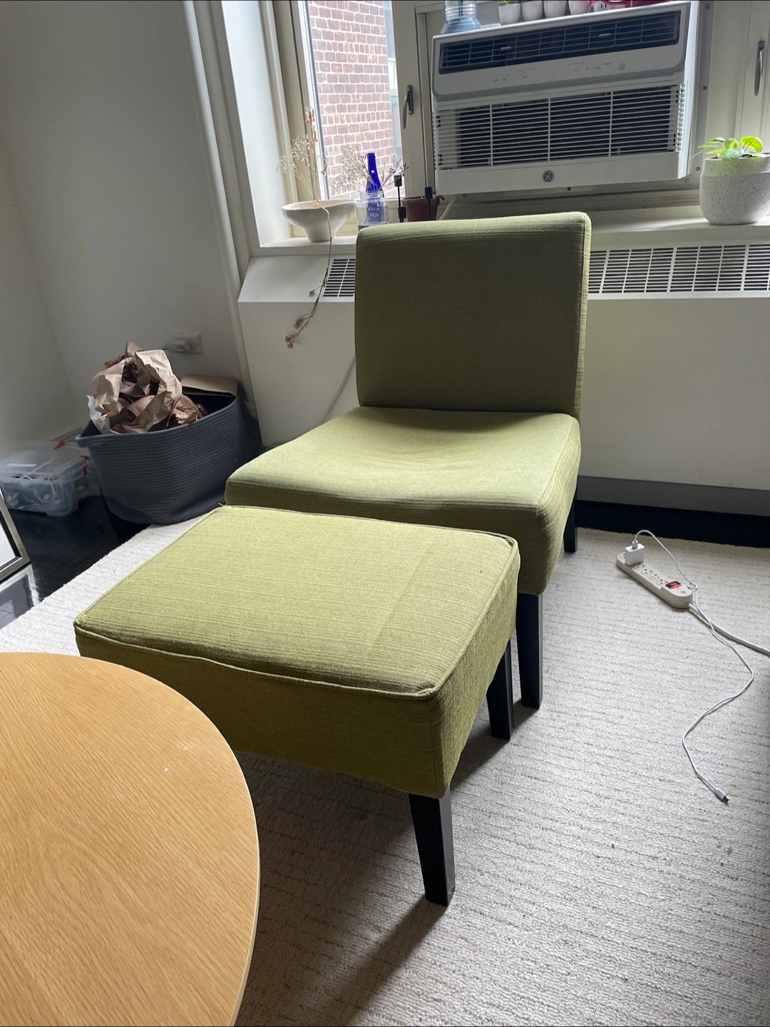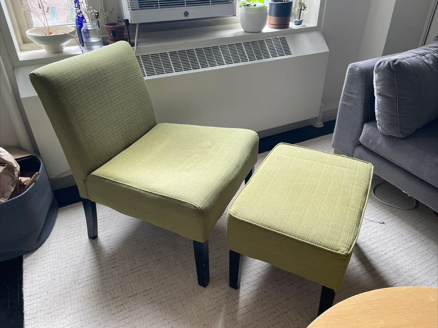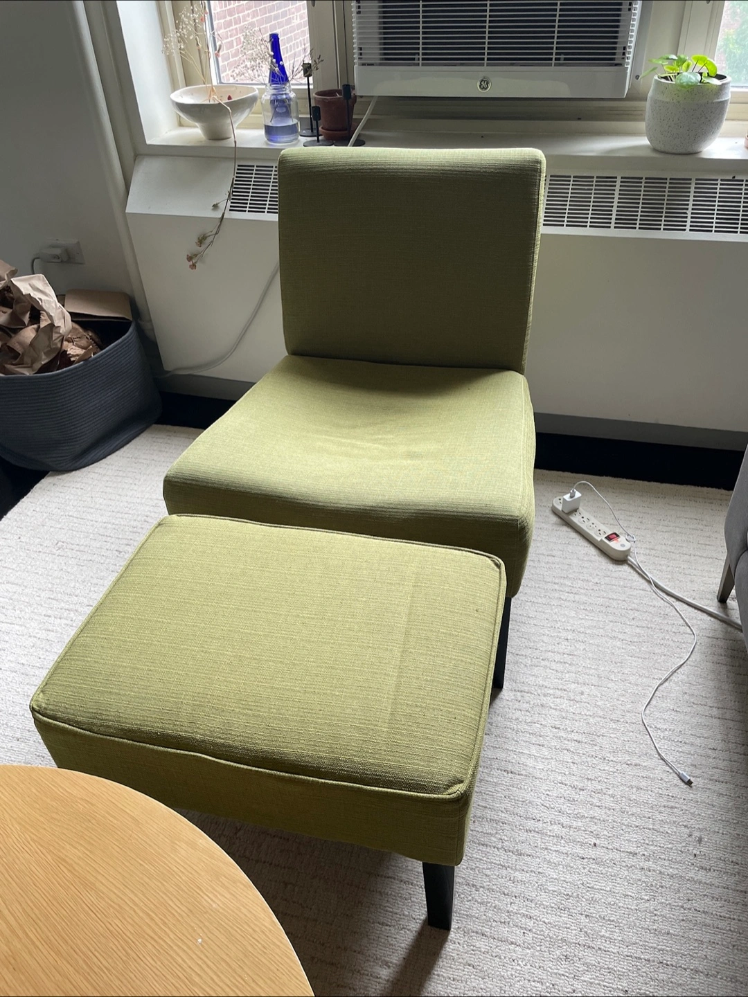 Selling a comfortable green armless chair with a matching ottoman! The set is in good condition and would be a great addition to any living space. It's perfect for relaxing and putting your feet up after a long day