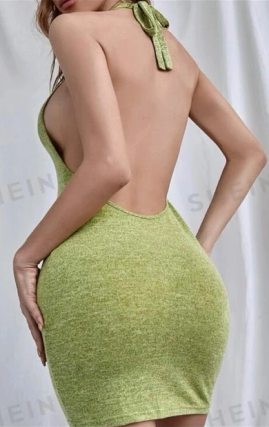 47Turn heads in this lime green halter mini dress by Shein Privé, designed with a sleek bodycon fit that accentuates every curve. The high gathered neckline and open back with tie detail add a sophisticated yet flirty touch, perfect for nights out, parties, or a chic summer date look. Crafted from a stretchy knit-blend fabric, this dress hugs comfortably while offering easy movement. The color’s soft shimmer catches the light beautifully, giving it a subtle luxe feel. Pair it with: silver heels, a small clutch, and hoop earrings for an effortlessly glam look. Brand: Shein Privé • Size: Small (US 4) • Color: Lime Green • Fit: Bodycon, halter neck with tie-back, open back • Condition: excellent condition- worn once for 2 hours • Material: Stretch polyester blend