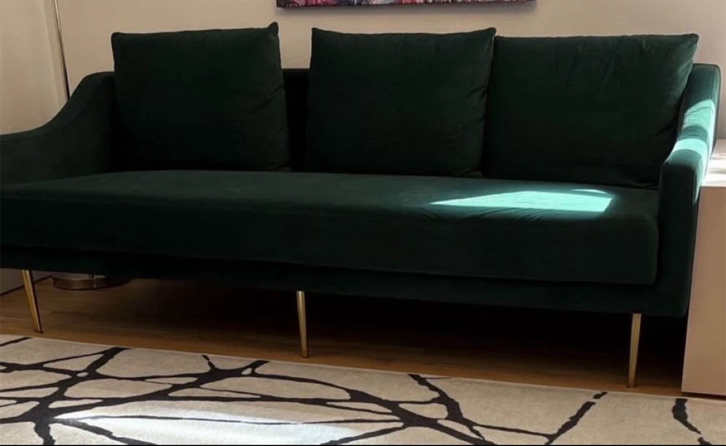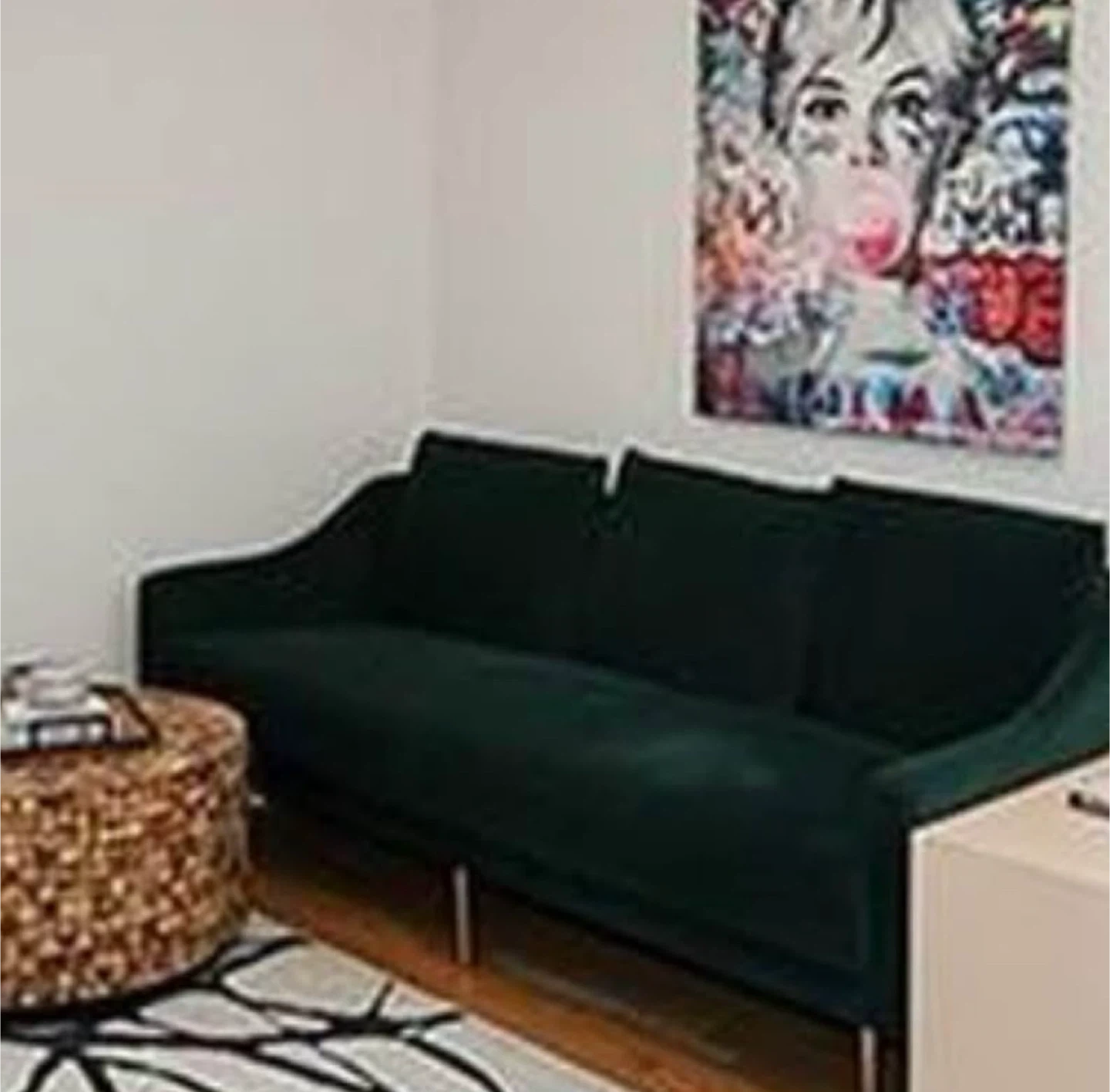 Selling a stylish green velvet sofa with sleek gold legs! It's in great condition and would look lovely in any living room or den. It's a comfortable and elegant piece of furniture!
