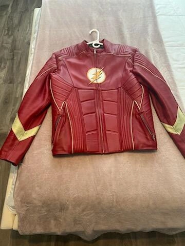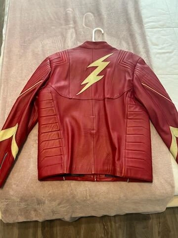 10Selling a Grispiel The Flash leather jacket in size XL. The jacket is red with gold accents and features the Flash logo. The material is leather with a polyester lining.
