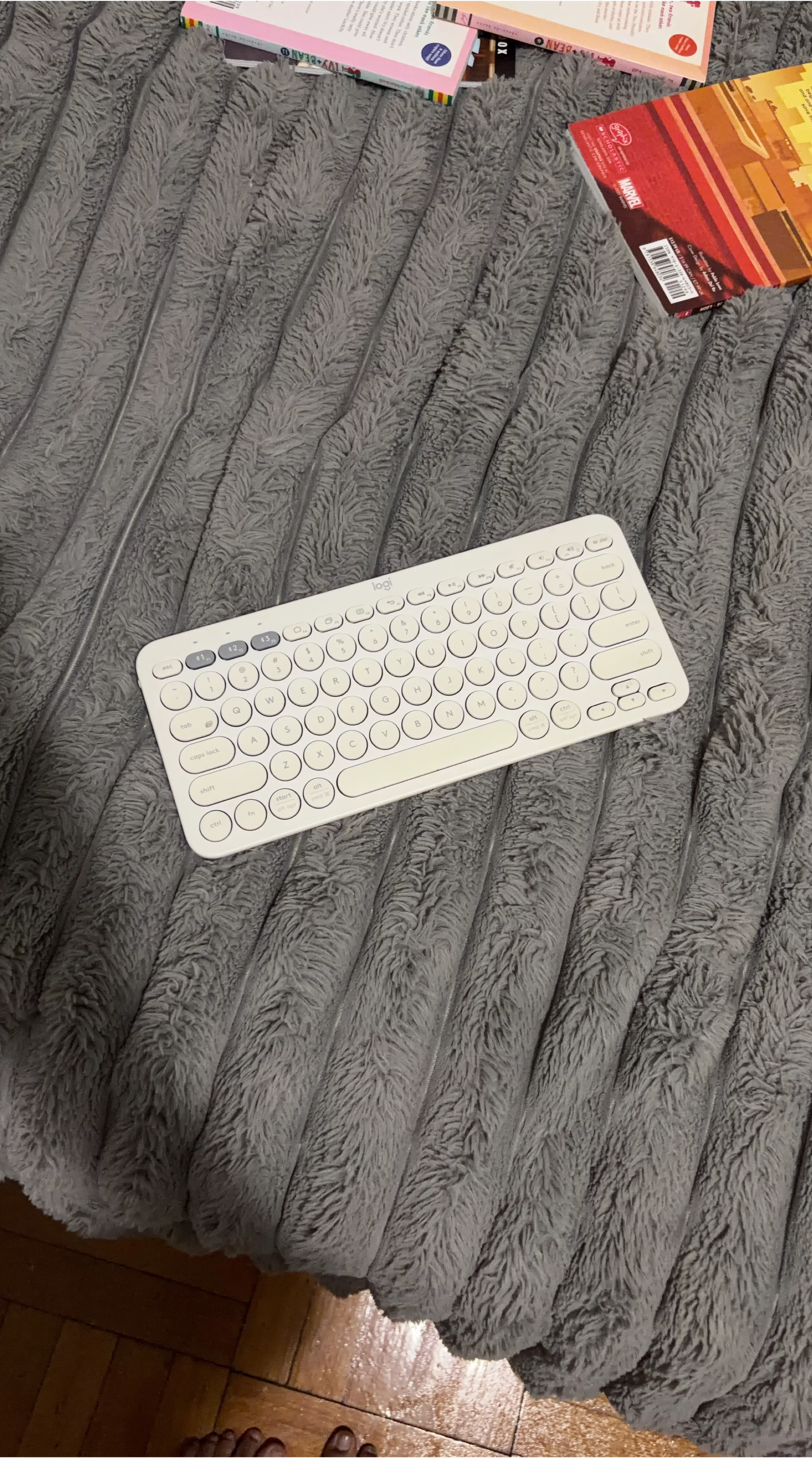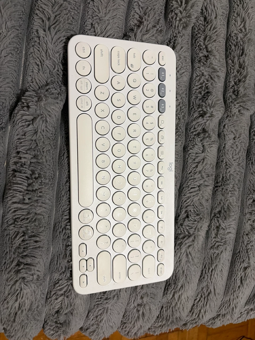 This is a Logitech K380 multi-device Bluetooth keyboard. It's white and connects wirelessly. It's designed for easy typing on multiple devices.