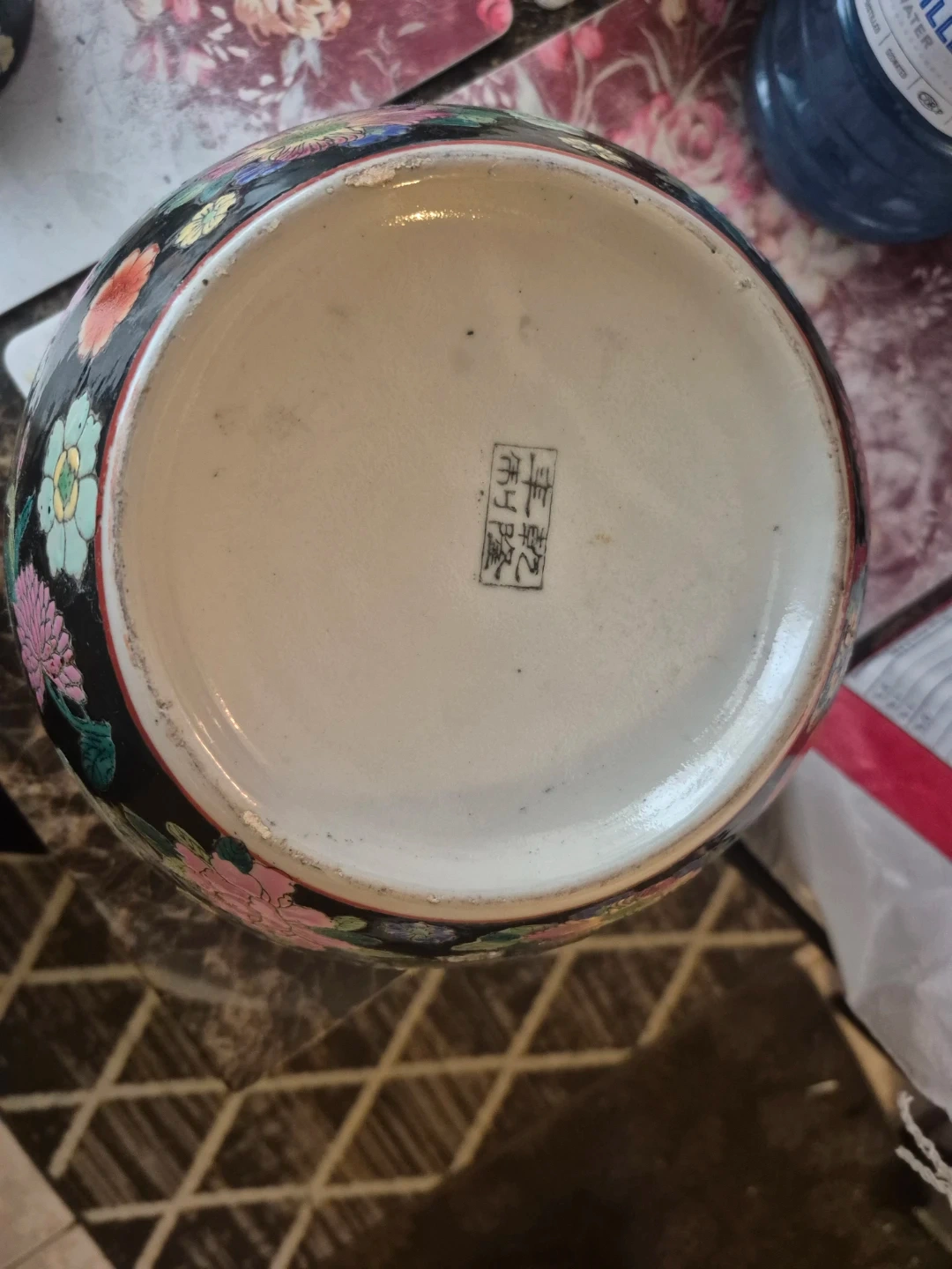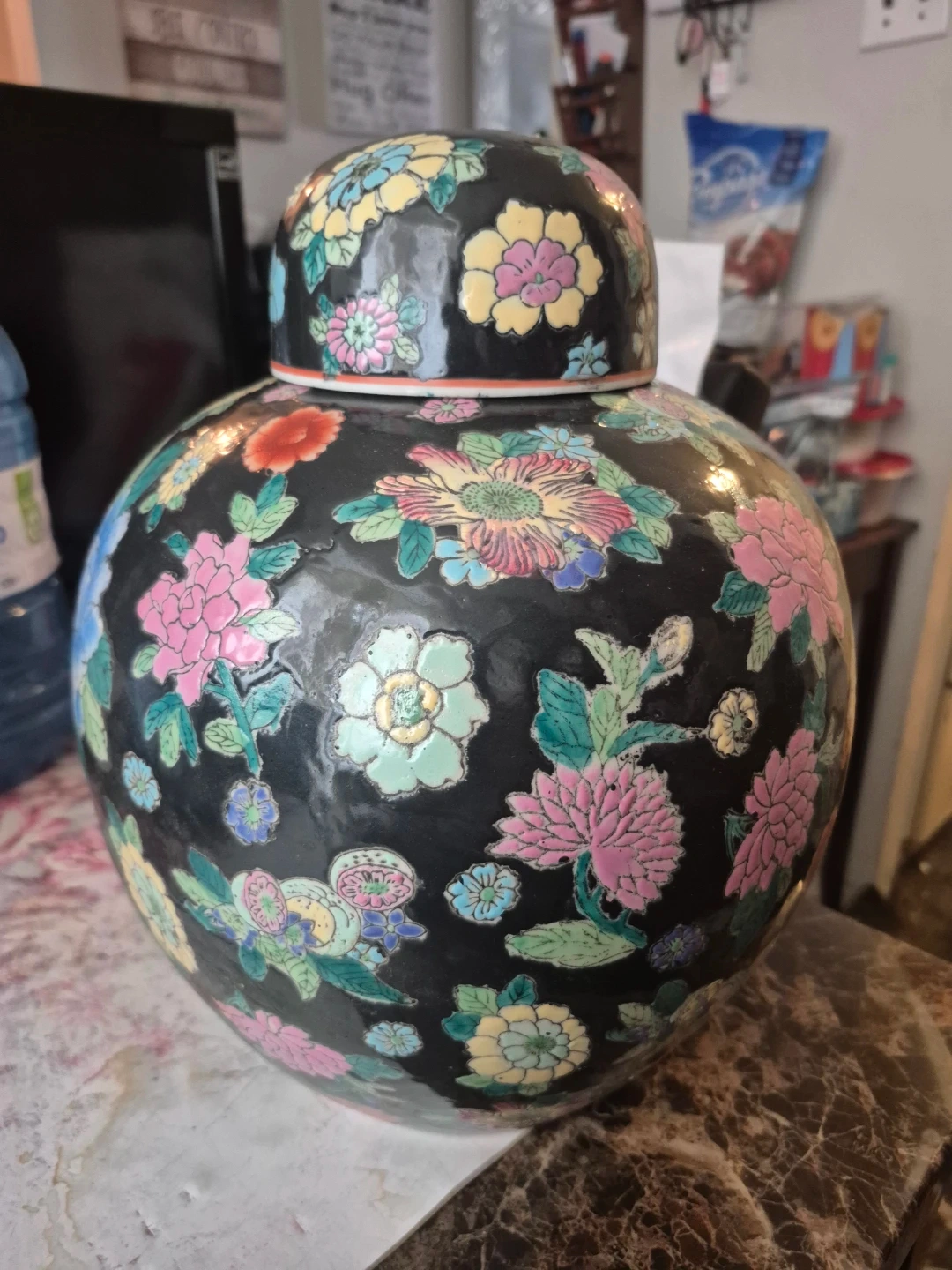 This is a decorative ginger jar featuring a vibrant floral pattern on a black background. It's made of ceramic and comes with a lid. The intricate design makes it a lovely accent piece for any room.