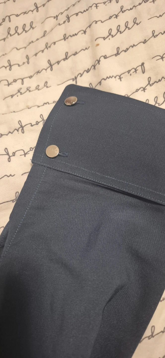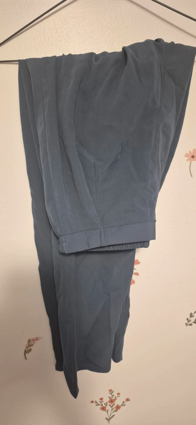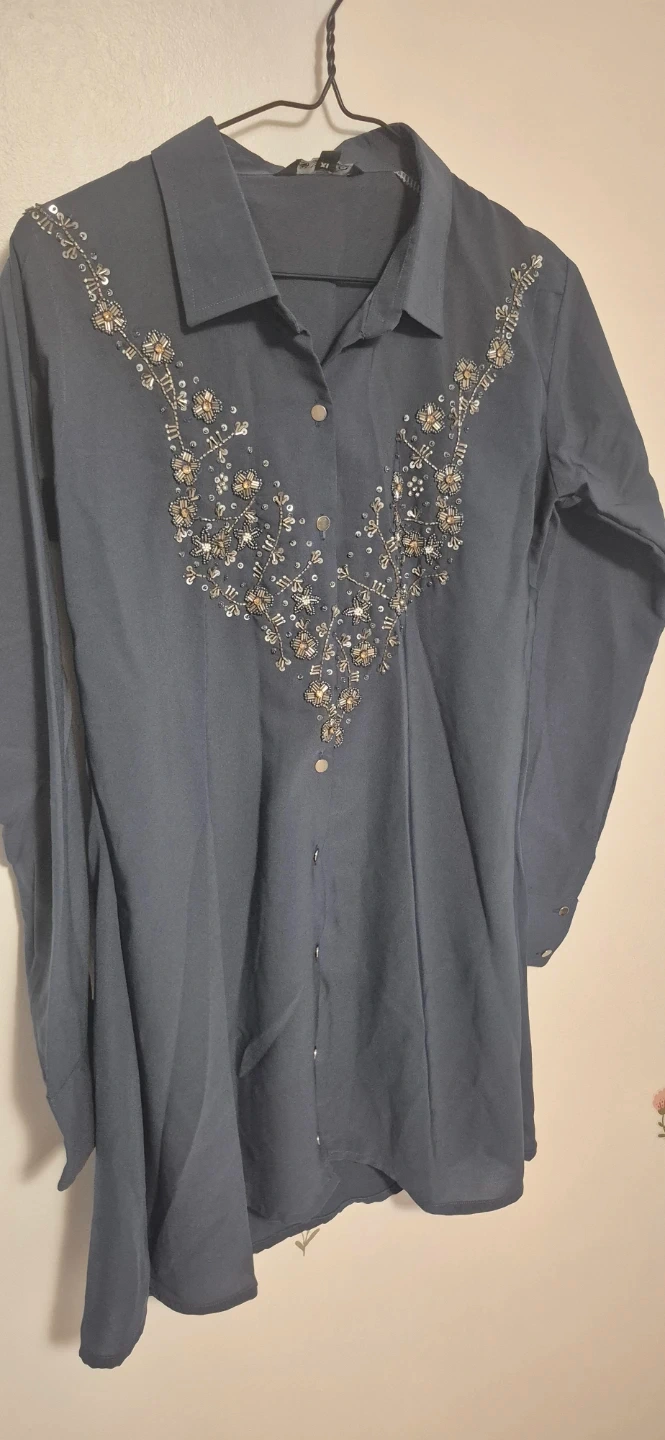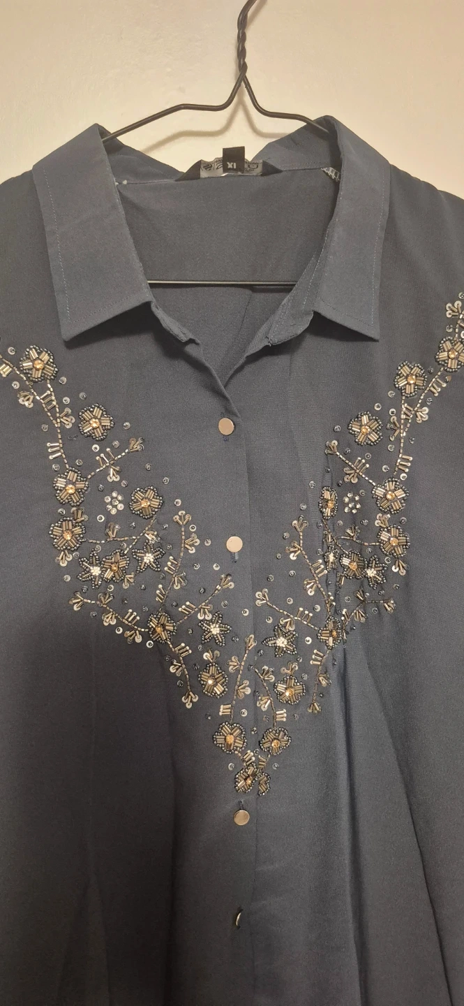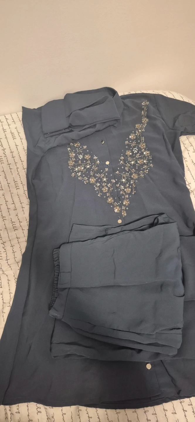 This stylish two-piece set includes a dark blue kurti with intricate beadwork and matching pants. The kurti features a collared neckline and button-up front. The pants have an elastic waistband for comfort. Size xl