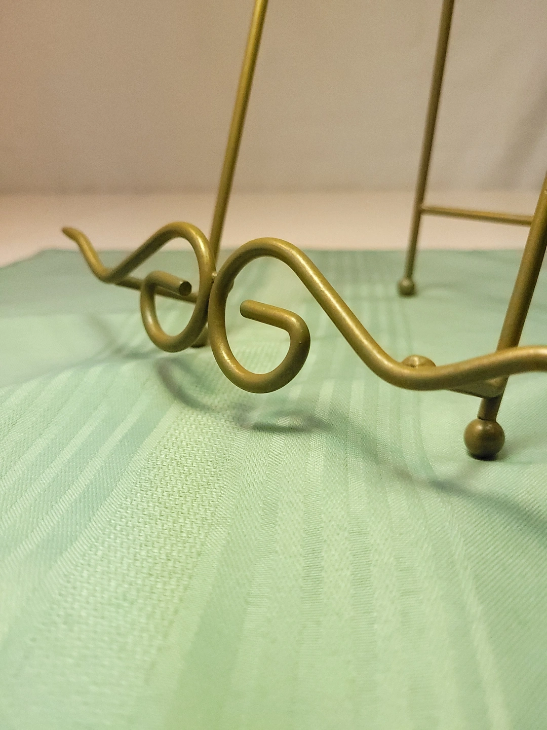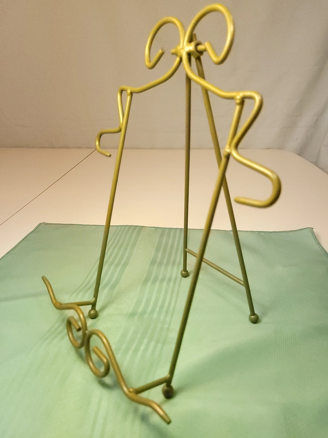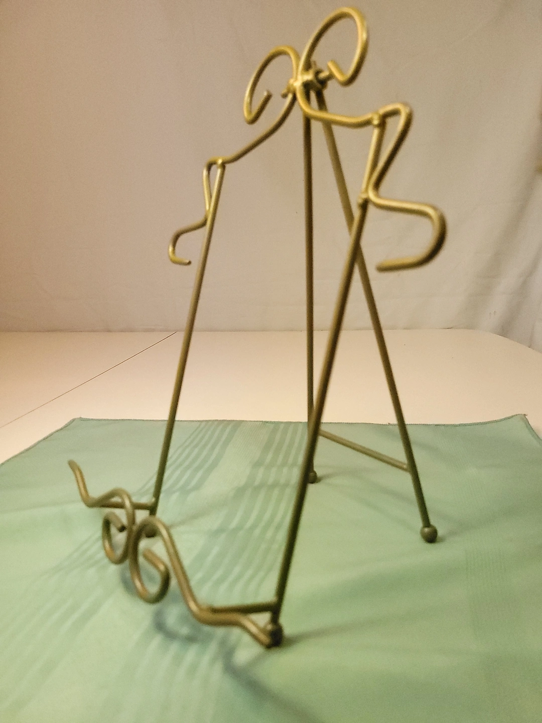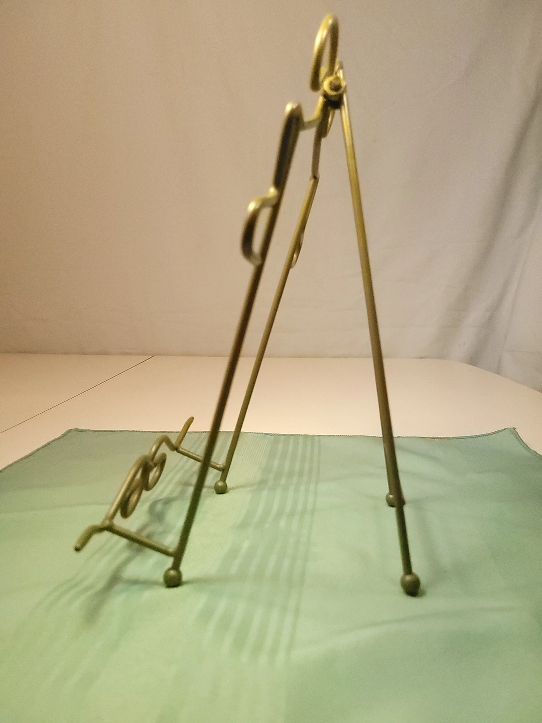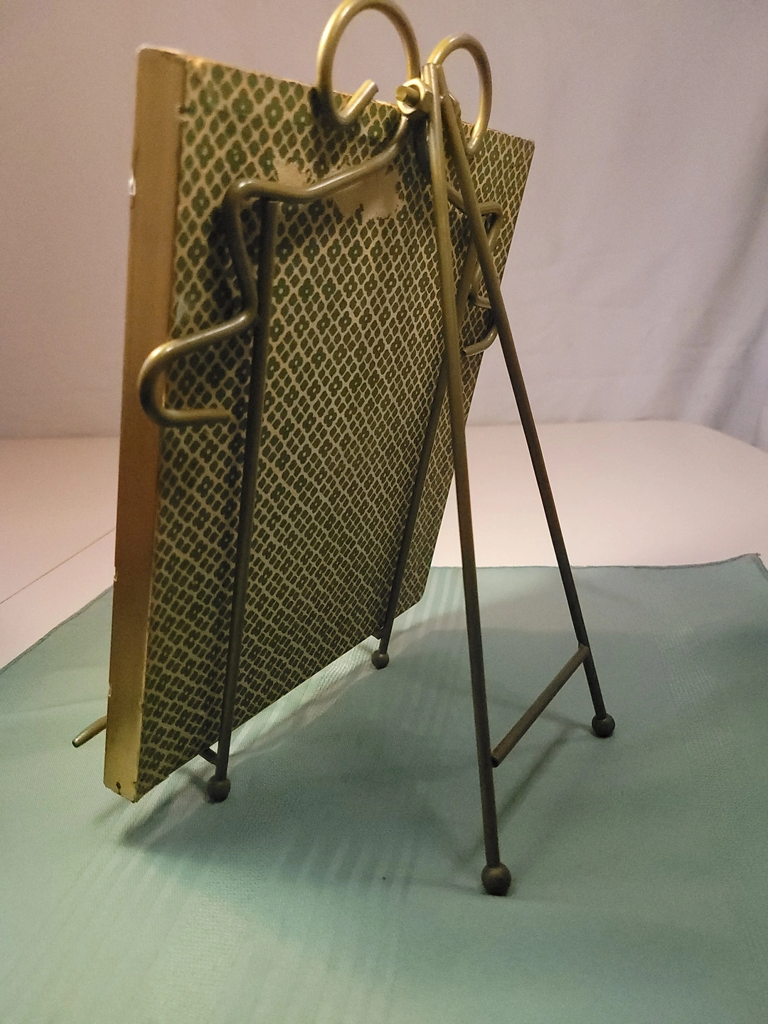 The easel is in excellent condition for its age. The gold finish is bright and shows only very light, age-appropriate wear. The wire is structurally sound with no bends or breaks, and the rear hinge remains firm and fully functional.