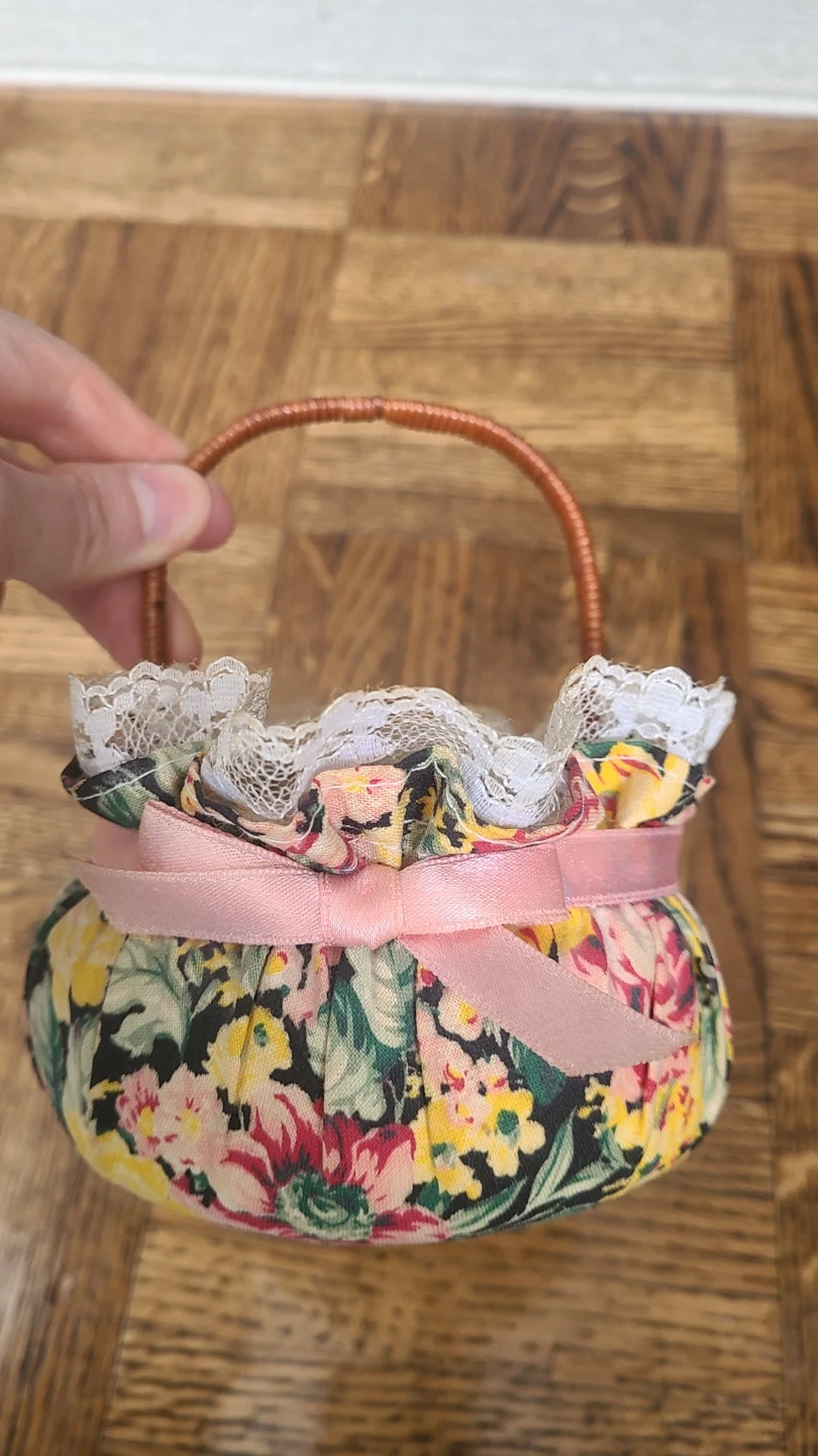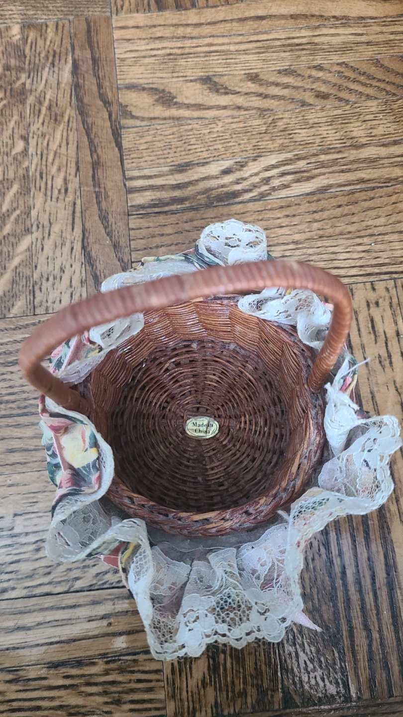 This cute basket features a woven interior and a floral fabric exterior with lace trim and a pink ribbon bow. It has a sturdy handle for carrying. It's perfect for small trinkets or as a decorative piece!