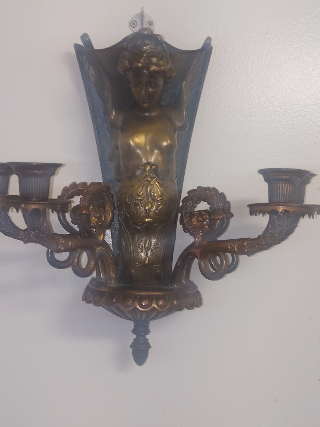 A beautiful, vintage-style wall sconce designed to hold two candles. It features an ornate figurine at the center with detailed scrollwork and decorative elements. Made from metal with a bronze-like finish.