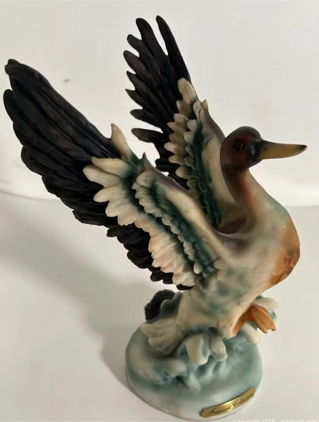This is a ceramic figurine of a duck, likely from the Fine Art Collection. It depicts a mallard duck with its wings spread, perched on a blue base. The colours are detailed, showing natural tones of the duck.