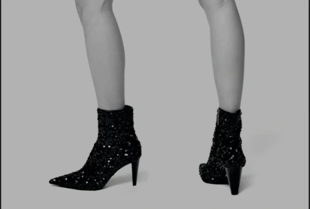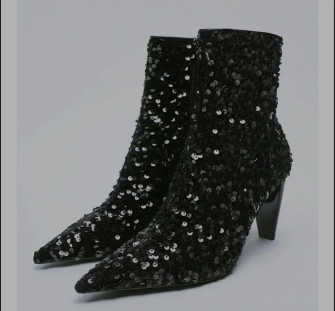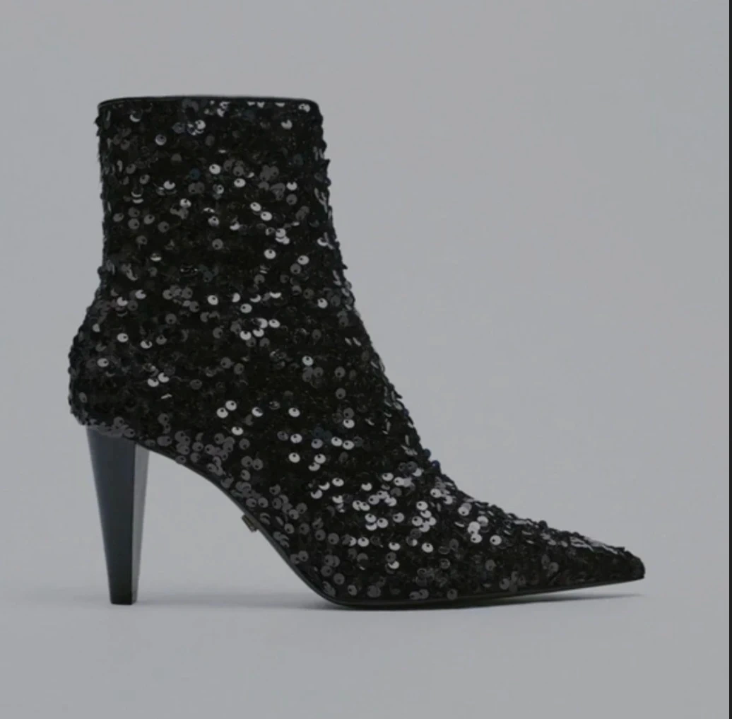 Sparkly black sequin heeled ankle boots with a pointed toe. These boots have a comfortable heel height, making them perfect for a night out. They're fully covered in black sequins and feature a sleek, modern design.