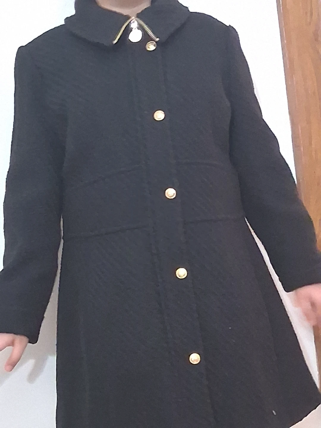 This black coat has a textured fabric and gold button closures. It features a zipper detail on the collar. Material appears to be a wool blend.