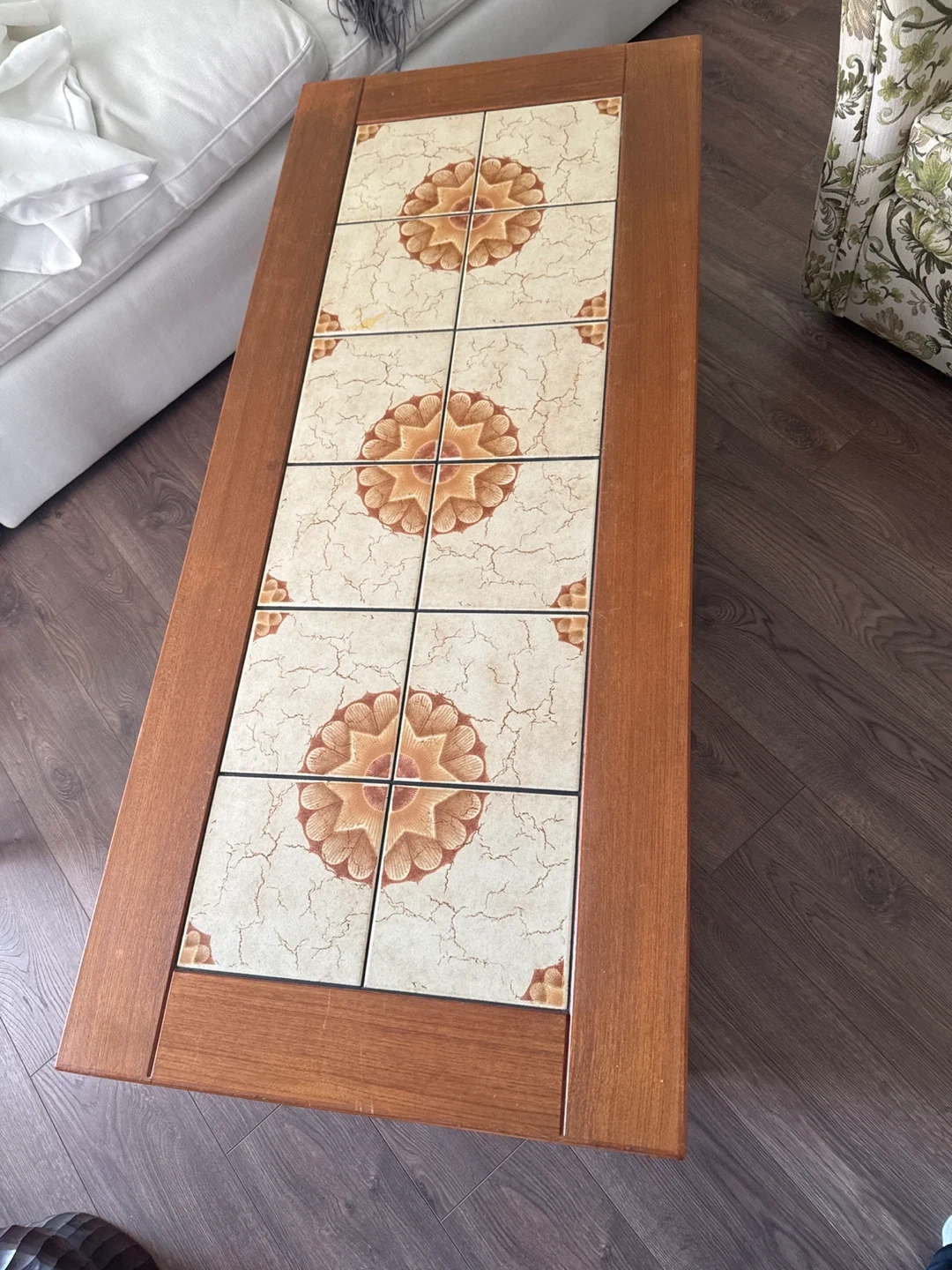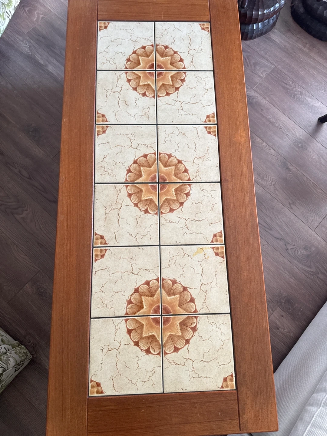 A coffee table with a unique tile top design. It has a wooden frame and a set of decorative tiles inset on the surface. Perfect for adding a touch of vintage charm to your living room