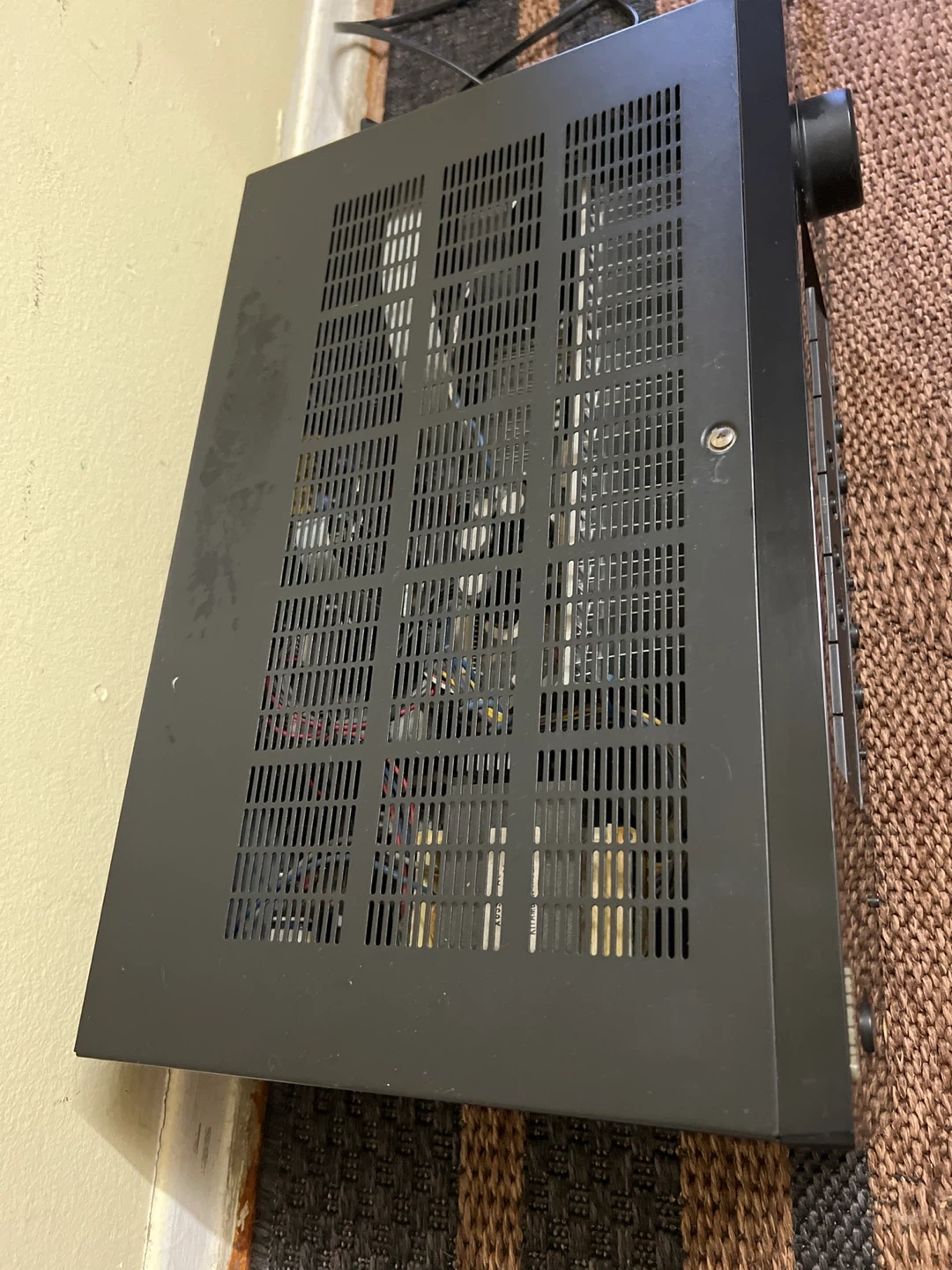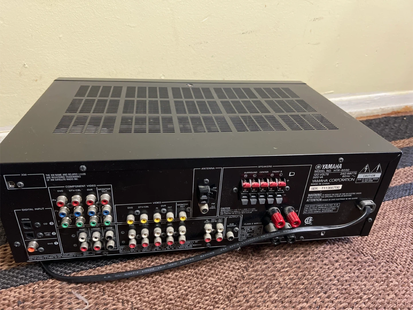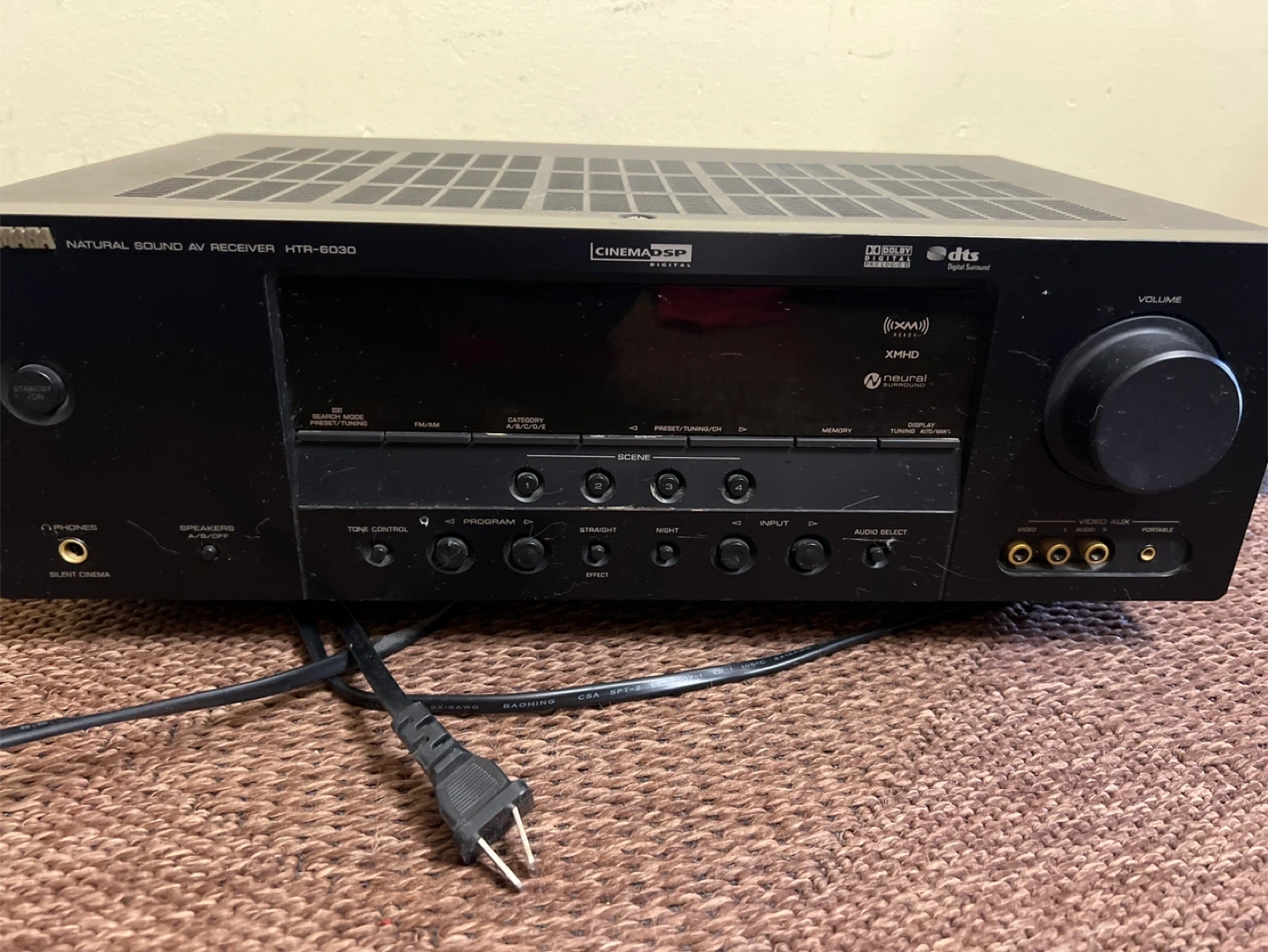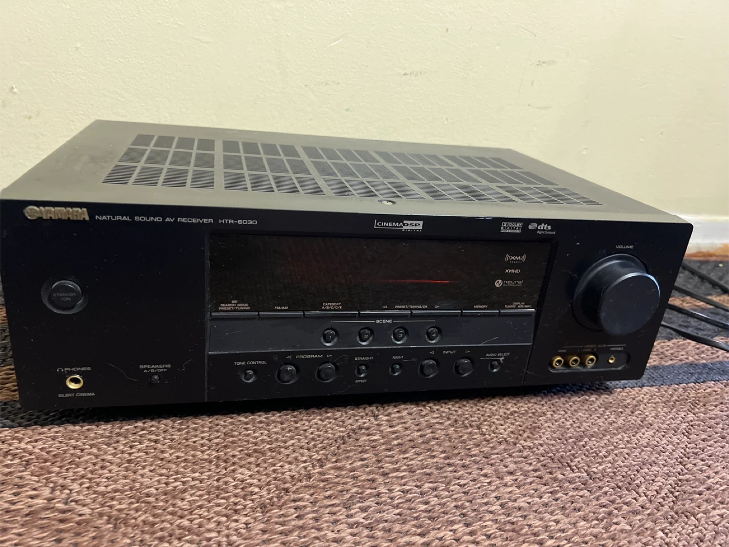 Yamaha Natural Sound AV Receiver. Model HTR-6030. It's a black, digital surround sound receiver. This unit has many input and output connections on the rear. No remote controller. Pick up only, cash only