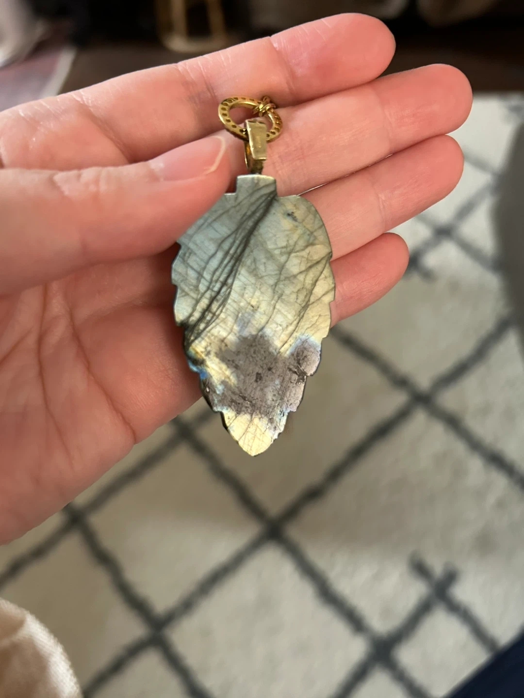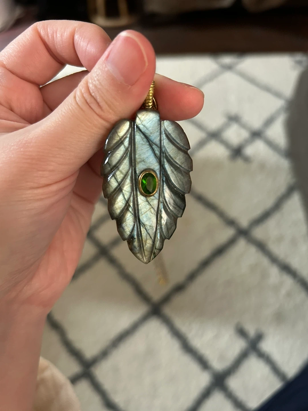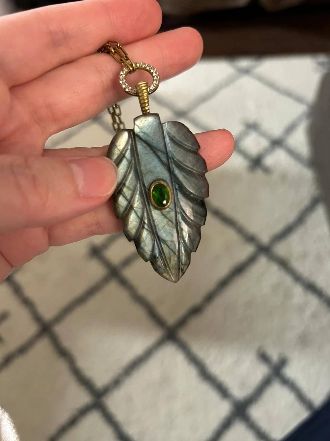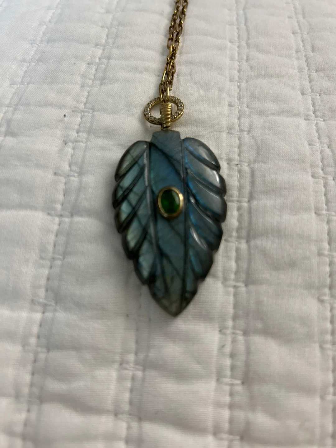 Labradorite Leaf Pendant Necklace with Green Gemstone