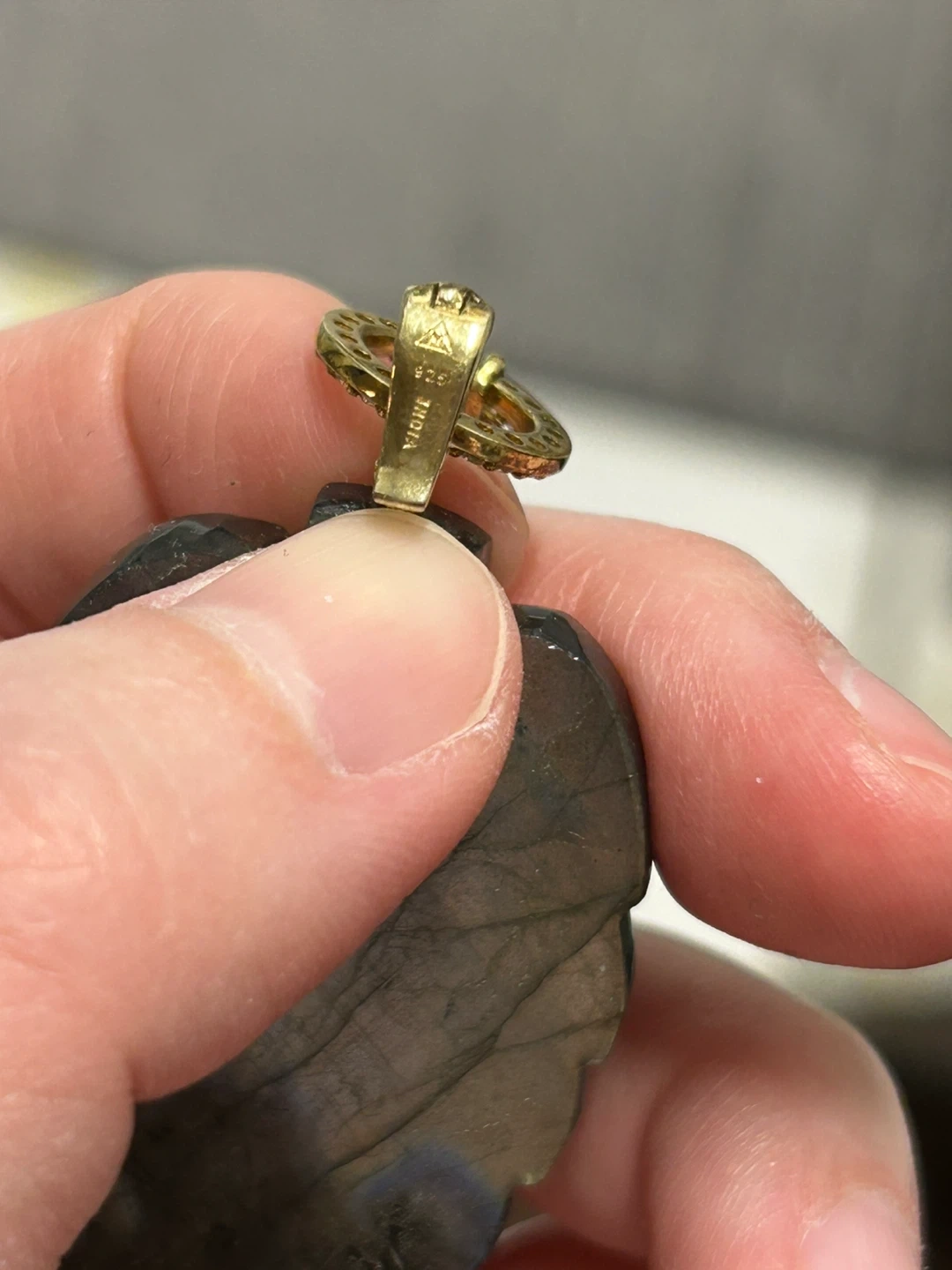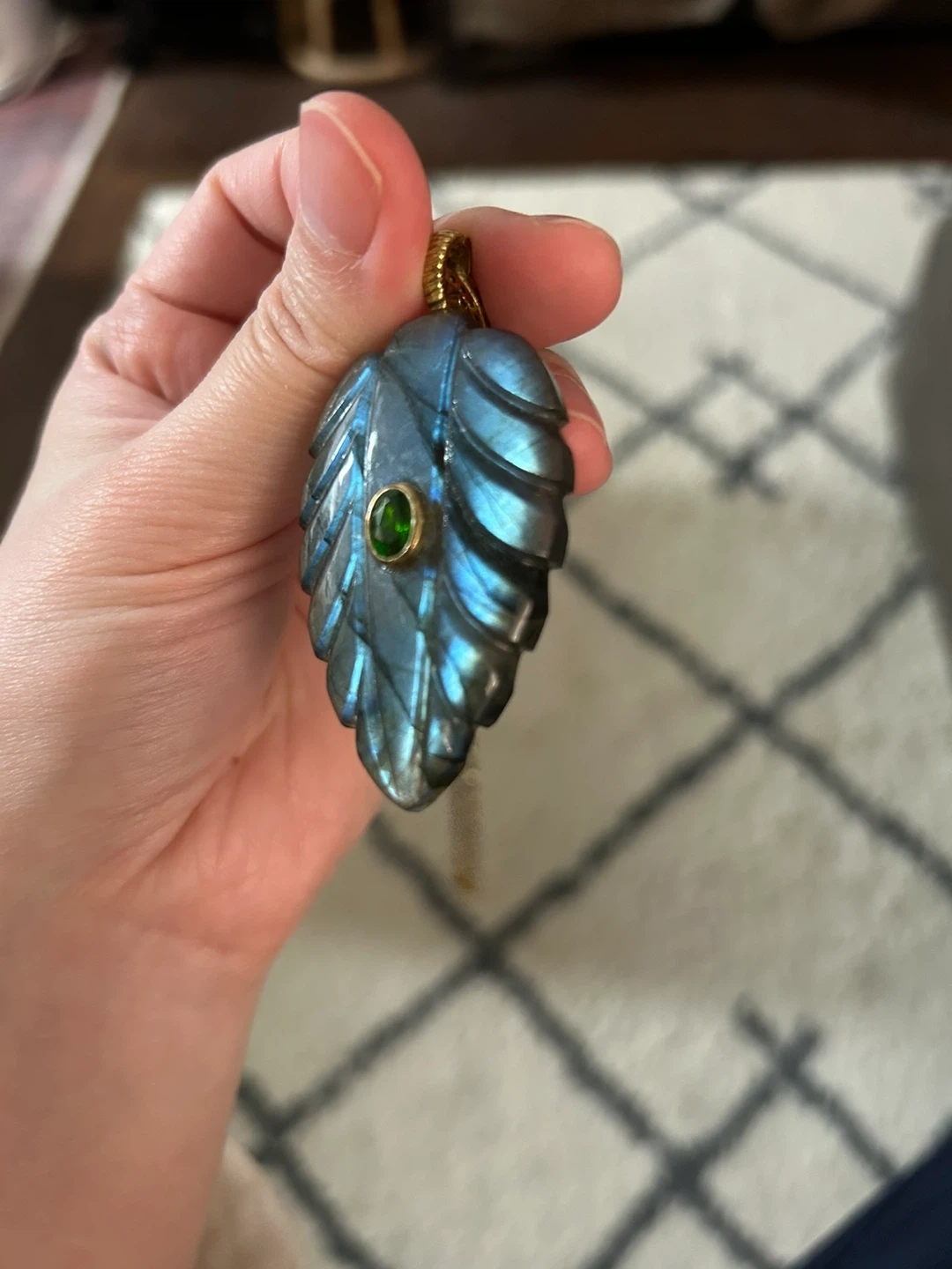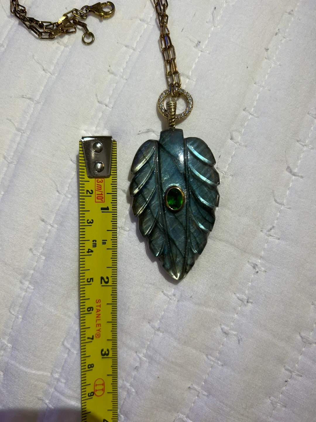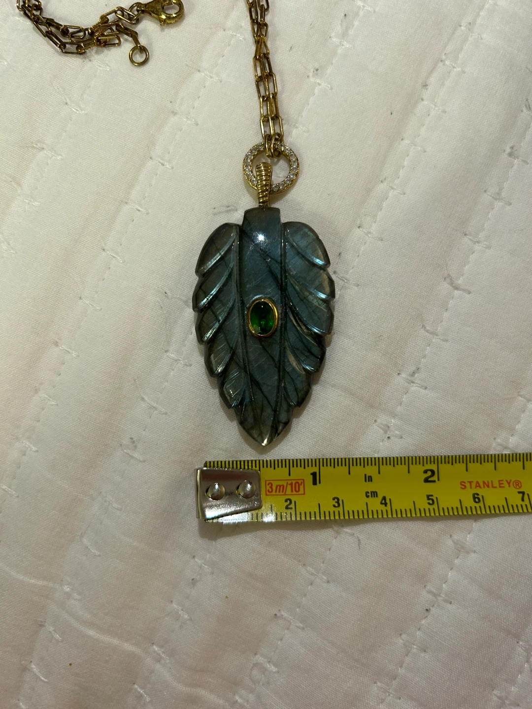 Beautifully carved labradorite pendant shaped like a leaf. Features a small, round green gemstone in the center. It's a lovely piece for everyday wear or special occasions! It has never been worn, but tarnished from storage. The 925 areas and chain shows some tarnishing. Please see all photos for details. Thanks!