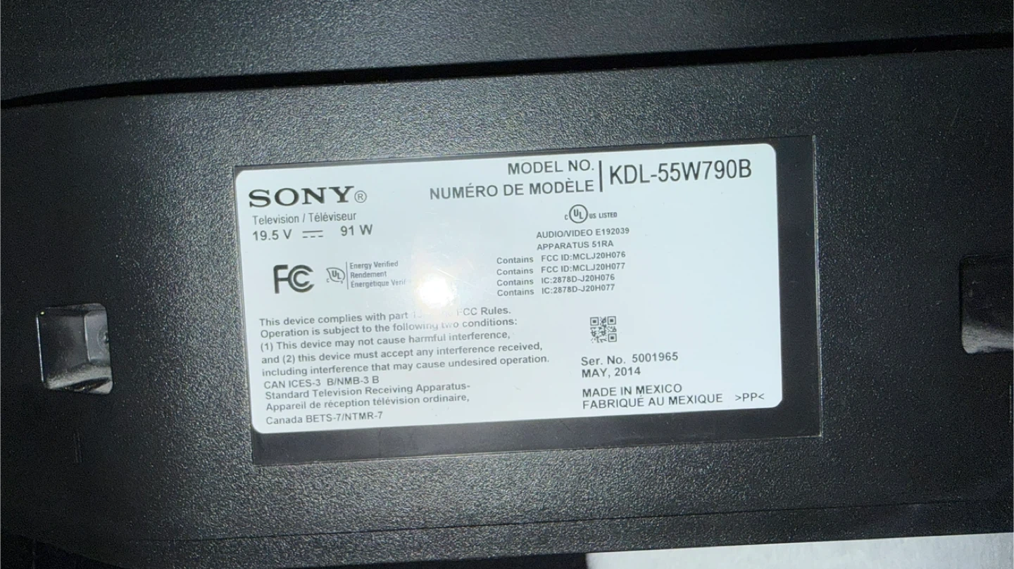 Selling a Sony Bravia 55" TV, model number KDL-55W790B. Also included is a USX Mount full-motion TV wall mount. The TV was manufactured in May 2014.