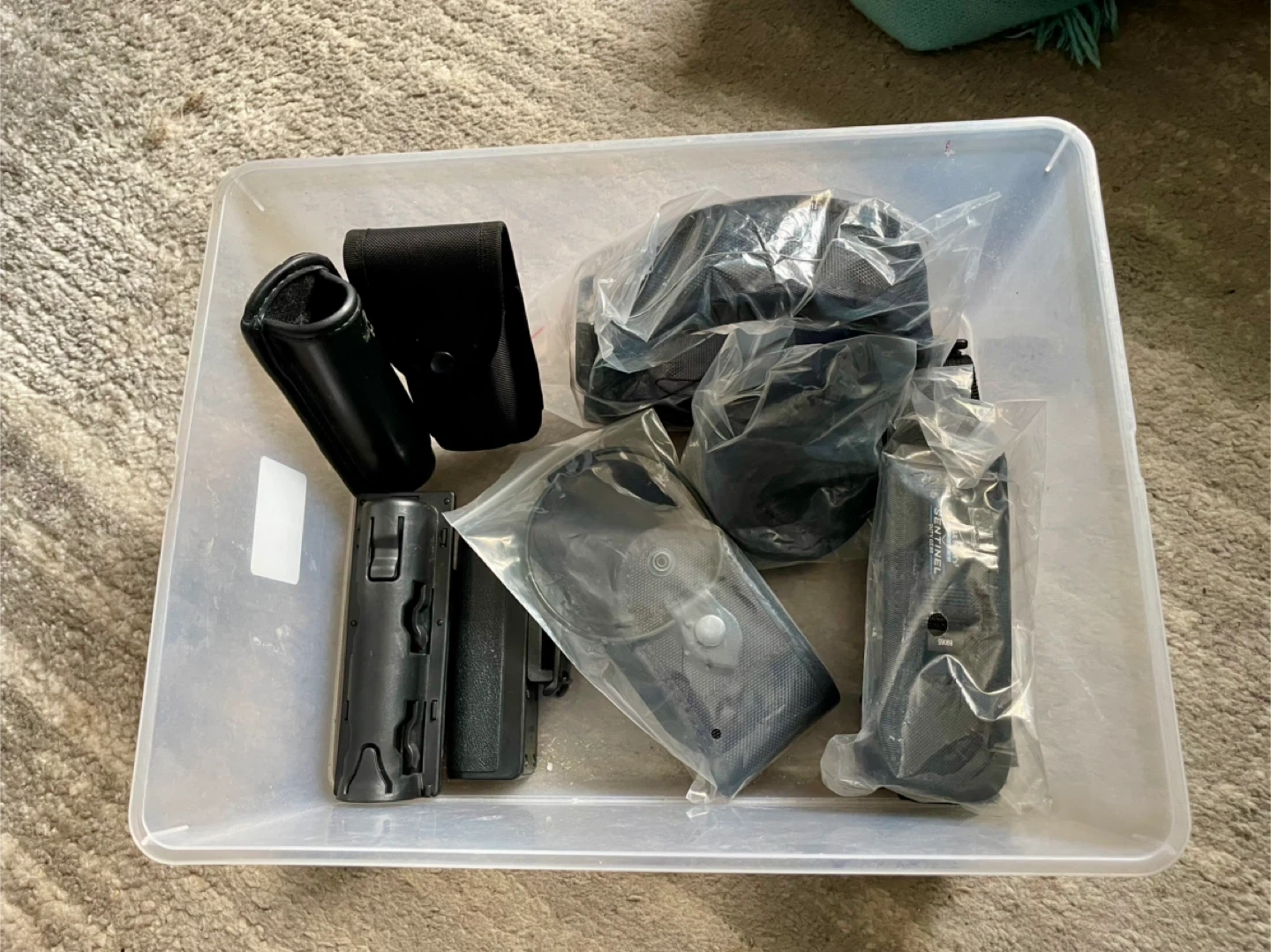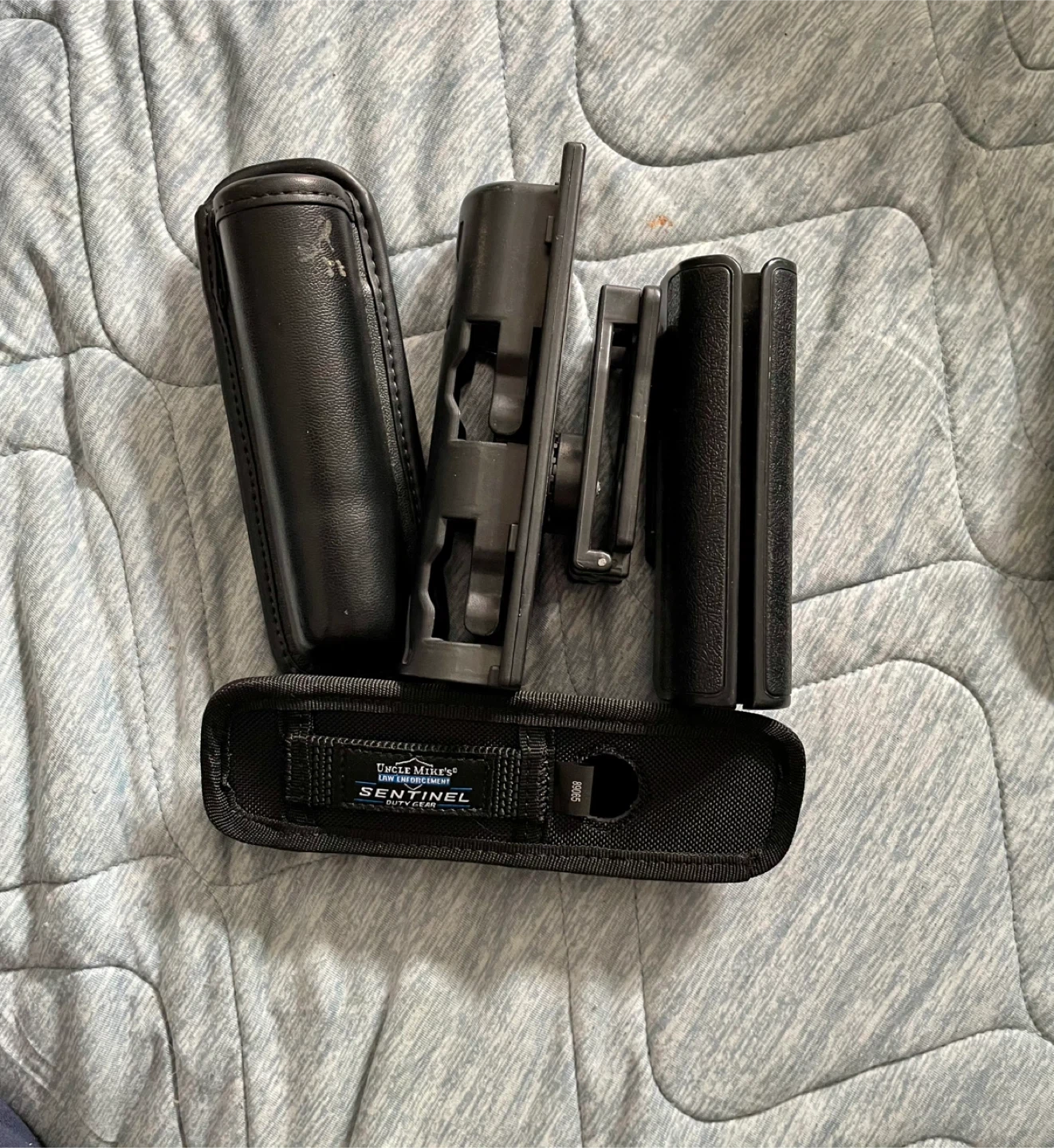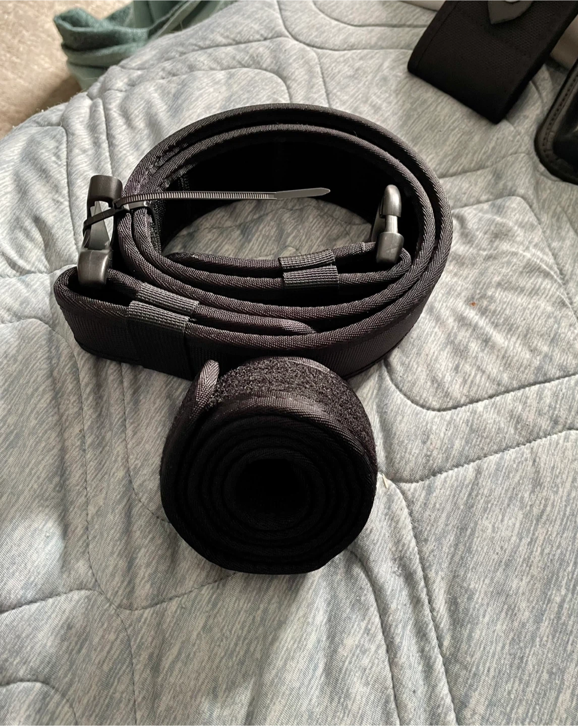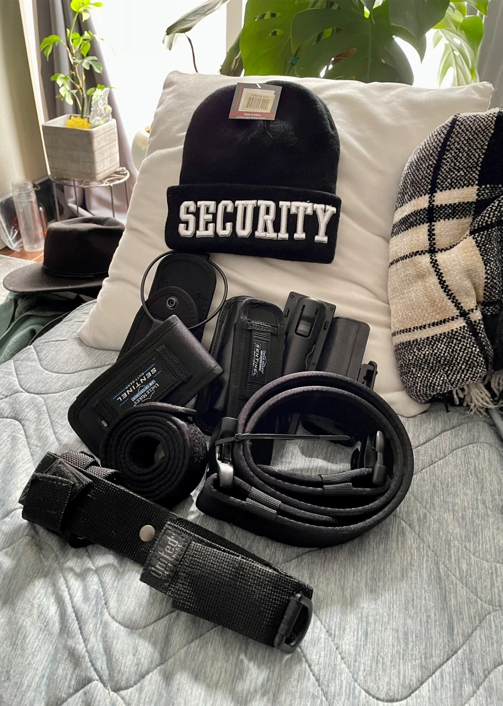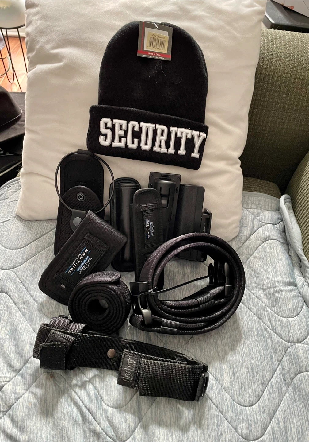 This set includes a black"SECURITY" toque. It also comes with various black nylon pouches ASPs a new size medium inner and outer duty belts. Holder for communication and a few more, suitable for security professionals. The belt and accessories are adjustable.