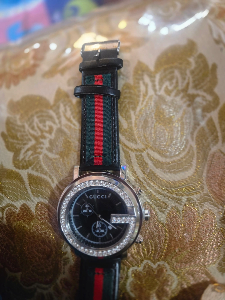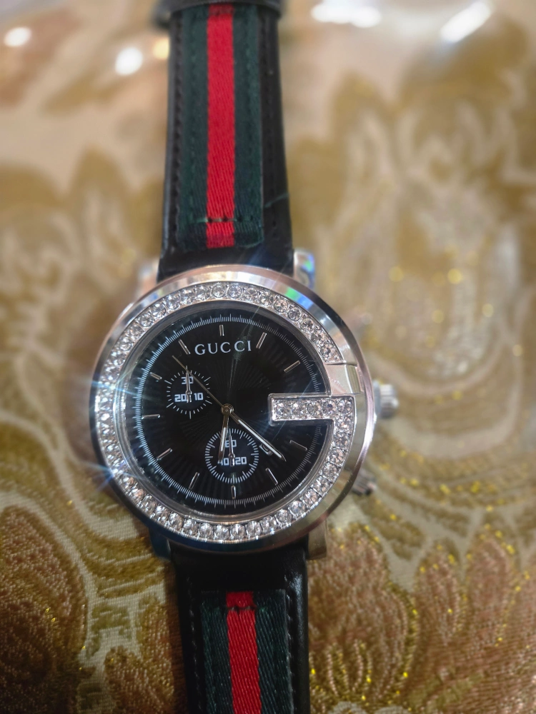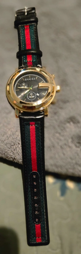 wristwatch with signature red-green stripe strap and gold-tone case. Features a black dial with sub-dial, gold hour markers, and the iconic Gucci logo.