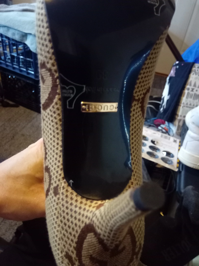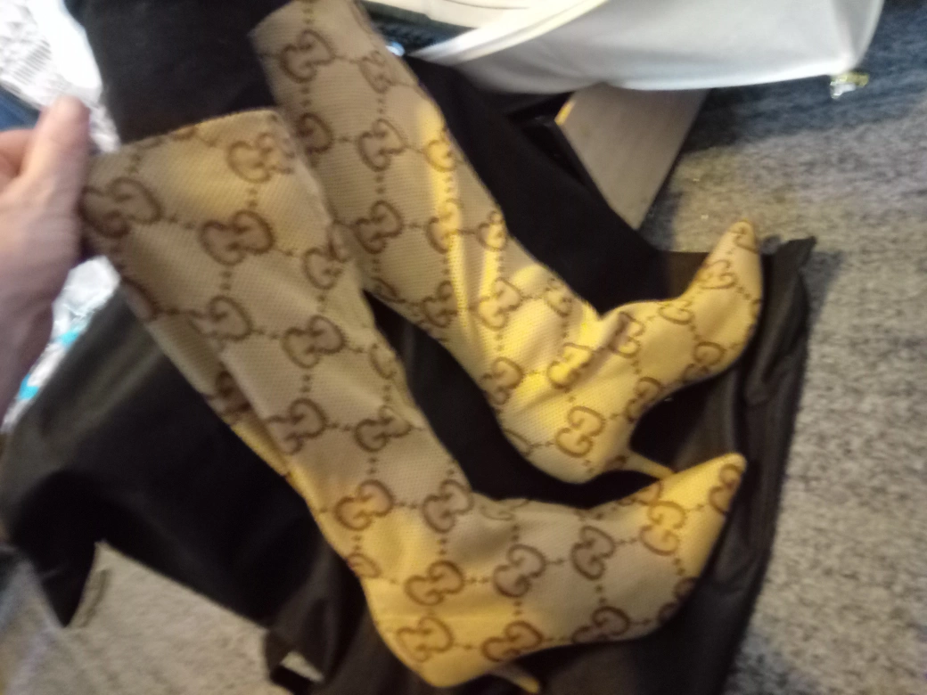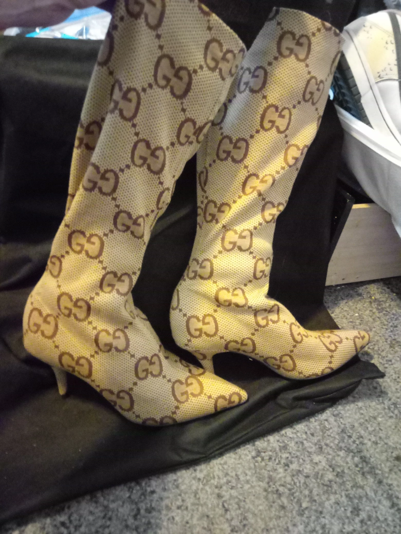 Selling a pair of Gucci knee-high boots in size 39. They feature the iconic Gucci logo pattern throughout. These boots are in good condition and ready for a new home!