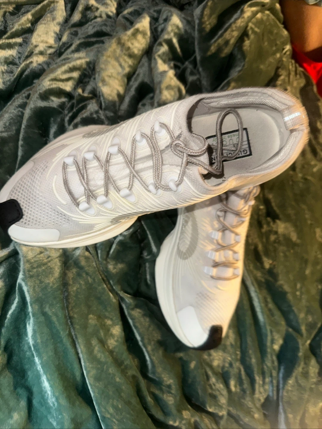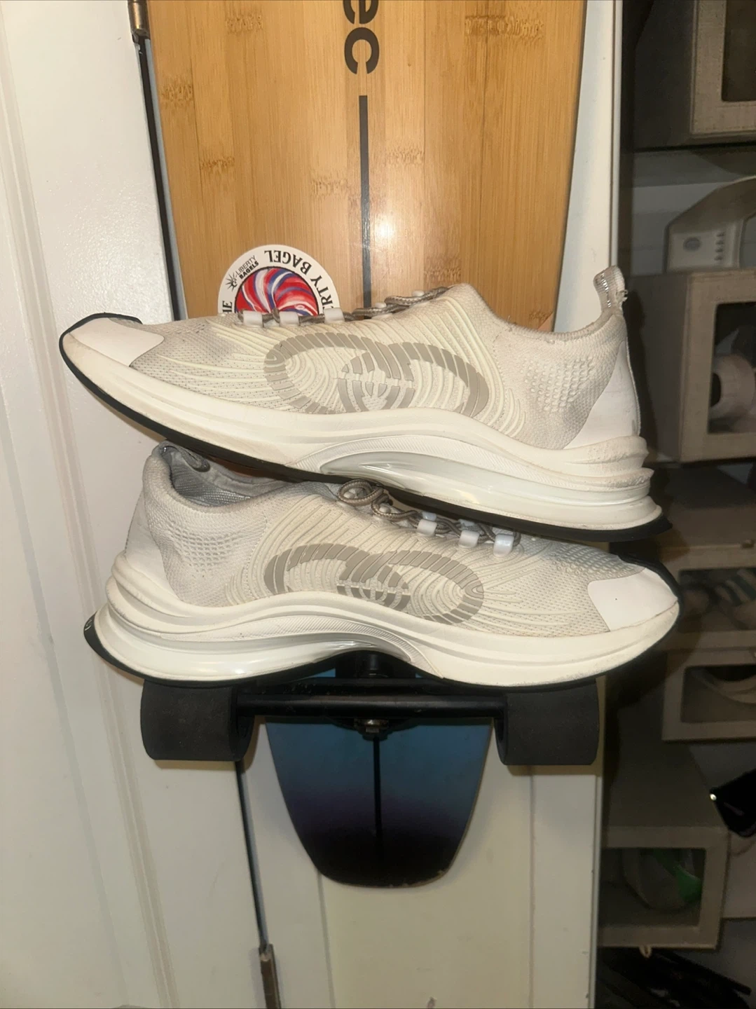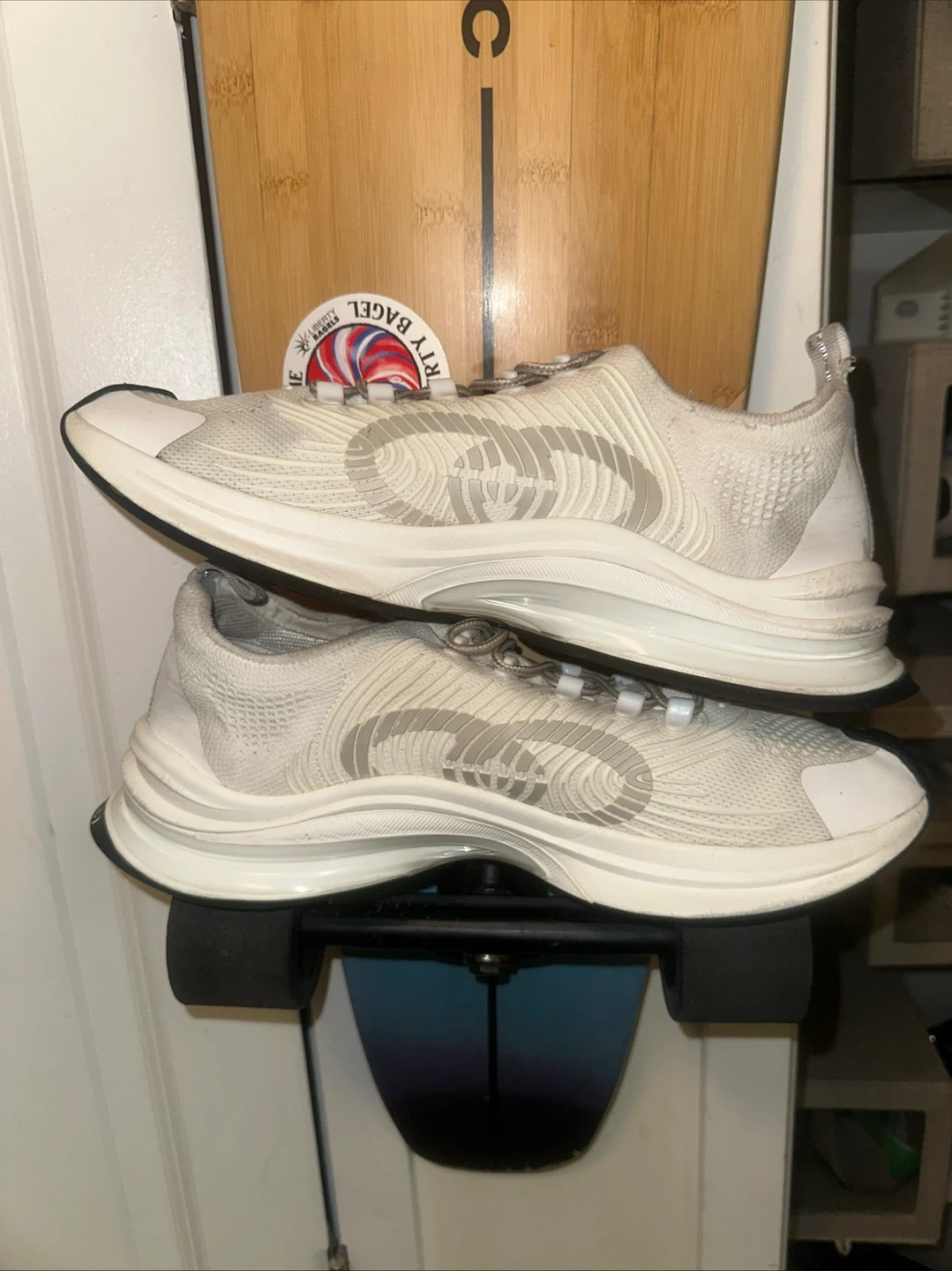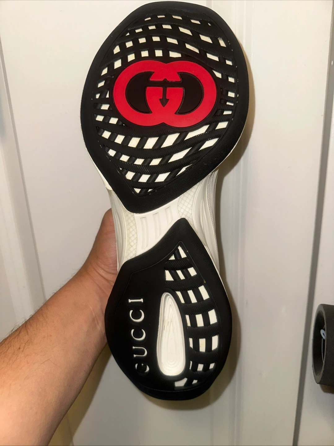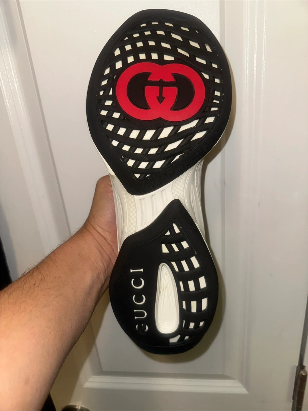 Selling a pair of Gucci Ultrapace R sneakers in a light color. They feature the iconic Gucci logo on the sole. These sneakers are in great condition and ready for a new home!