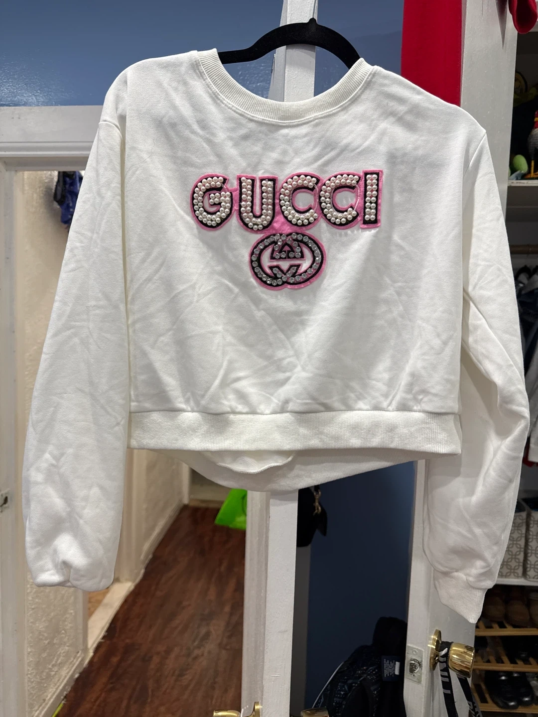 60Selling a white Gucci cropped sweatshirt. It features the Gucci logo with pearl and rhinestone embellishments. It's in great condition!