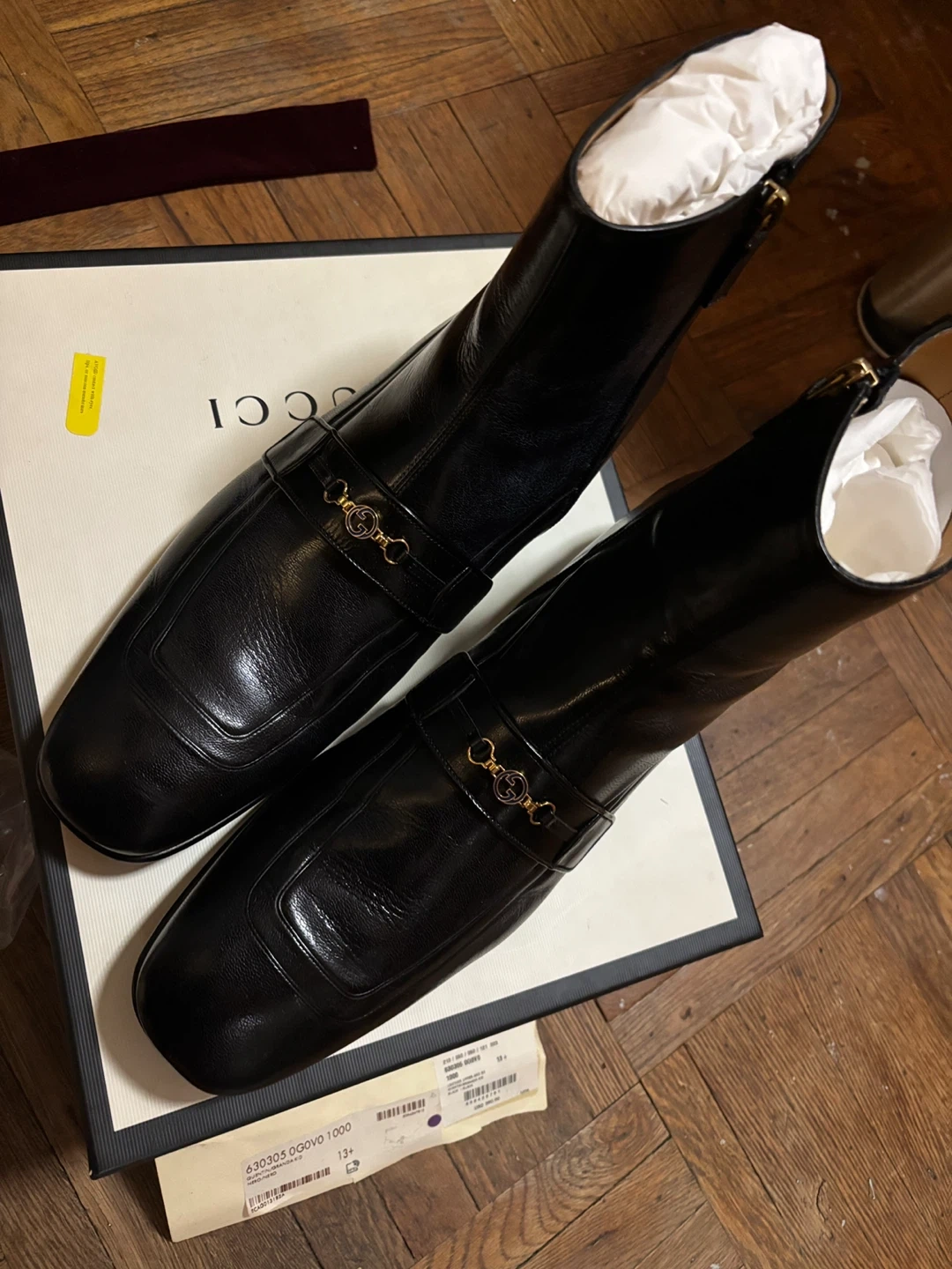 Selling a pair of Gucci men’s boots in black leather. These boots feature a stylish design with the iconic Gucci logo detail. They come with the original box.