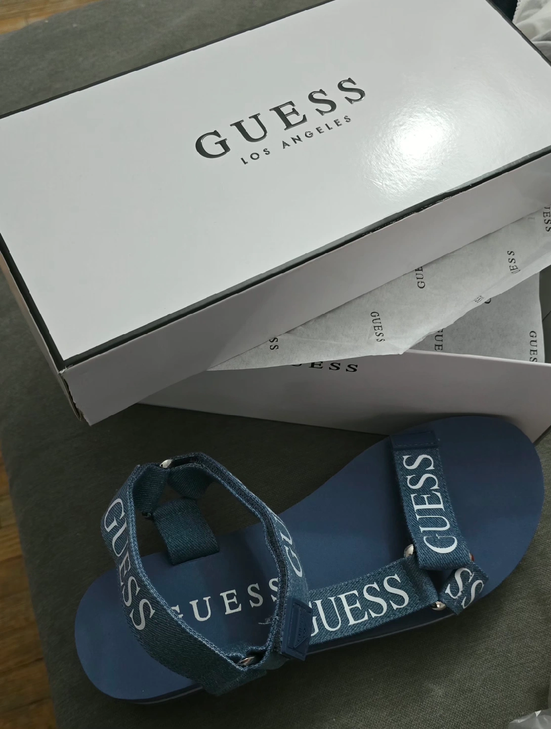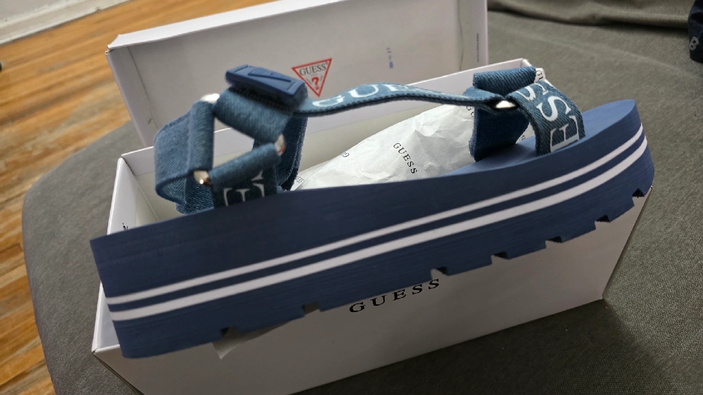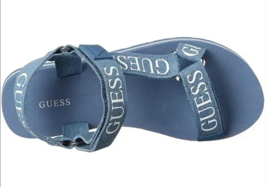 10These Guess sandals are a stylish addition to any wardrobe! They feature a blue denim look with the Guess logo prominently displayed on the straps. They are a women's size 9.5 and come with the original box. New never used