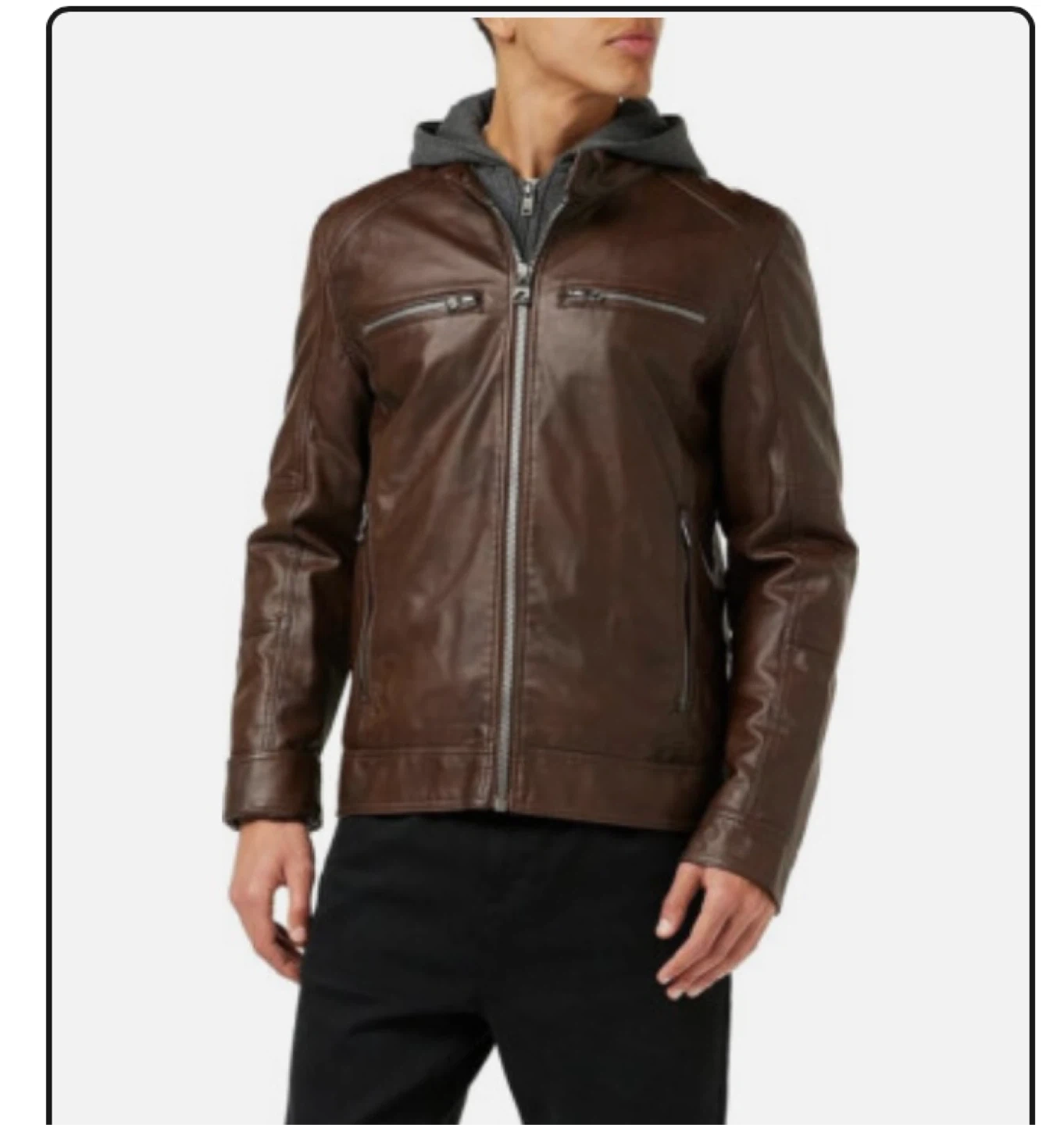 10Selling a Guess faux leather jacket in brown, size medium. This stylish jacket features a faux leather exterior and a comfortable gray hoodie insert. It has a zip-up front with additional zipper pockets on the chest. Perfect for adding a touch of cool to any outfit!