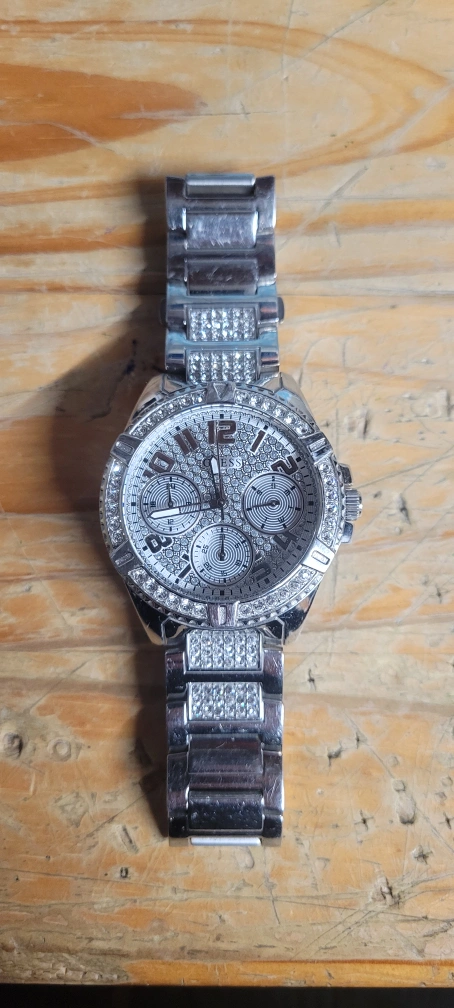 108Silver color watch with crystal accents. Chronograph style with white face.