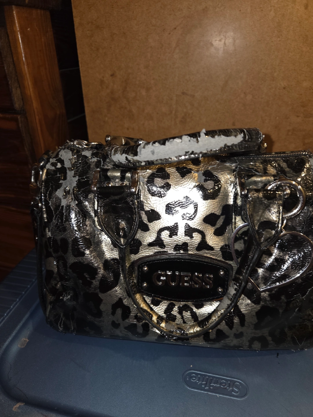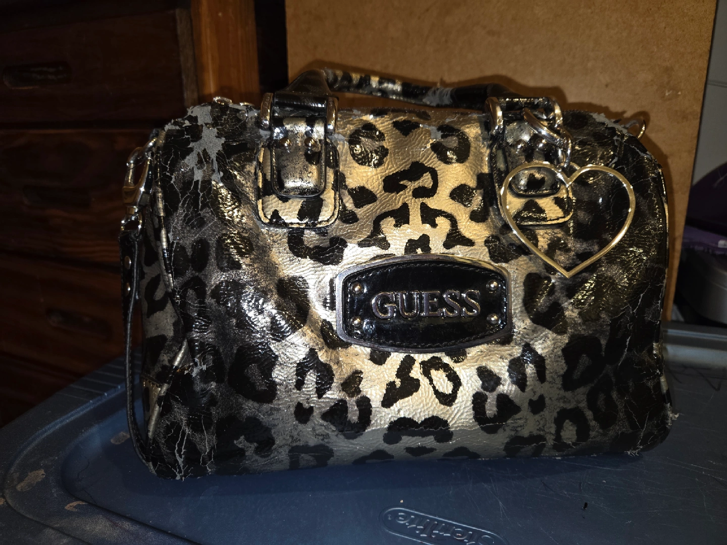 Selling a Guess handbag with a leopard print design. It has a heart charm. Please see the photos for condition