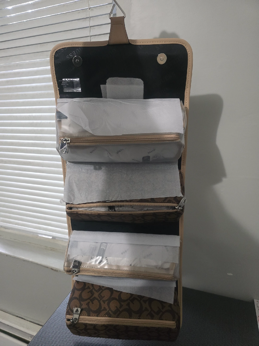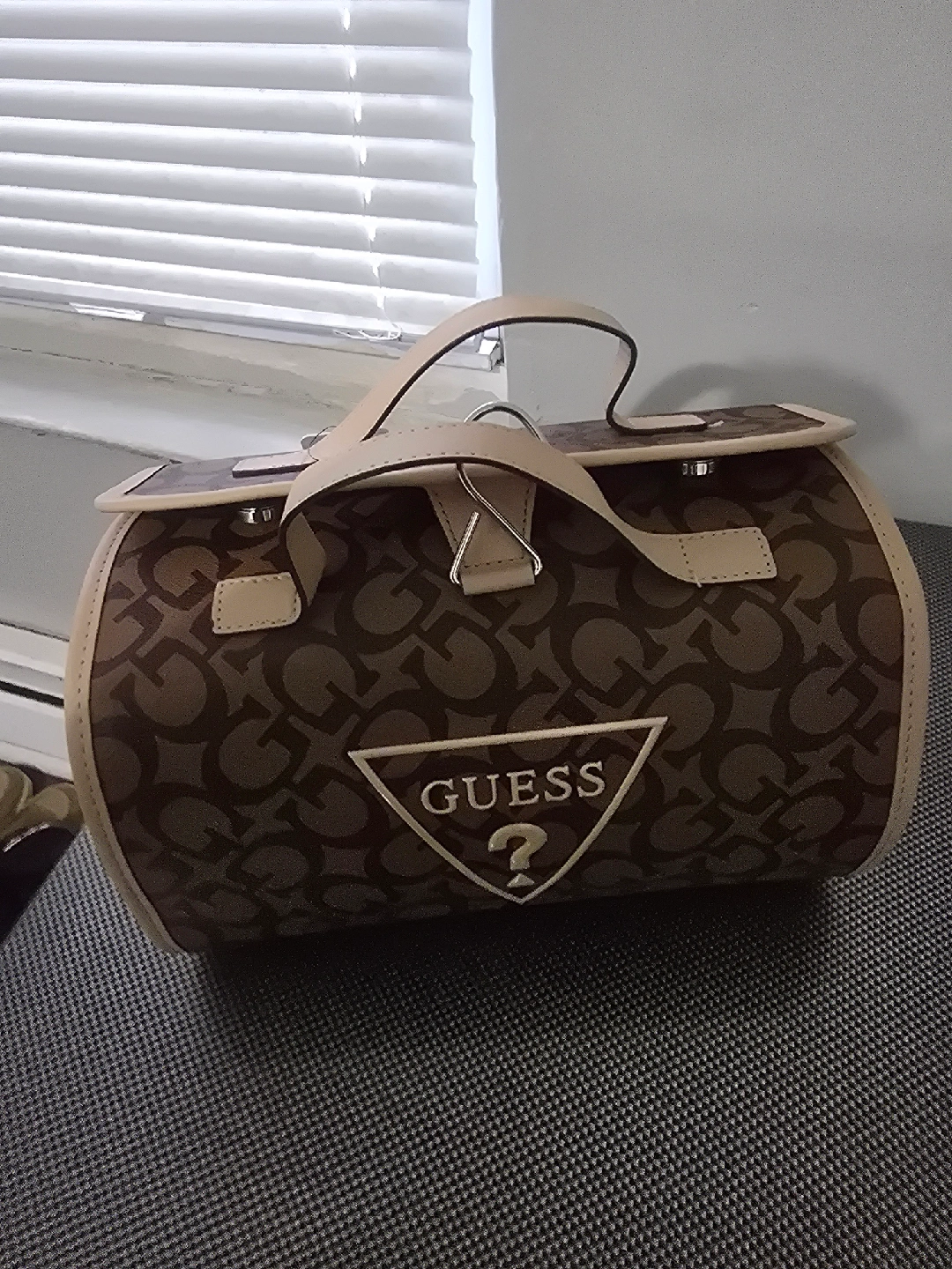 10I'm selling a brand new Guess travel toiletry bag with tags still attached! It features the classic Guess logo pattern in brown and beige. Perfect for keeping your toiletries organized on the go!