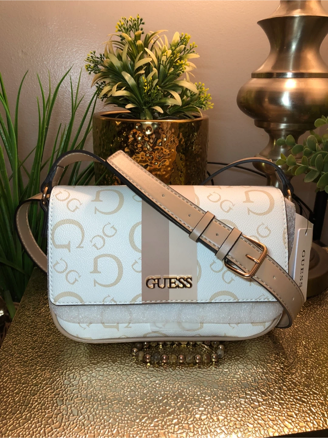 37Brand new Guess shoulder bag in white with tags still attached! This stylish bag features the Guess logo pattern and a beige strap. Perfect for adding a touch of elegance to any outfit