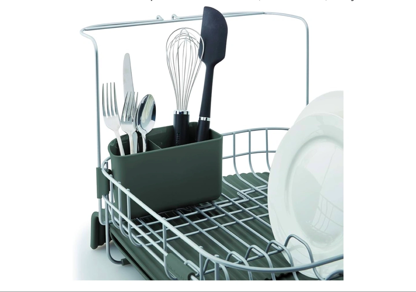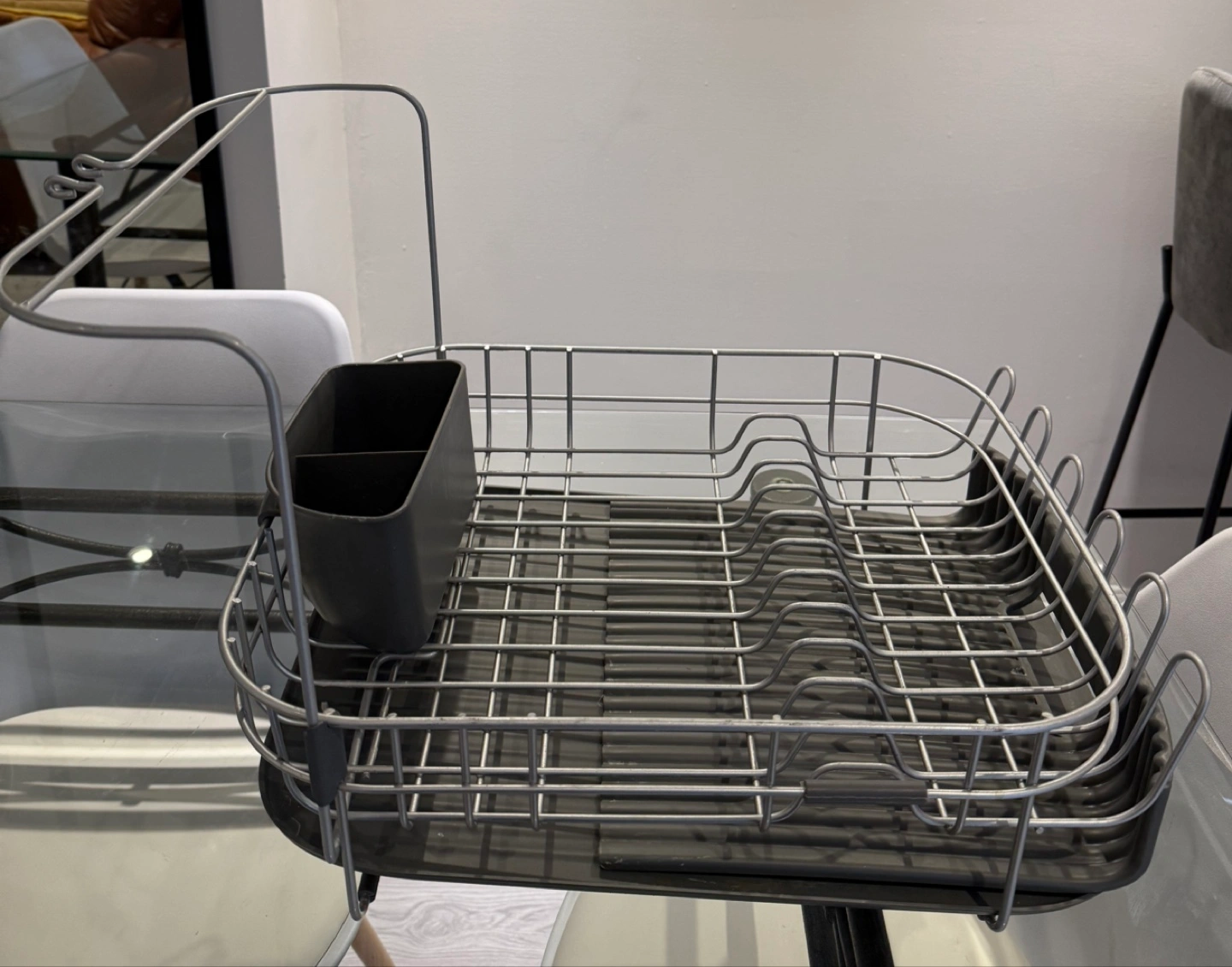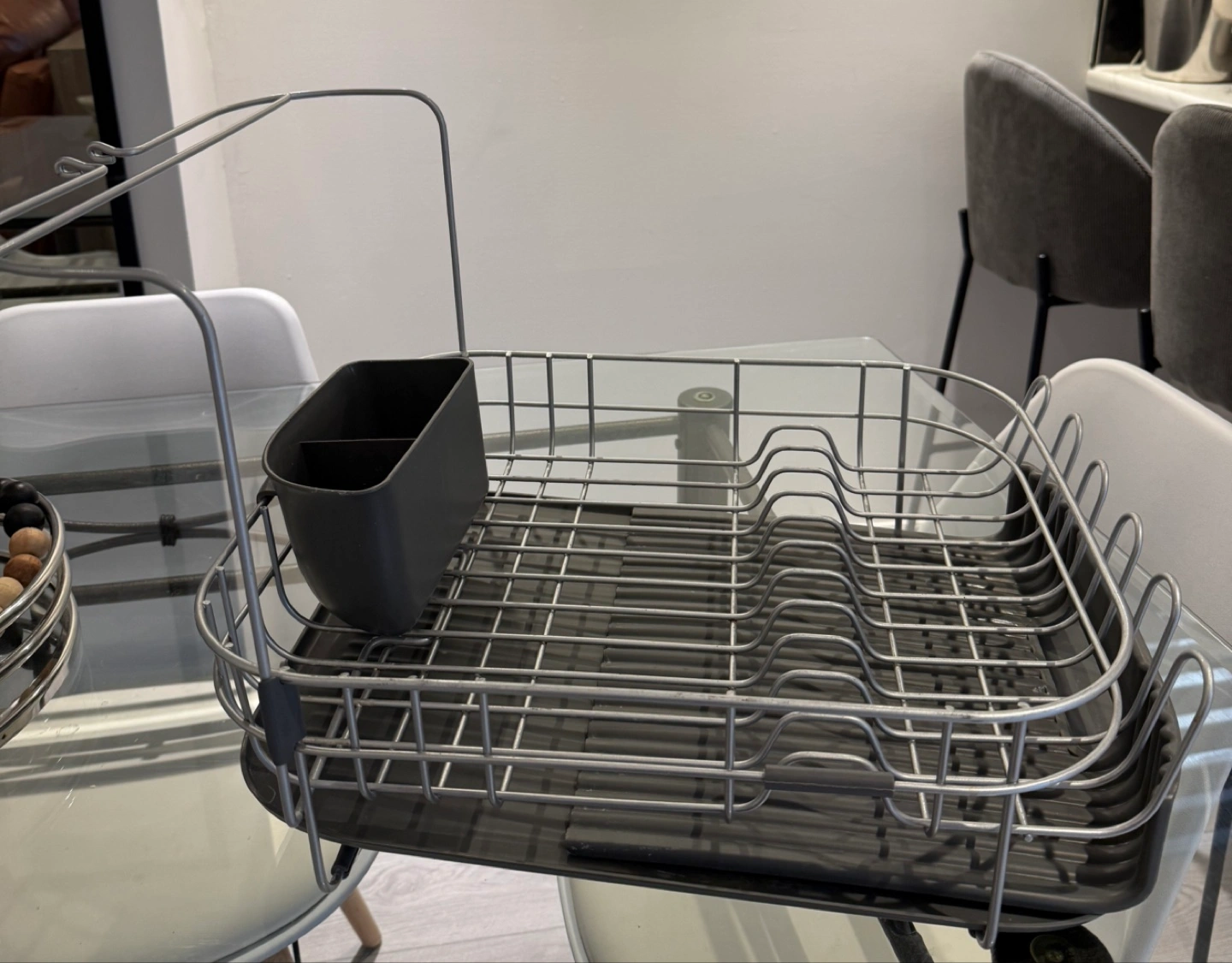Grey expandable dish rack. Features a wire frame and a plastic draining board. Includes a small utensil holder.