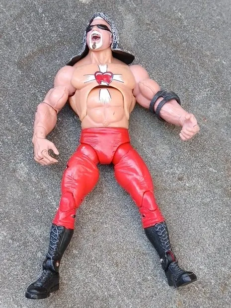 This action figure is wearing red pants and black boots. It has a silver chain-like headpiece and black arm bands. The chest has a red heart with wings design. It's a collectible toy.