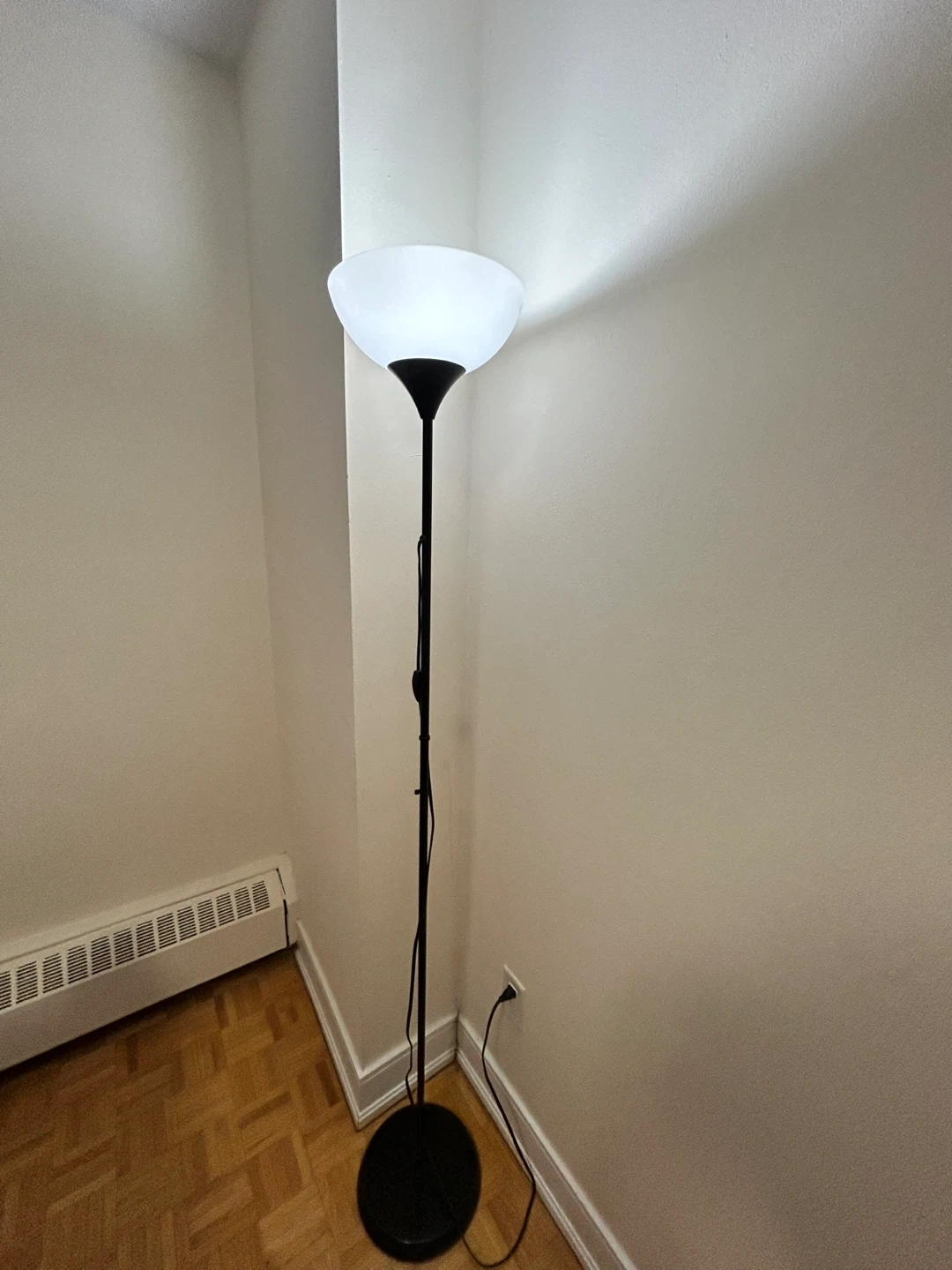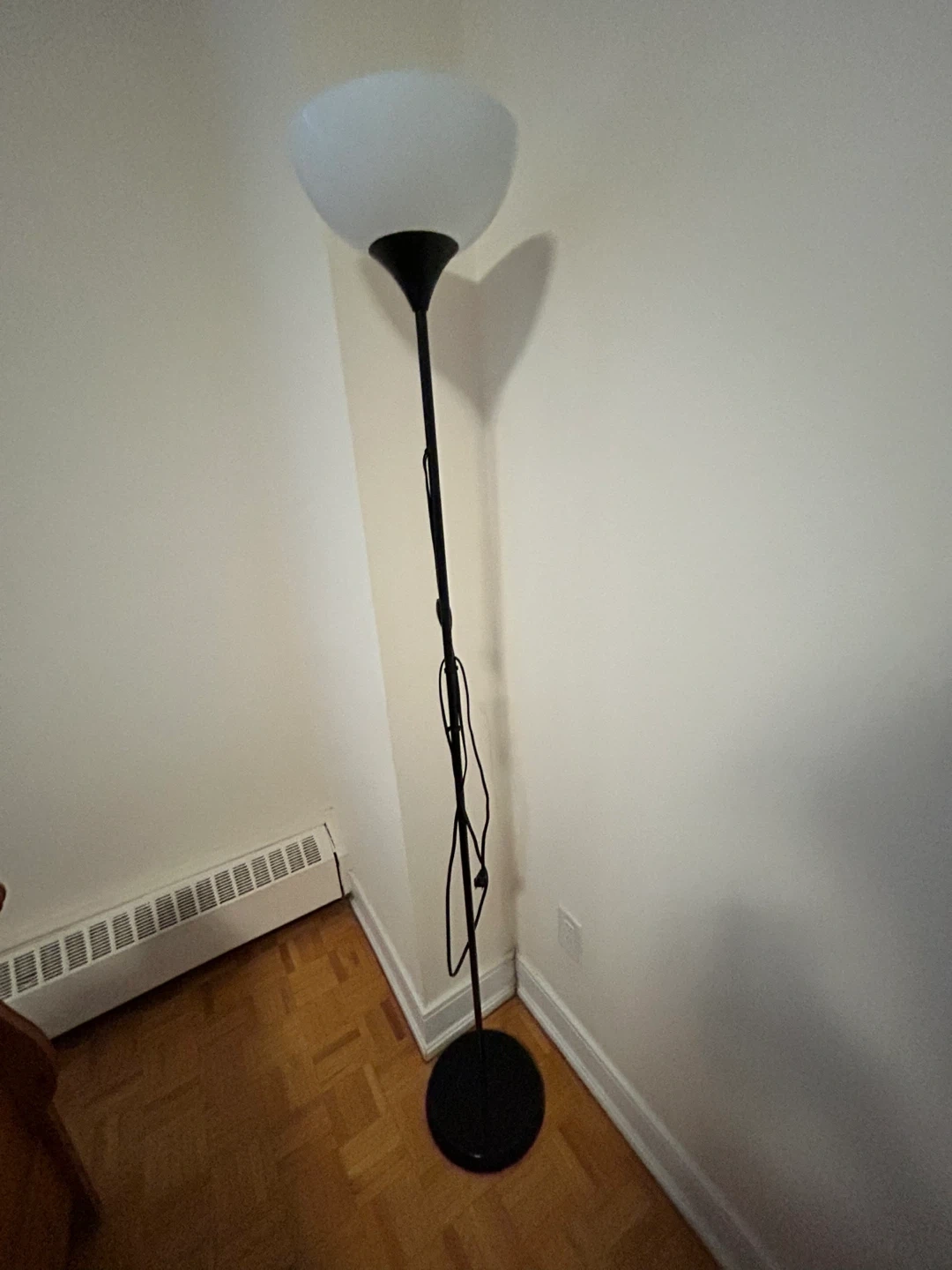 This is a IKEA black floor lamp with a white shade. It uses a standard bulb. The lamp has a sturdy base. Comes with the bulb