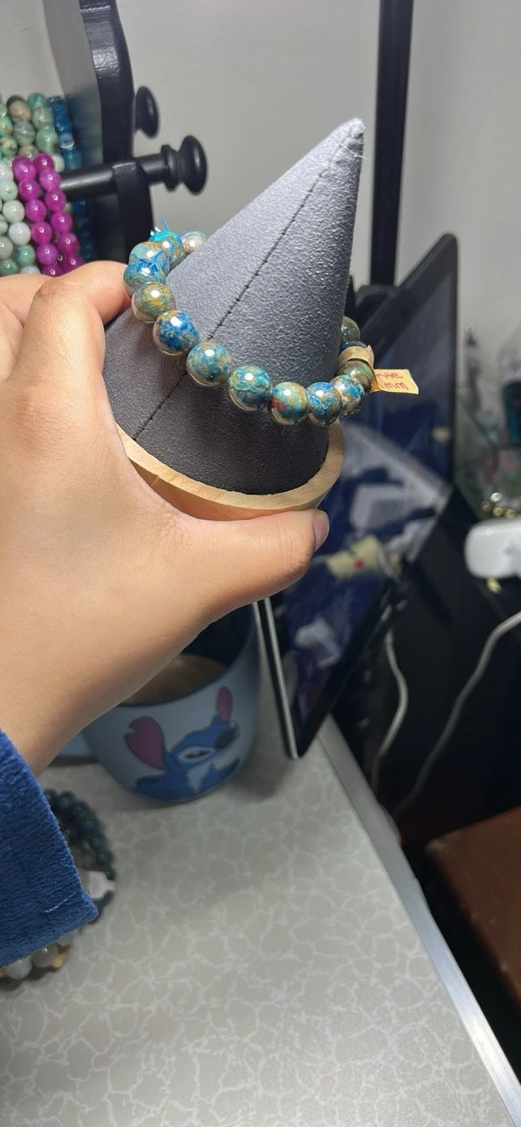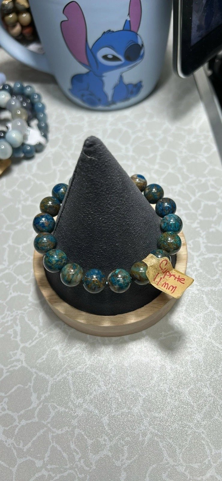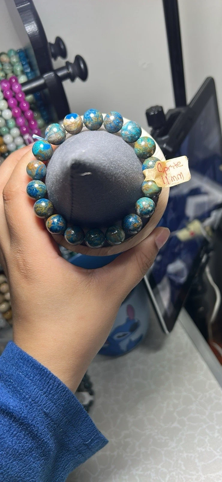 New with tags. This is a handcrafted beaded bracelet featuring round Chrysocolla stones in blue and brown. It's adjustable and suitable for unisex adults. The style is beaded with a nature and healing theme.